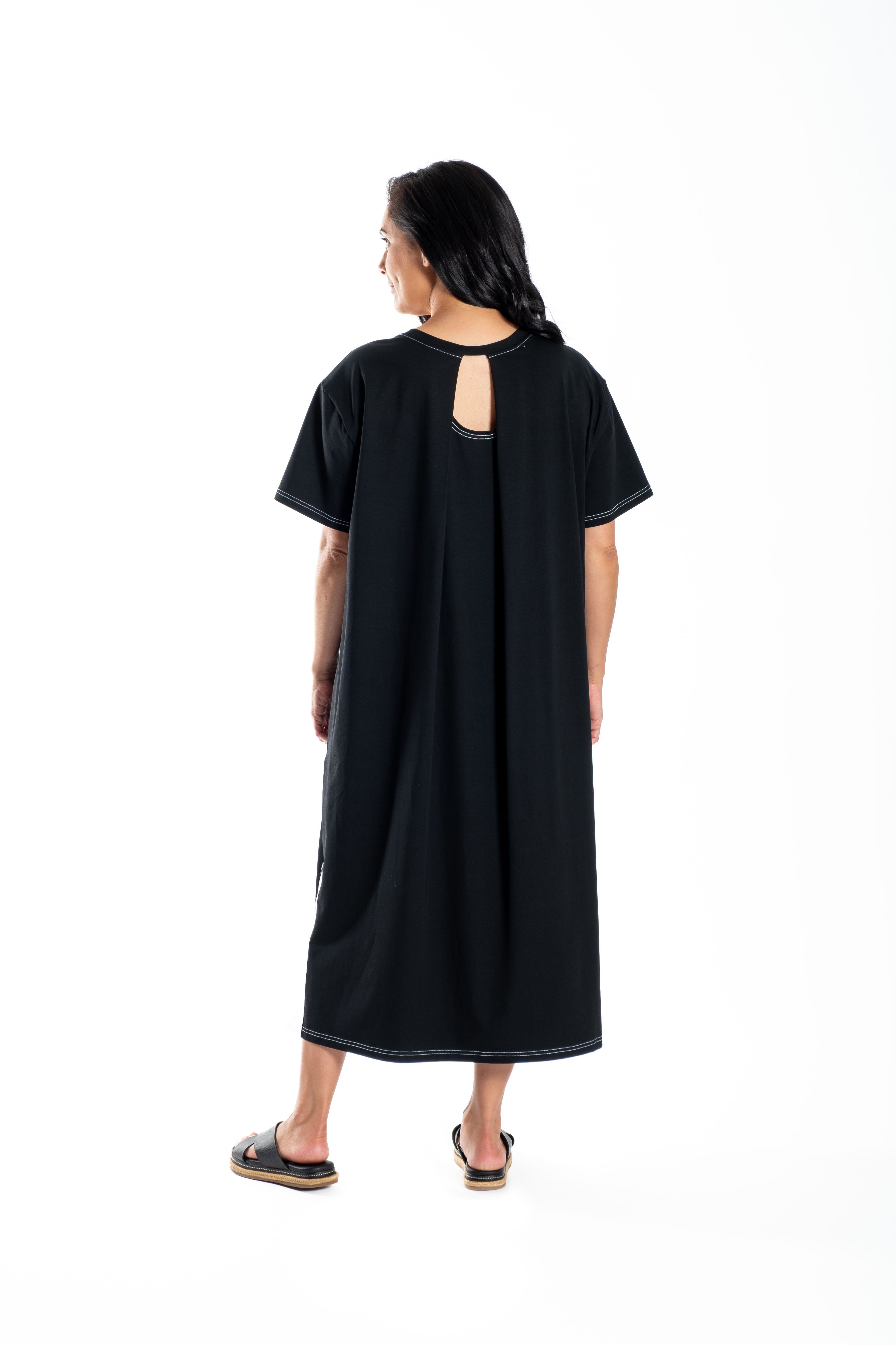 Take casual dressing to the next level with Deeanne Hobbs Zefer Dress. Crafted in a comfortable cotton knit with stretch, this dress sports a relaxed fit with a flared silhouette. Please see the back for details of the flattering pleat over a featuring hole (which does not show you bra strap.) It has an ultra-cool vibe and we know it is going to fly out the door so get in quick!