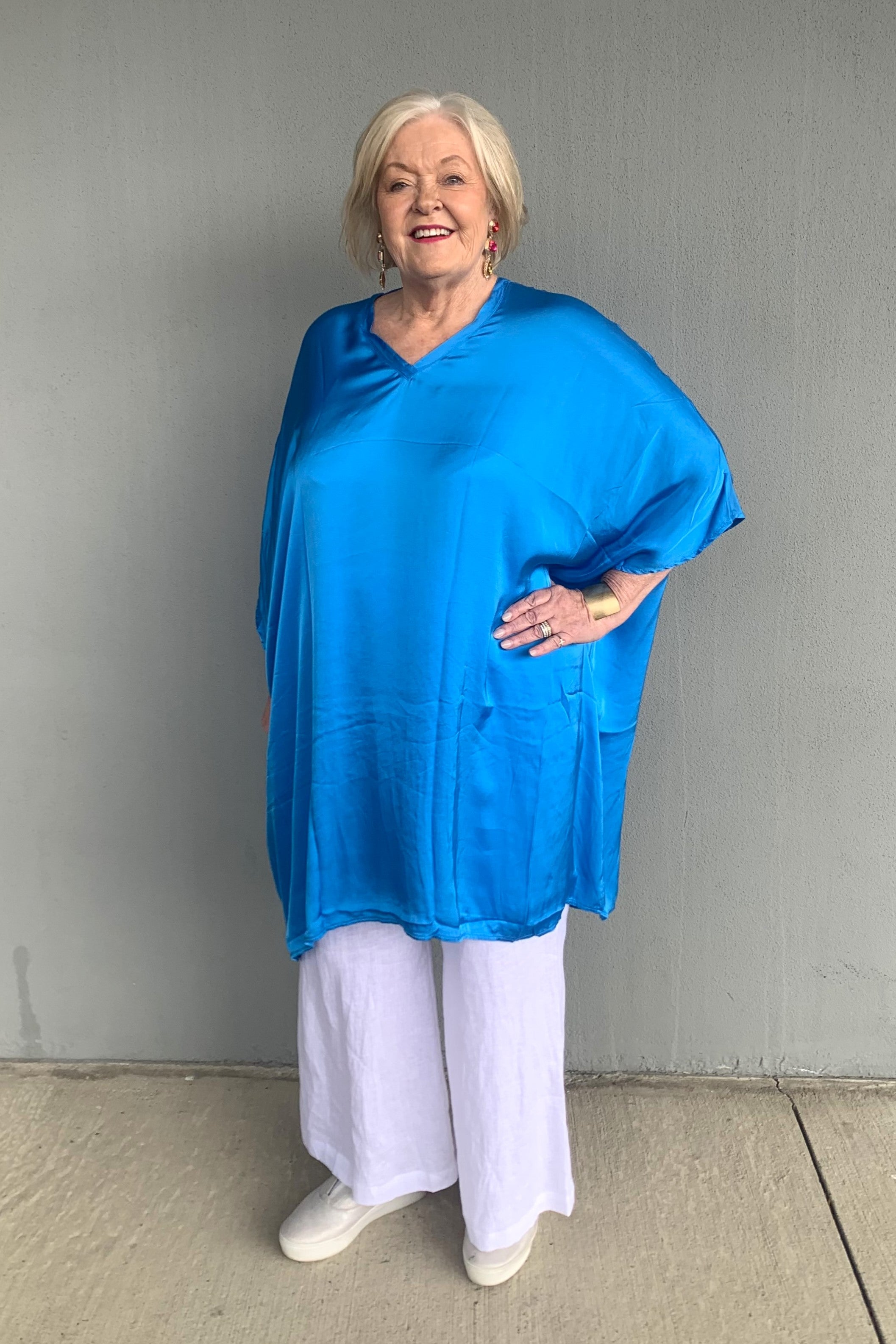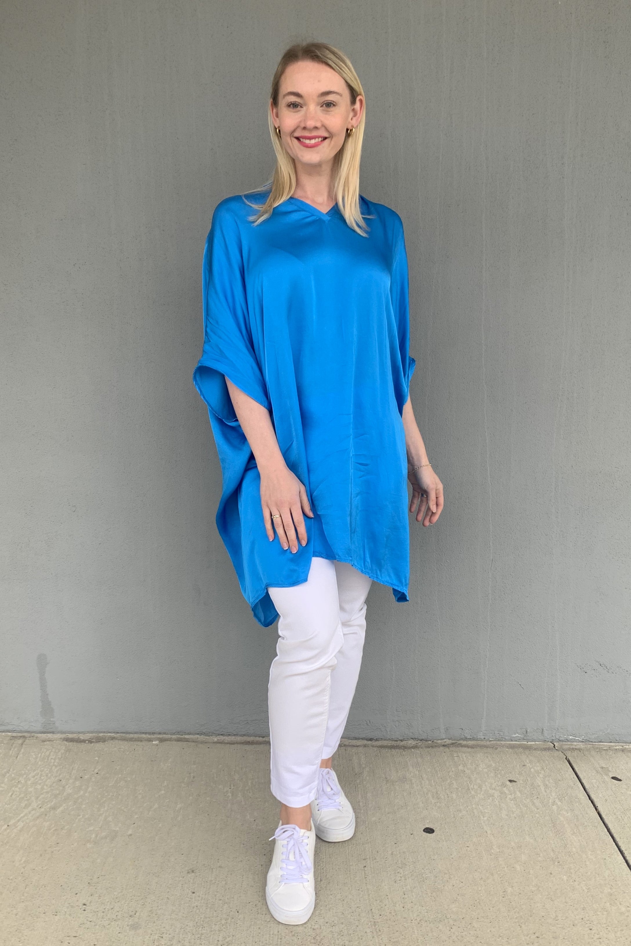The FRNCH Satin Tie Tunic is stunning in its Electric Blue colourway! Perfect for warmer days, this piece can be worn as a long tunic or dress. Featuring a tie at the back, this style is loose and floats effortlessly over the body.