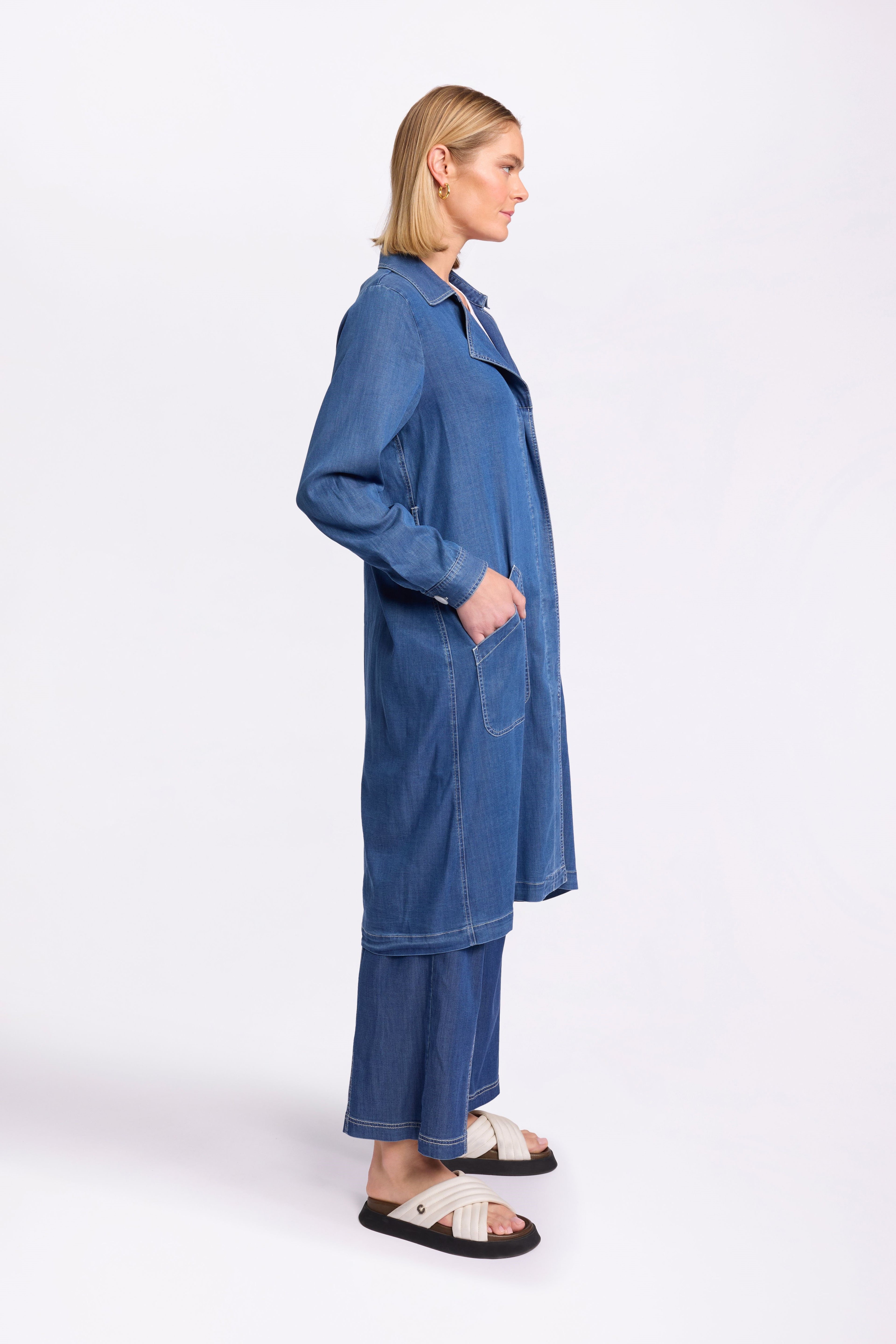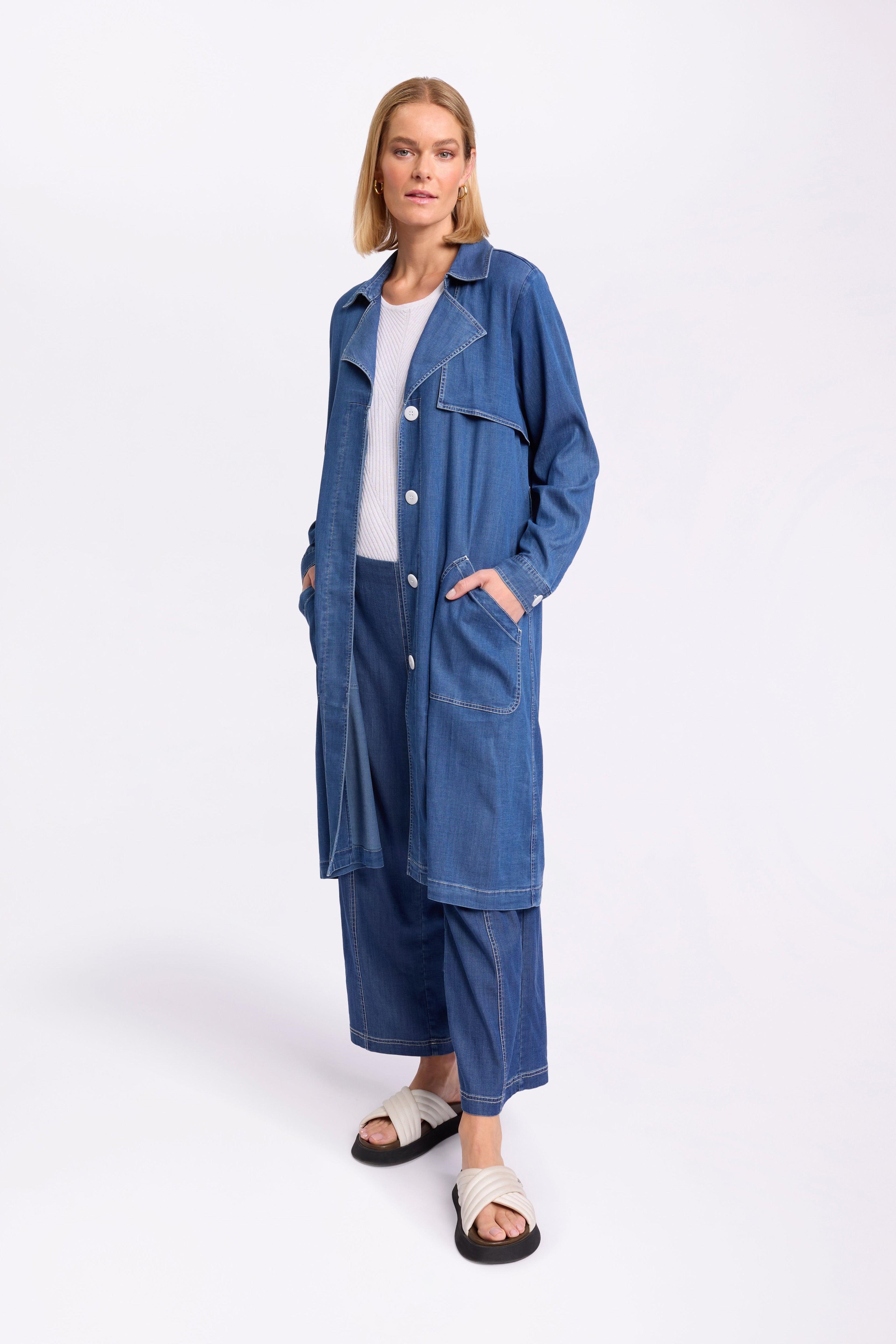 Presenting the Denim Trench from Marco Polo! A timeless design featuring contrast stitching and dramatic collar. This trench is perfect for layering over any ensemble, offering contemporary versatility for a sleek and sophisticated look.