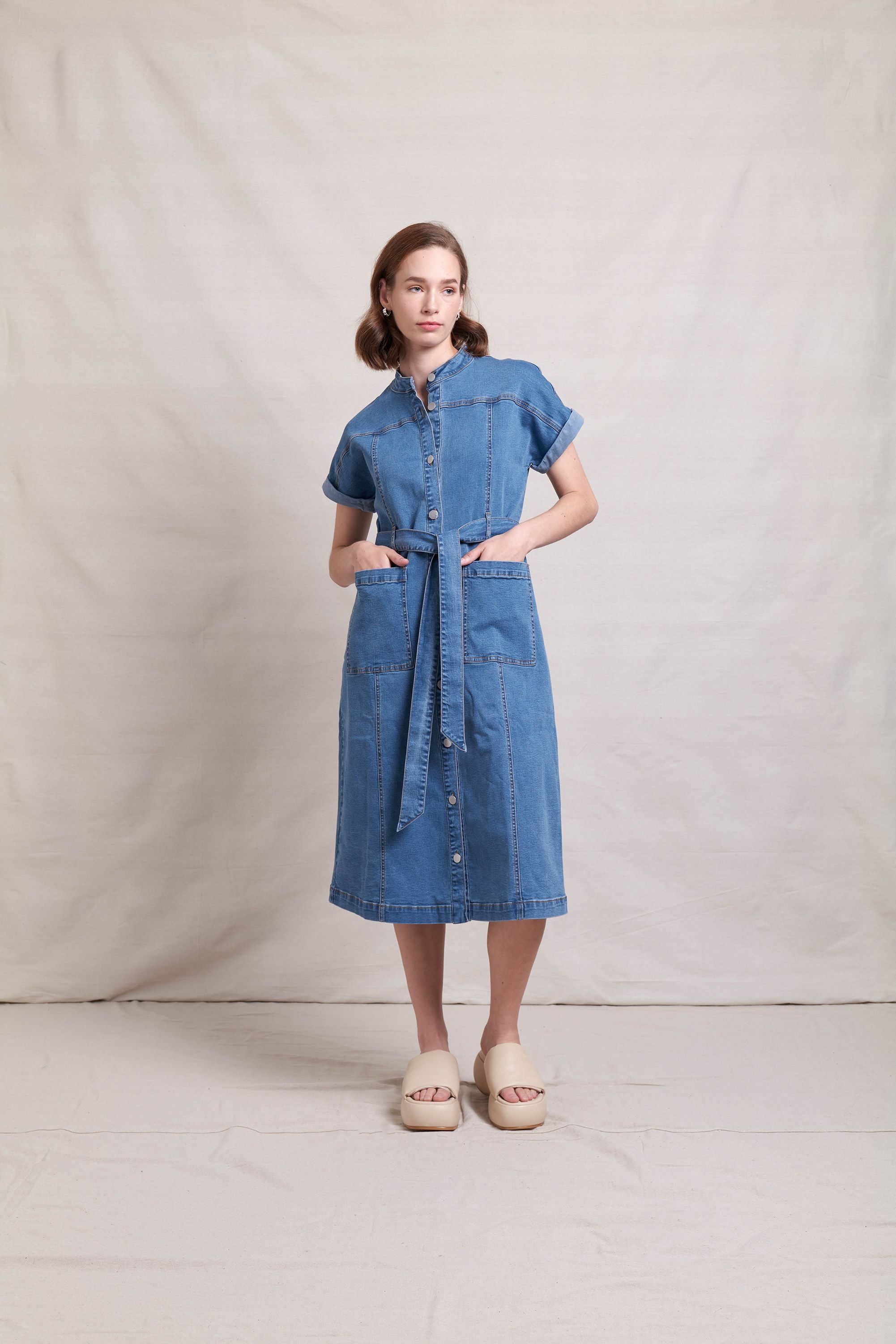 The On A Roll Dress by Neris is made from a super soft stretch denim. It buttons down the front and has capped sleeves and panels throughout the dress. Pair with a pair of white sneakers for a chic off-duty look, or dress it up with your favorite boots - the styling options are endless!