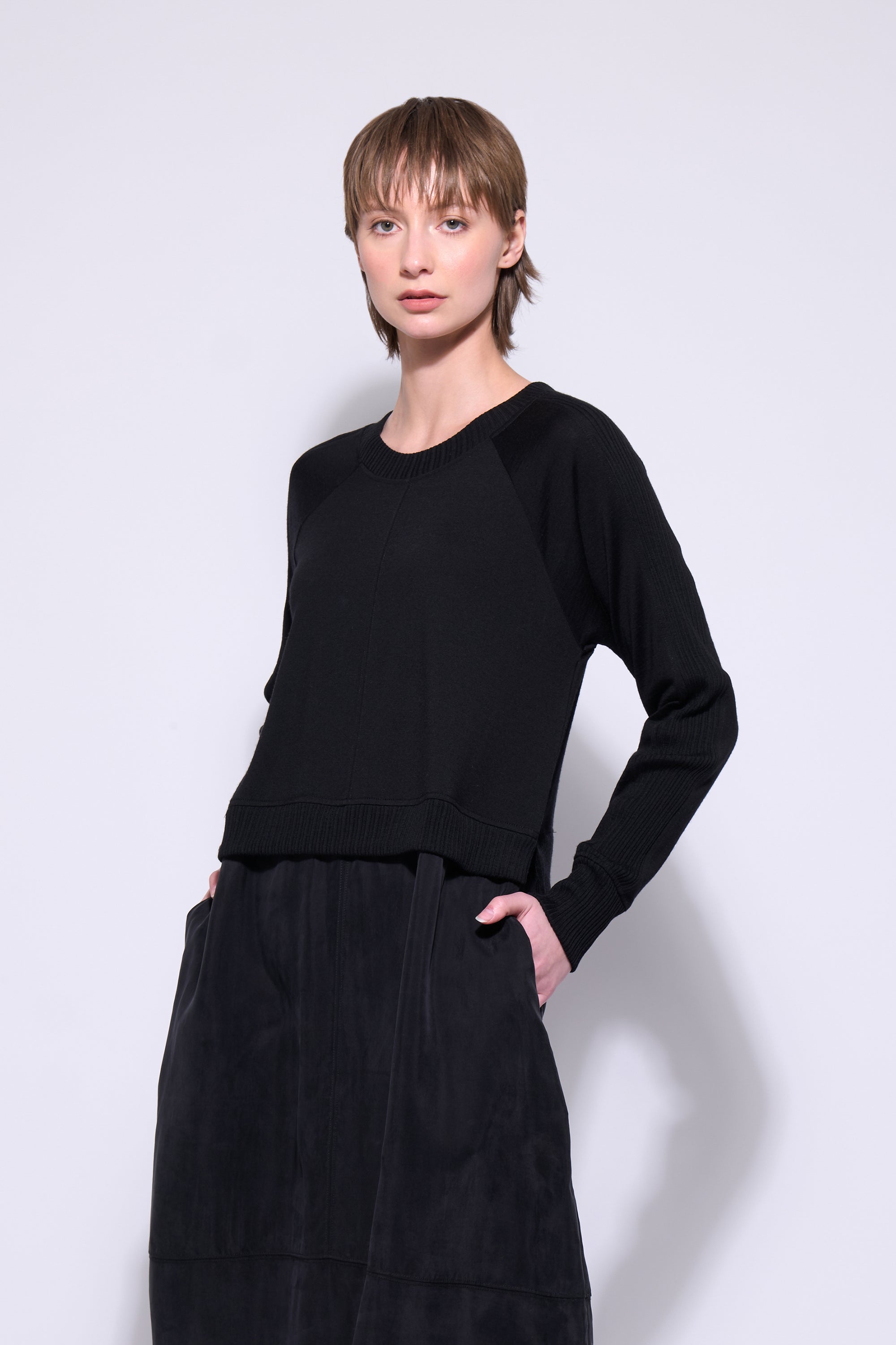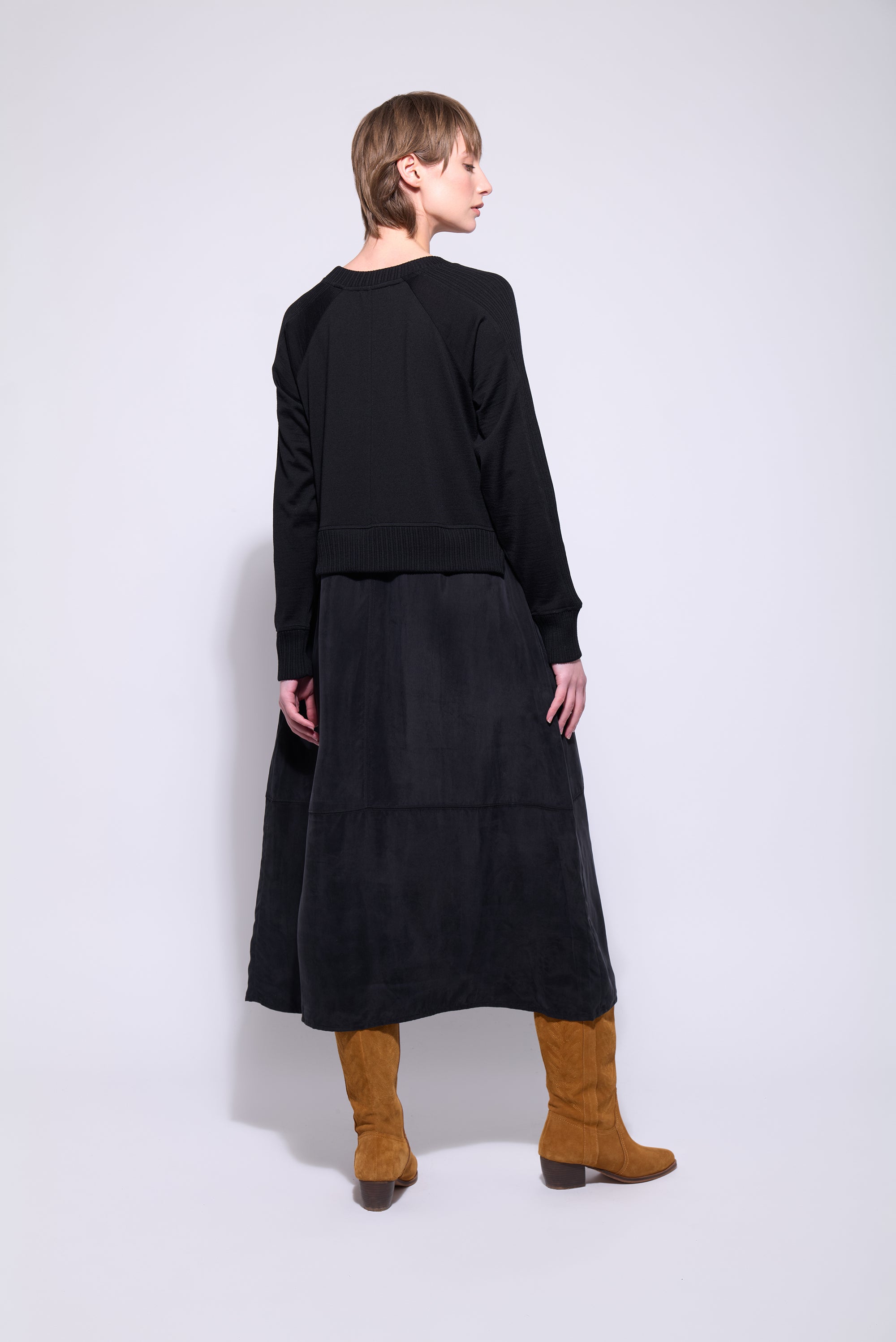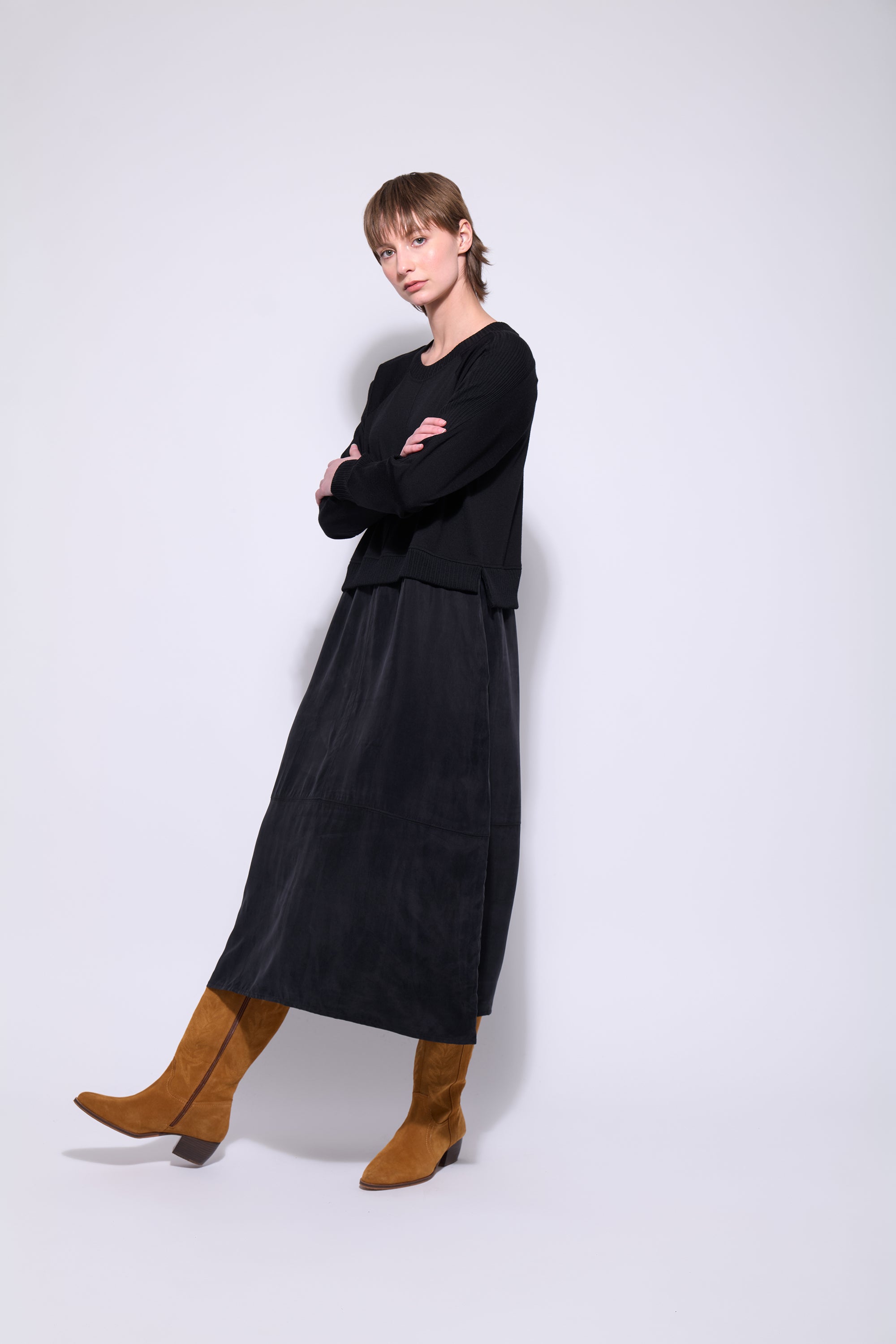 The Mix It Up Dress by Neris is a maxi dress crafted from 100% Merino wool and cupro skirt. Ideal for winter wear featuring a relaxed long sleeve top, it offers ultimate comfort and warmth. Perfect for layering during colder months.