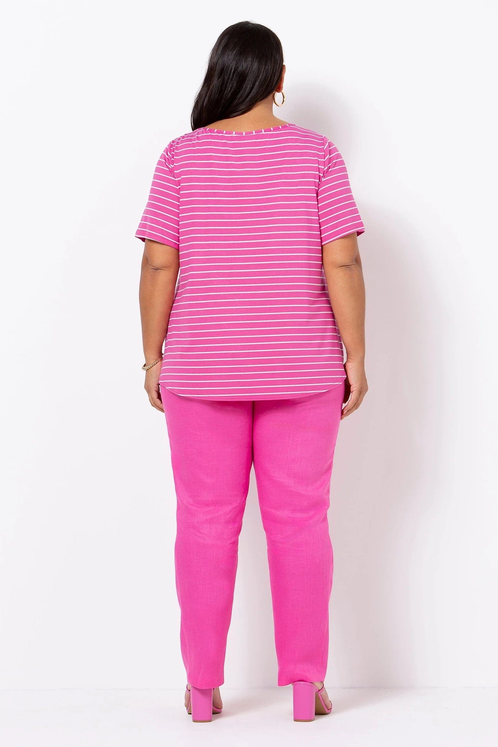 Swish’s Famous Stripe Tee returns in two fabulous designs for summer! Cut in a soft handle stripe viscose, this fit and flare design offers ease through the hip and tummy with an elbow length sleeve.