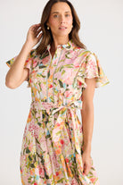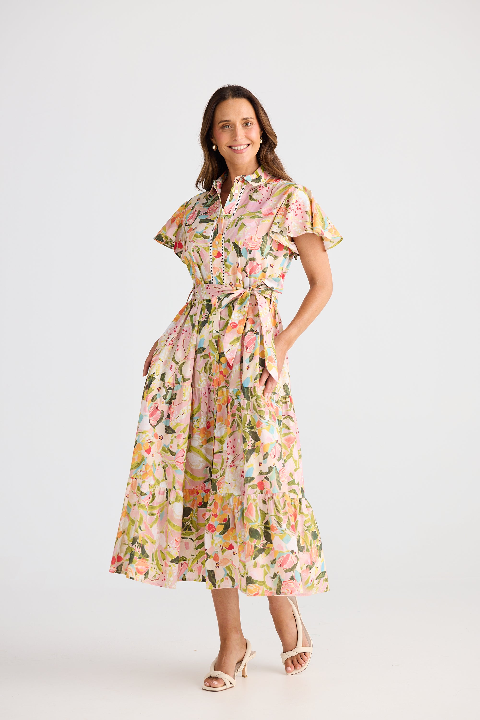 Brave and True's Alice Short Sleeve Dress in Zoe’s Garden bursts into bloom as a floral midi dress you’ll reach for again and again. A classic shirt collar and front-button stand give it a sense of refined ease, while the tiered skirt adds gentle movement and a cheerful rhythm to your step. With short sleeves and clever side-seam pockets, this short sleeve floral dress balances everyday practicality with standout style. Pair it with loafers and a denim jacket for brunch with friends, or wear it as a Zoe’s Garden dress for garden parties, summer weddings, or drinks with friends. Joyful, effortless, and undeniably stylish, it’s a wardrobe favourite for any occasion.