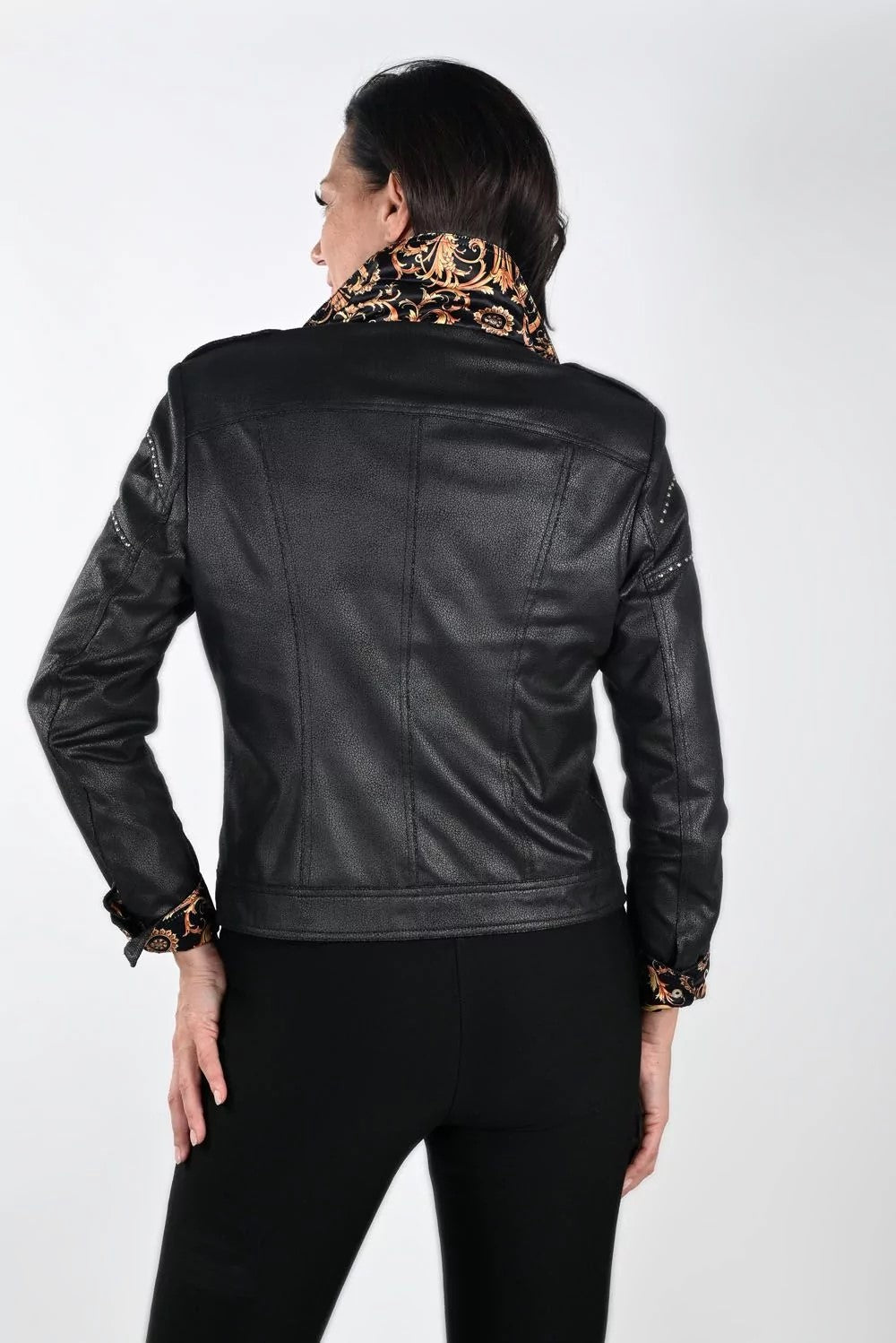 The Knit Jacket by Frank Lyman is edgy and beautifully crafted. Featuring silver embellishments and contrasting patterned cuff and lining, this style is perfect to liven up your look!