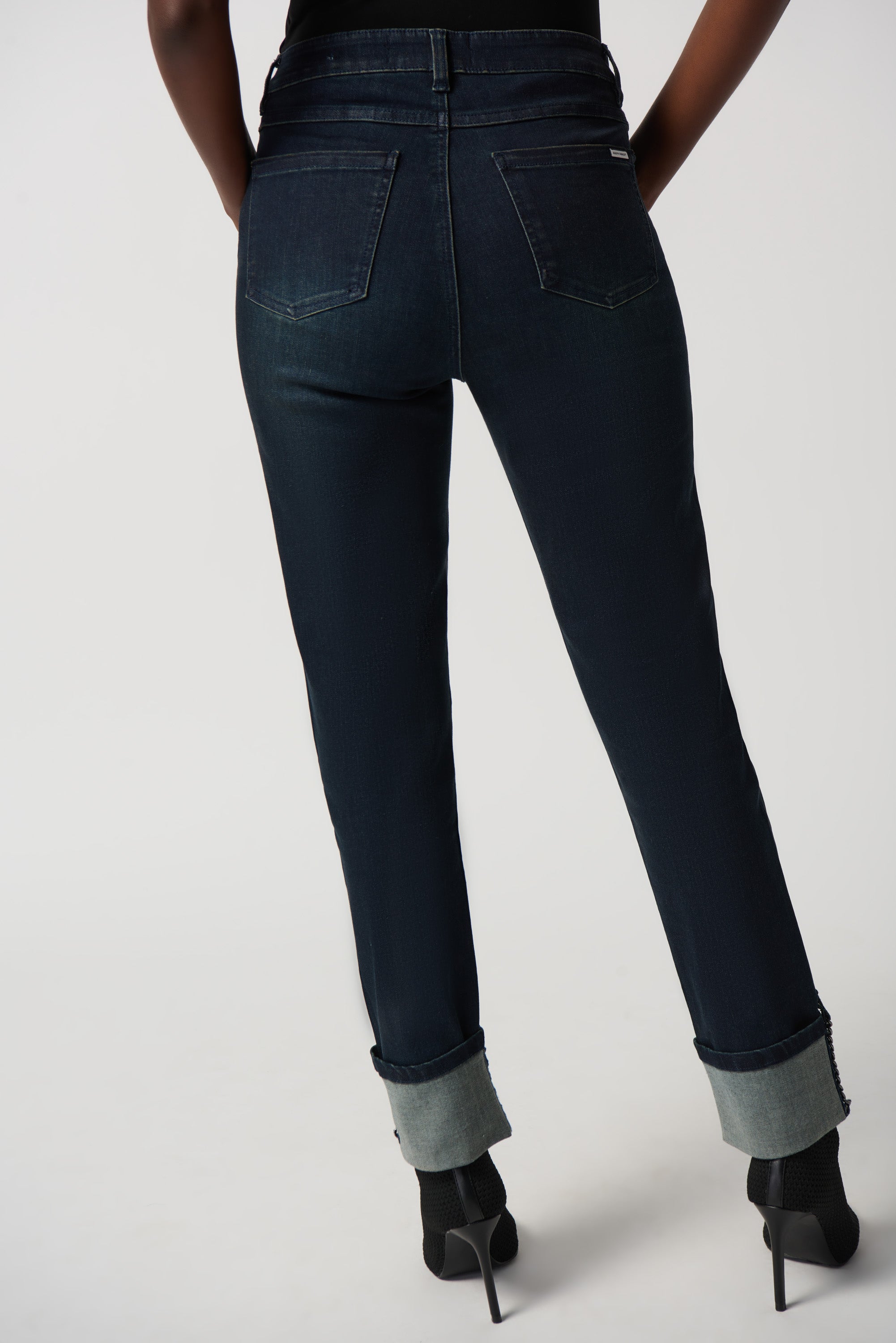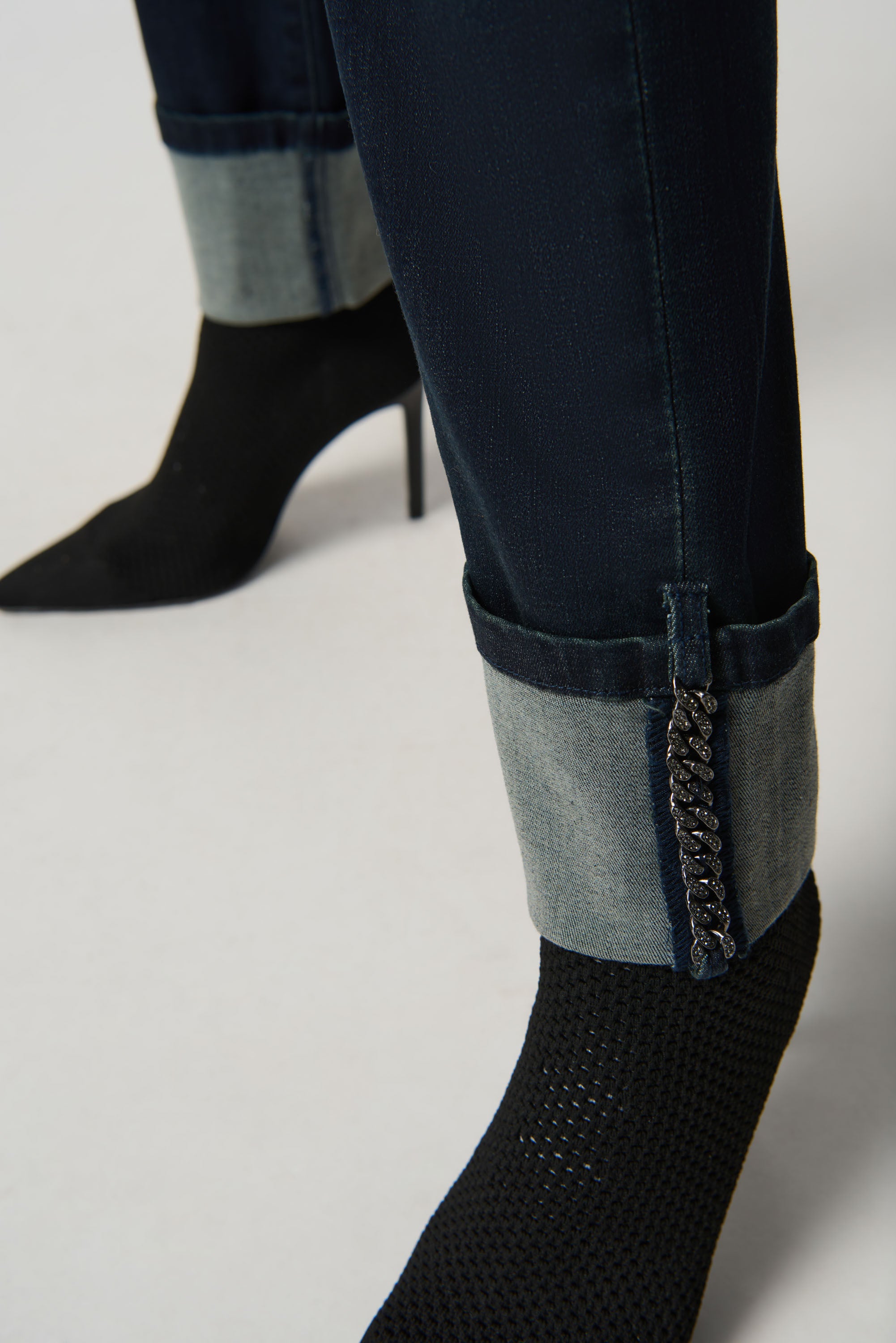 Introducing the Joseph Ribkoff Turnback Jean - the perfect addition to your wardrobe! Made with stretchy denim, these jeans will hug your curves in all the right places. What separates these jeans from the rest is the dazzling diamante chain on the cuff! Upgrade your denim game with the Joseph Ribkoff Turnback Jean!