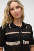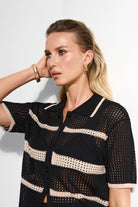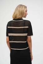 The Knit Collar Top by Joseph Ribkoff is all about the fun details! With a bold stripe print and playful open stitch accents, it’s the perfect way to add some flair to any outfit. Featuring a shirt collar, short cuffed sleeves, and a front button closure, ideal for layering over a black dress or cami for an instant style upgrade!