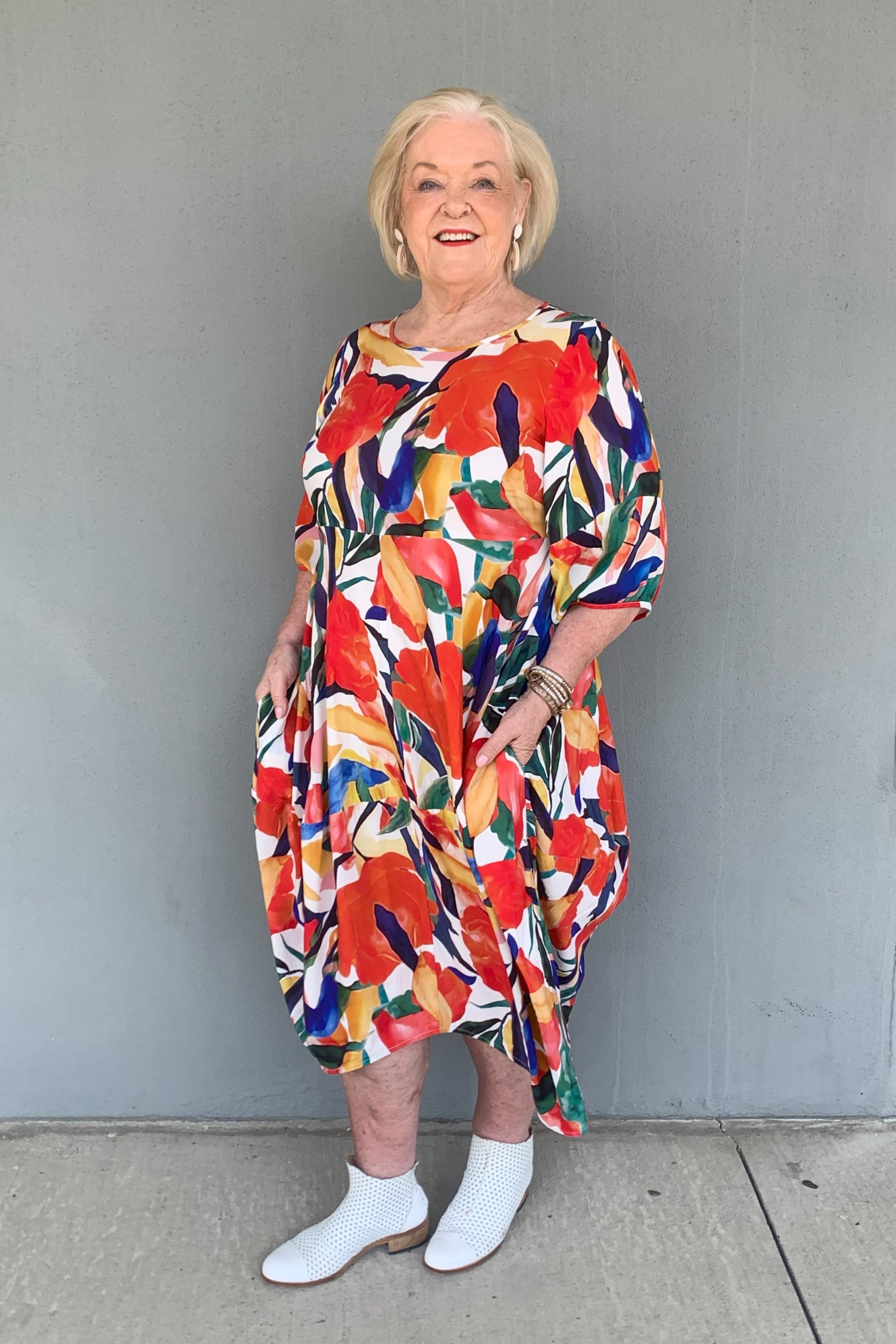 Proudly made in New Zealand, Niovara's Bird of Paradise is ideal for work, wedding and weekend! We love the exquisite exclusive print full of beautiful bright shades and watercolour florals. This design is so easy to wear, with soft gathers through the skirt which gently fall over the body.