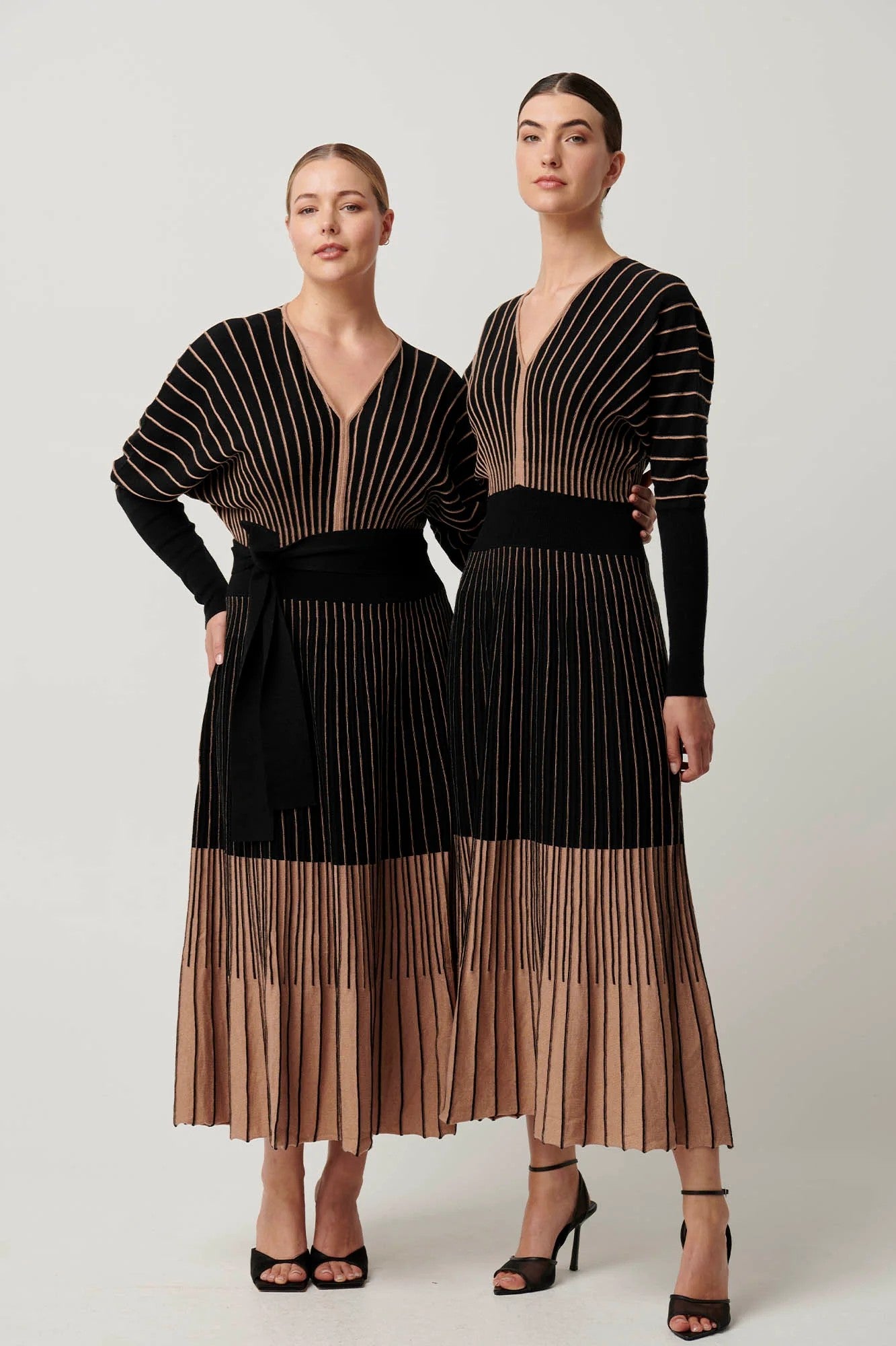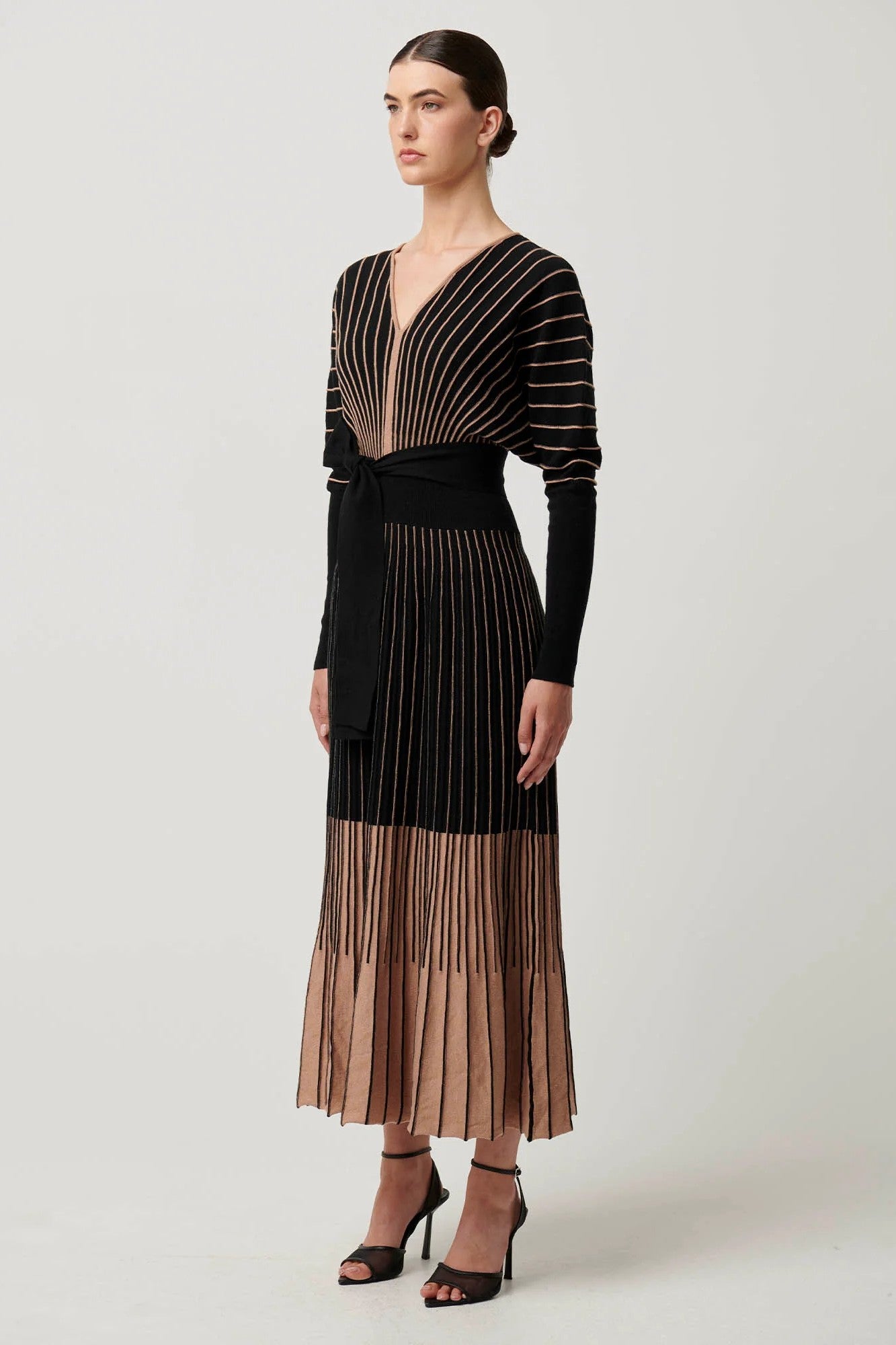 Crafted from a premium wool-cotton blend, the Equinox Ombre Striped Knit Midi Dress by OnceWas combines modern sophistication with everyday comfort. This luxurious knit dress features a striking ombre stripe design creating a contemporary yet timeless appeal. The standout detail is its elegant pleated skirt, offering fluid movement with every step, while the belted waist enhances your silhouette for a flattering fit.