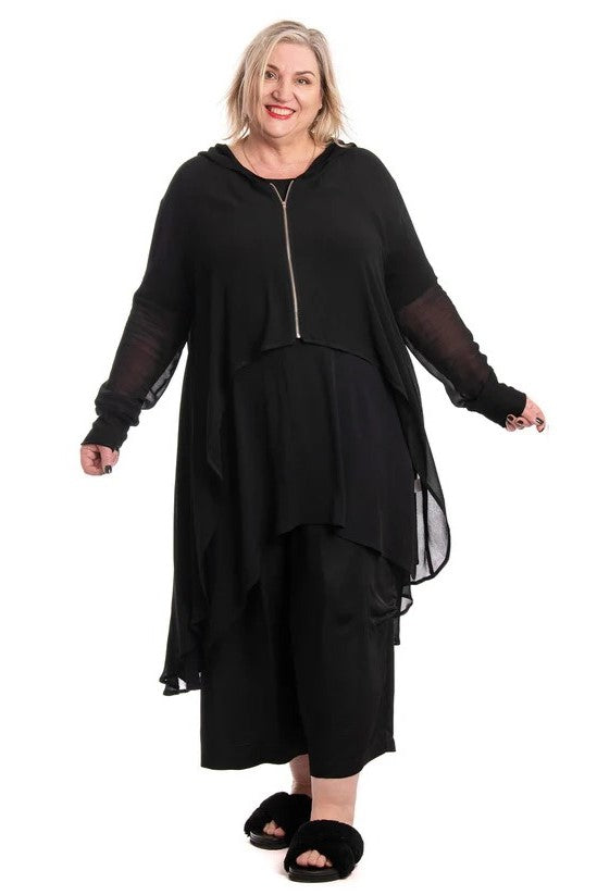 Raven's Cascade Zip Hoodie is a real statement piece, shorter in the front falling to a long cascading back hemline. This edgy style features a large hood, and full-length sleeves that are finished in a rib cuff. Made to be worn all year long, this trans-seasonal style is made in a sheer chiffon, and will surely add some fun and drama to any outfit!