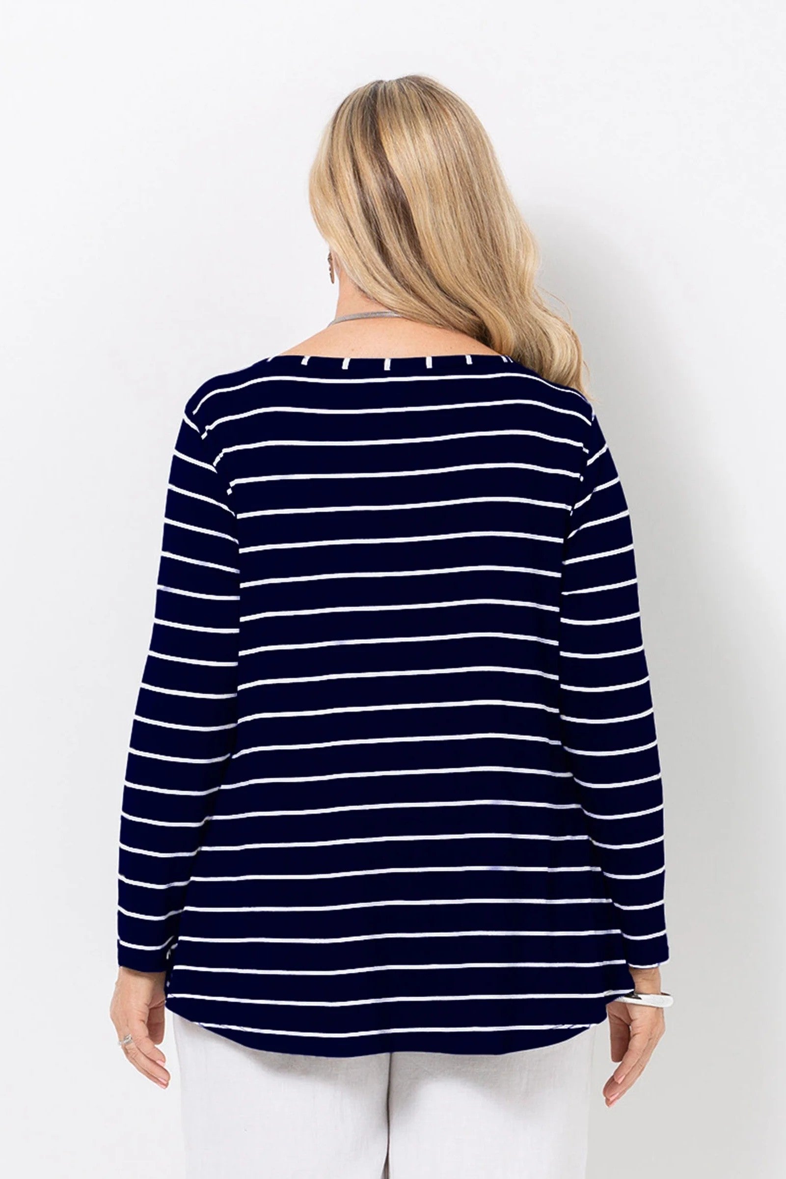 Swish’s Famous Long Sleeve Stripe Knit Tee returns in two fabulous long sleeve designs for Winter! Cut in a soft handle stripe viscose , this fit and flare design offers ease through the hip and tummy with an elbow length sleeve.