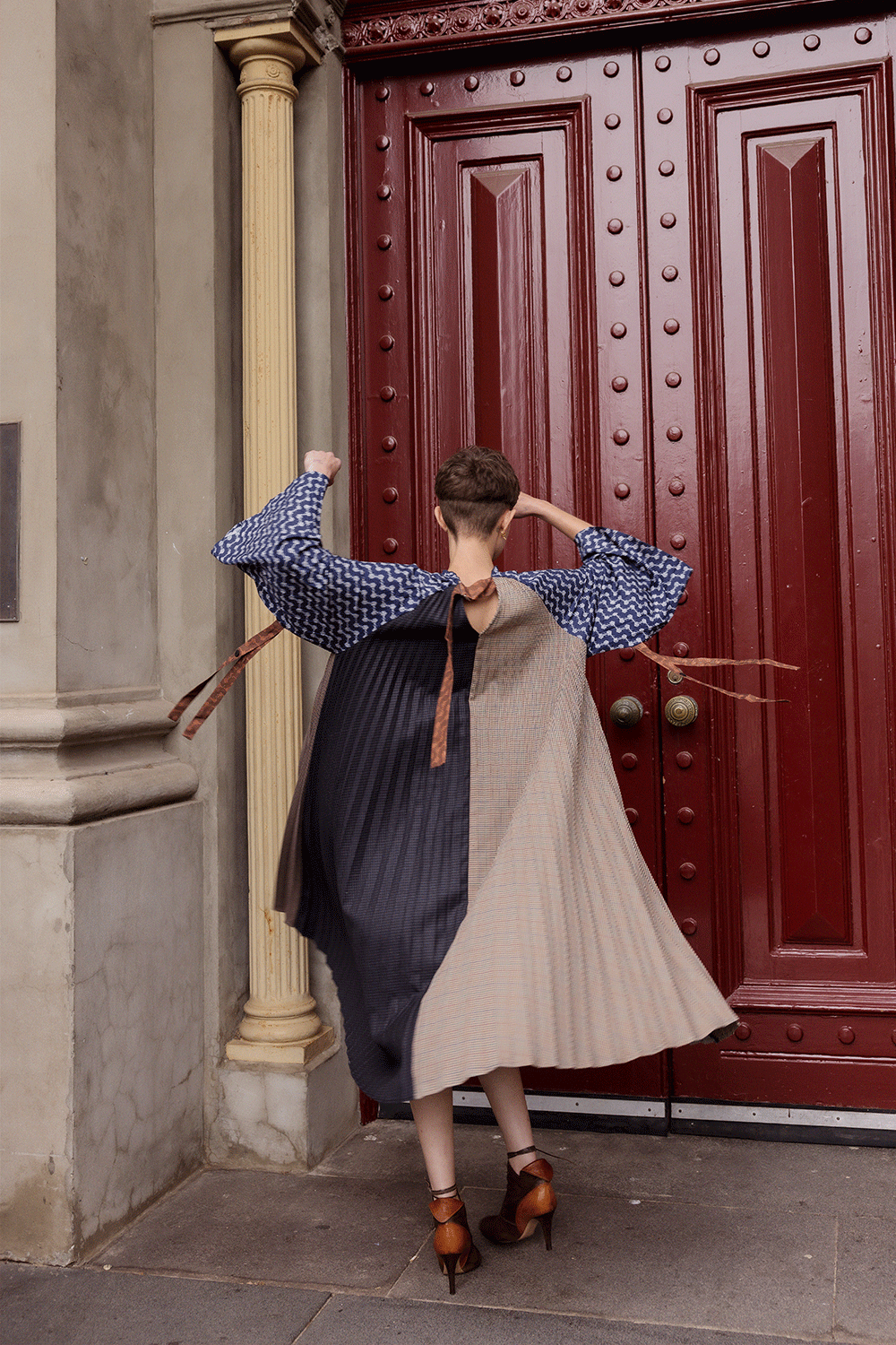 Maud Dainty’s signature interplay of contrasting textures and fabrications comes to the fore in the Barette Coat. Cleverly combining checks and prints and ‘hard’ and ‘soft’ fabrics, this is a statement style you will cherish for years to come. Featuring a pleated front and back that creates easy to wear swing shaping, we love the double vee neckline with tie detail. Contrasting bell shaped sleeves also have tie details allowing you to play with shape and proportion.