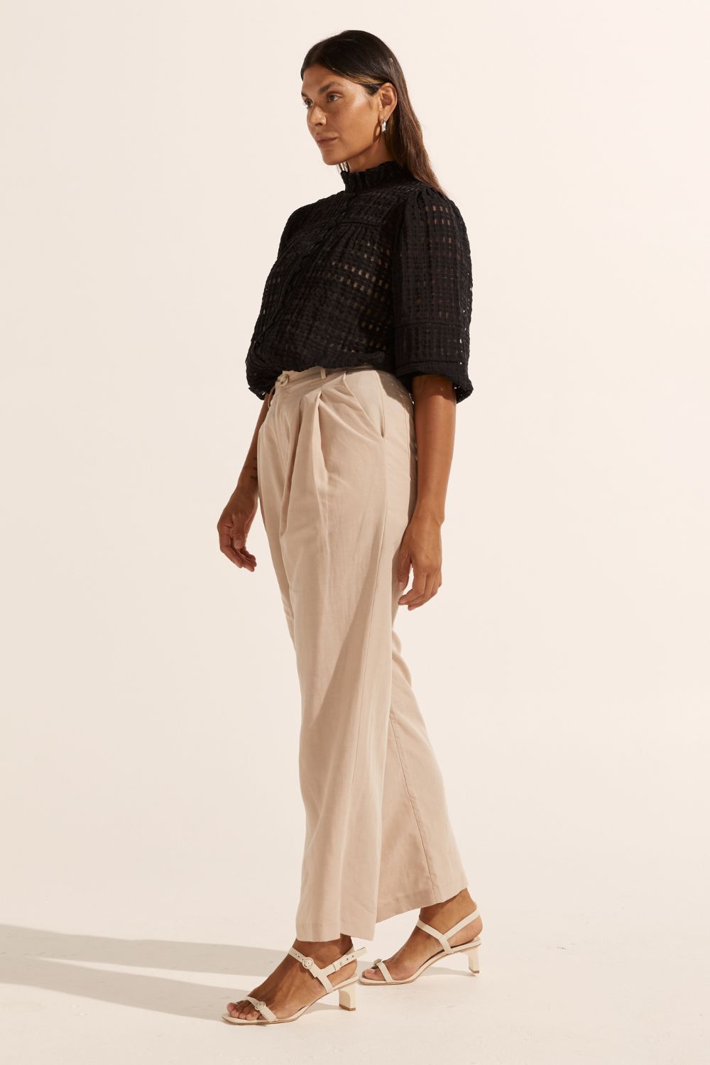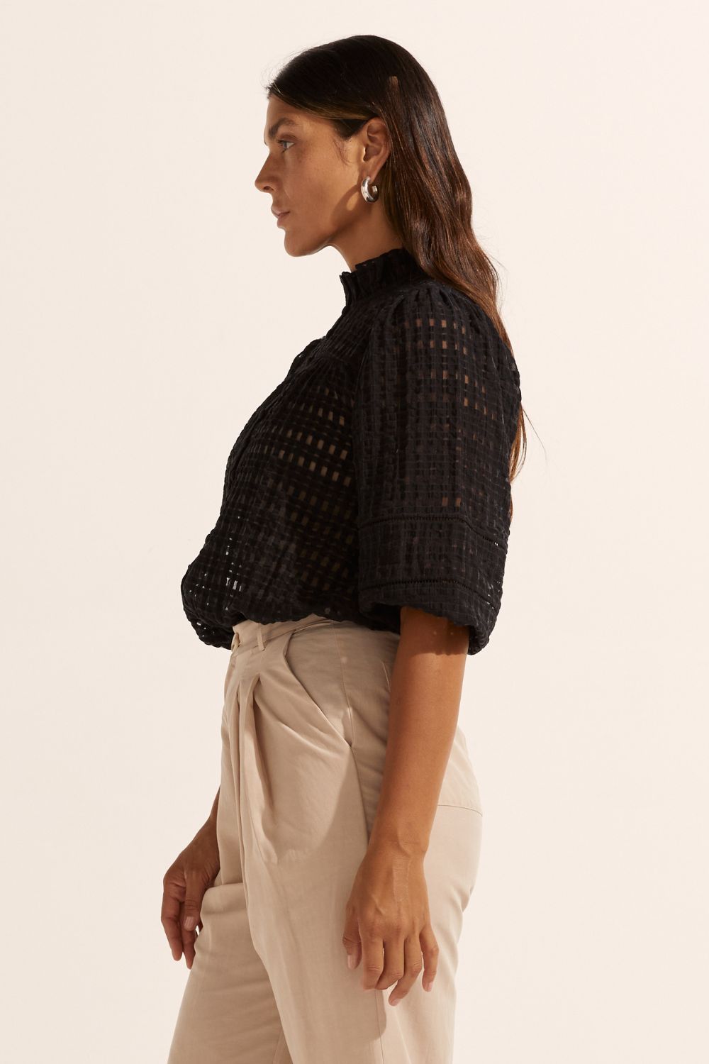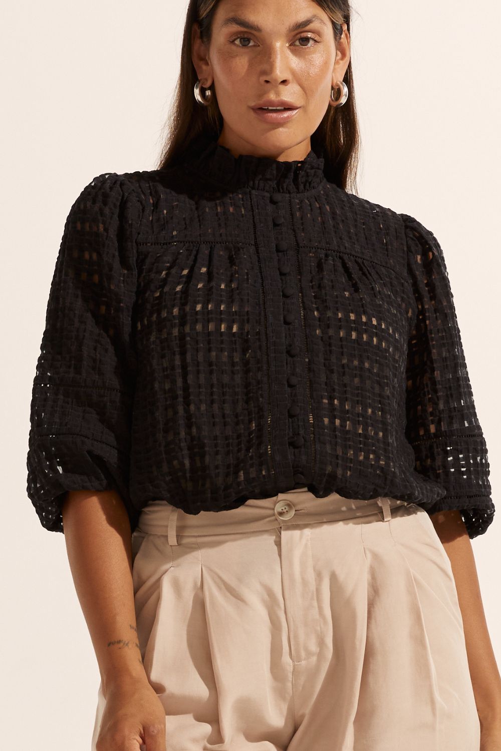 Refined and elevated yet prefect for everyday wear The Wayfarer Top by Zoe is a celebration of feminine style. Crafted in a luxurious self check fabric it offers an element of sheerness as a nod to the sheer trend of the season, but also looks chic with a cami underneath. A ruffled neckline and flutter sleeve are flattering features. Wear yours with a tailored pant or denim for chic understated style.