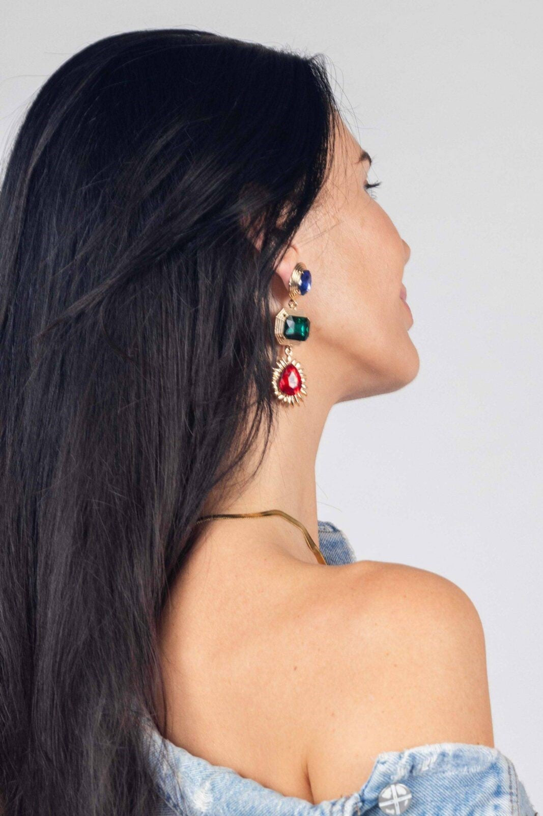 Me The Label brings an evevated vintage inspired look witht the Georgia Drop Earrings. Featuring 3 colourful crystals making this a stand out pair!