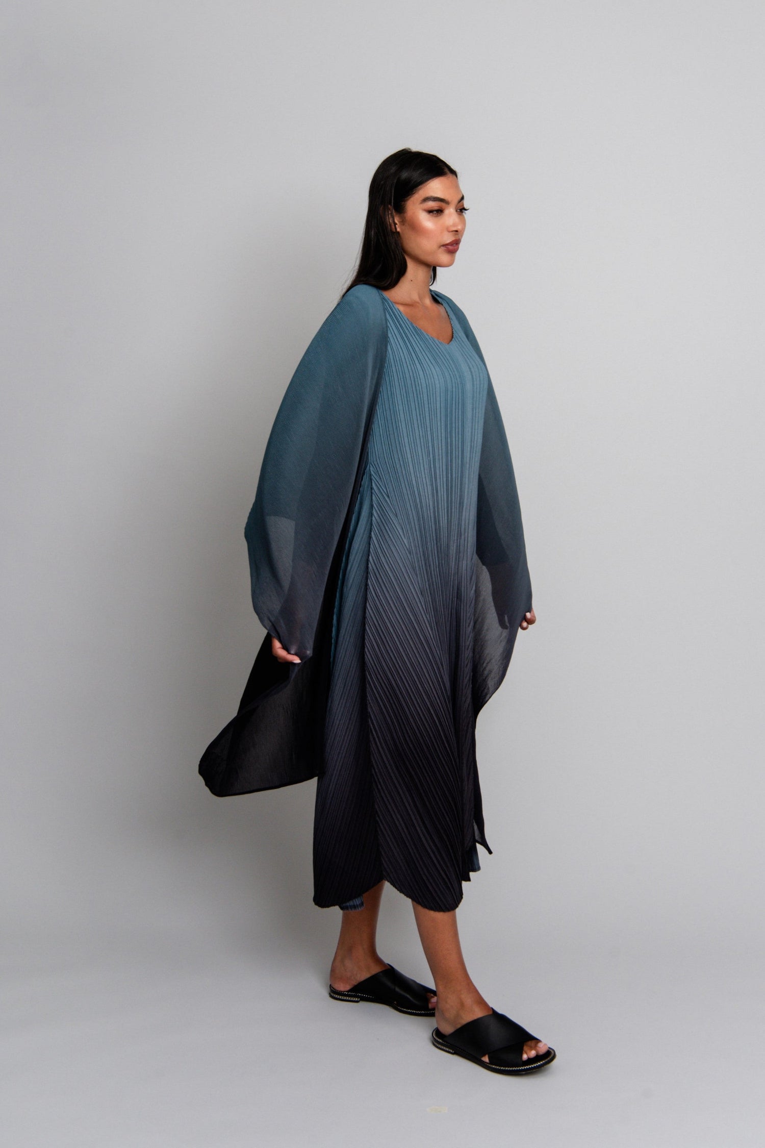 Cut in an intricately pleated fabrication, this sleeveless dress features a Vee neckline and cocoon shaping. Team with the matching Collare Coat at your next big event! This style is offered in more stunning colourways which you can find here, each featuring exquisite ombré styling or incredible patterns. Pair with the matching Collare Coat.