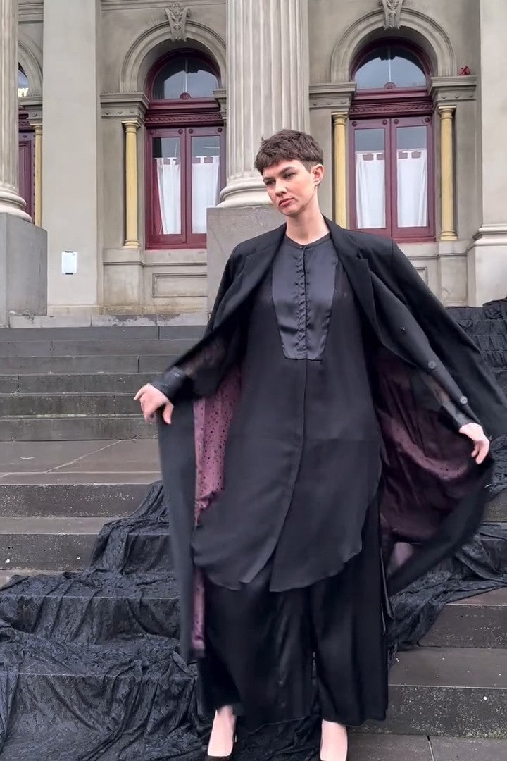 Cut in a 100% Silk Georgette, Maud Dainty’s Bell Boy Tunic is a modern classic investment style you will love and cherish for years to come. We love the contrasting tuxedo style silk satin neckline and cuff as well as the curved hem of this longline design. Worn with a slip this could work as dress, but also works so well as layering tunic worn back with a slim pant or skirt.