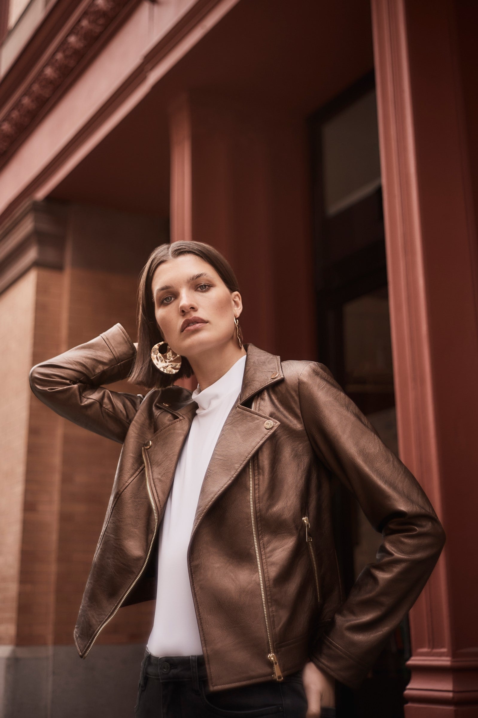 The Metallic Blazer is another showstopper from Joseph Ribkoff that’s sure to sell out! Cut in a soft and buttery vegan leather with a metallic finish, this moto styled jacket features quality gold hardware. We love the asymmetric zip fastening, front zipped pockets and gold press studs in the collar of this fully lined design, but it’s the fabulous Bronze colourway that’s guaranteed to make you stand out from the crowd!