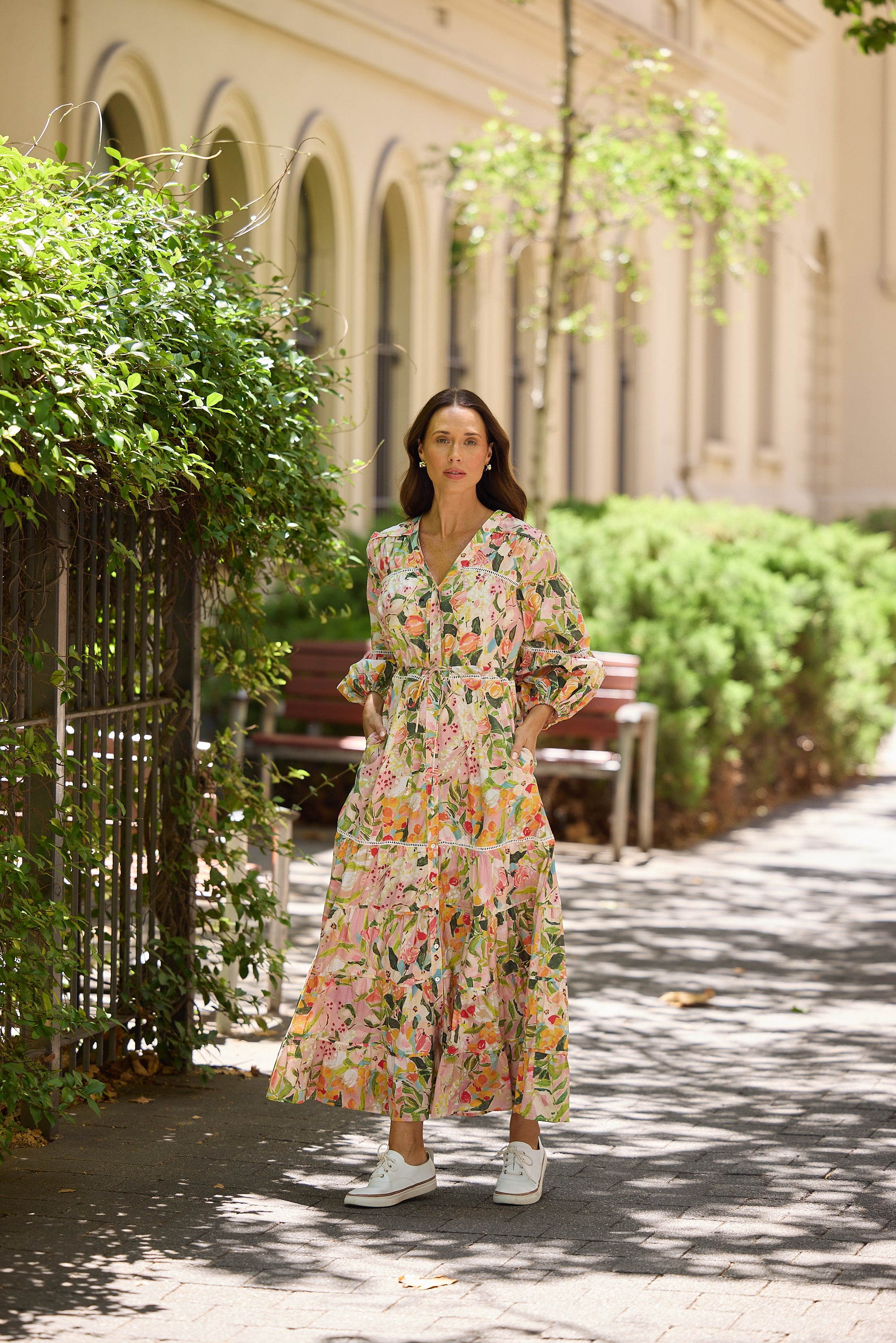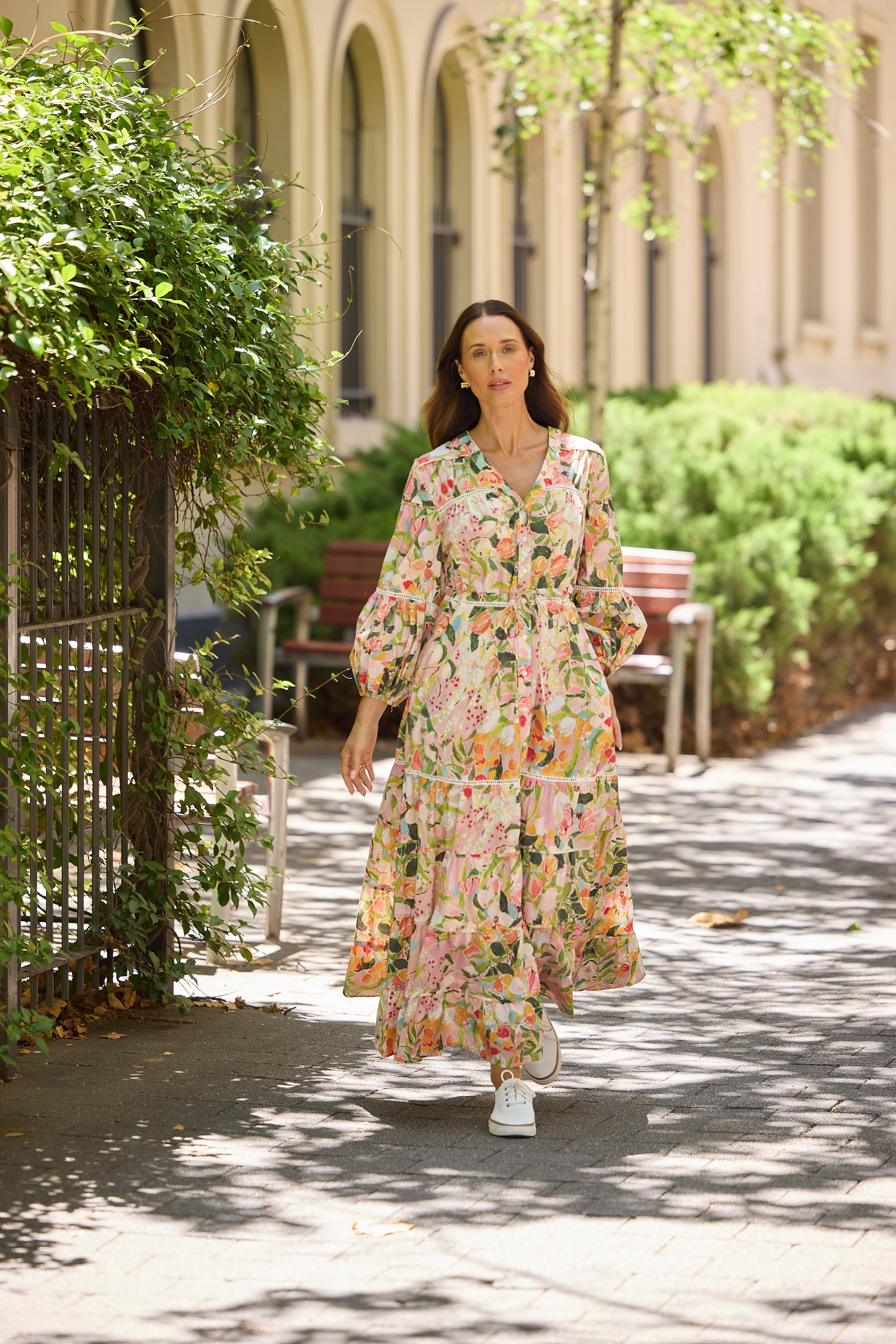 The Gertie Dress – Zoe’s Garden by Brave and True is a breezy floral maxi dress perfect for summer events. A tiered skirt with ladder‑trim detailing and side pockets adds movement and playful detail. The front-button stand and waist tie let you define your look, while full-length sleeves with elasticated cuffs keep it light and effortless. Dress it up as a wedding guest dress with heels and a clutch, or style with sandals for brunches, drinks, or weekend BBQs. This Zoe’s Garden dress moves beautifully from day to night, making it a go-to piece for sunny celebrations.