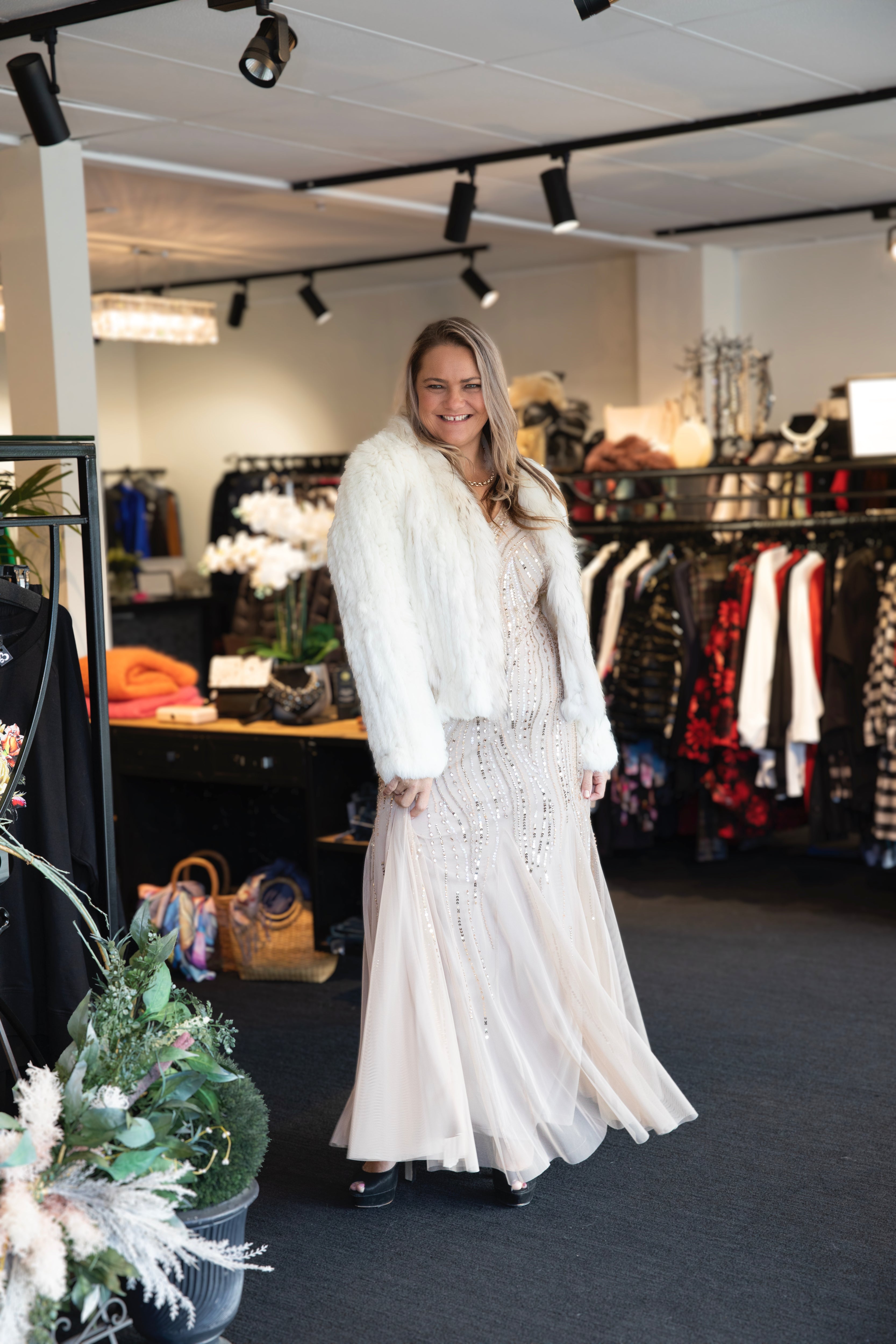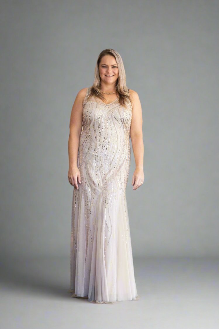 Be gorgeous in gold in the striking Champagne Beaded Gown by Frank Lyman. Effortlessly sophisticated, we love the soft fit and flare ballgown style that looks amazing on all that try it on! Stunning gold sequins inlaid into the mesh really make this style stand out!