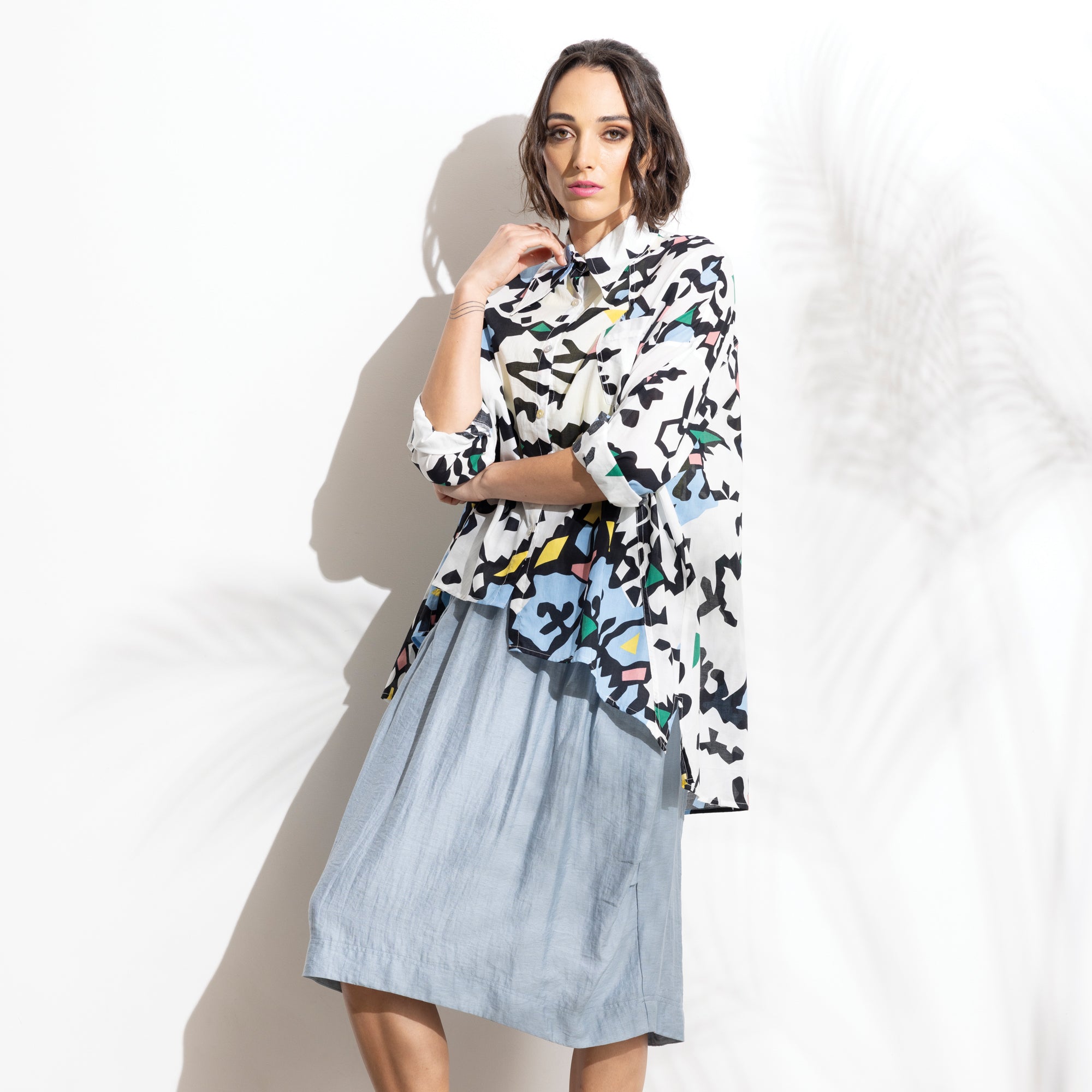 Elevate your wardrobe with Blacklist's Prato Shirt. Its abstract length and split back provide a unique touch, while the pointy slightly oversized collar exudes sophistication. Stay comfortable with this one-of-a-kind piece that will make a statement wherever you go.