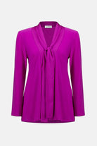 Tailored in a beautiful silky knit fabric, Joseph Ribkoff's Silky Knit and Satin Tie Tunic exudes poise from day to night. The garment showcases a V-shaped neckline accentuated by a chic satin scarf tie, giving the piece its refined feel. Classic long sleeves perfectly complement the tunic’s simple, yet timeless straight silhouette.