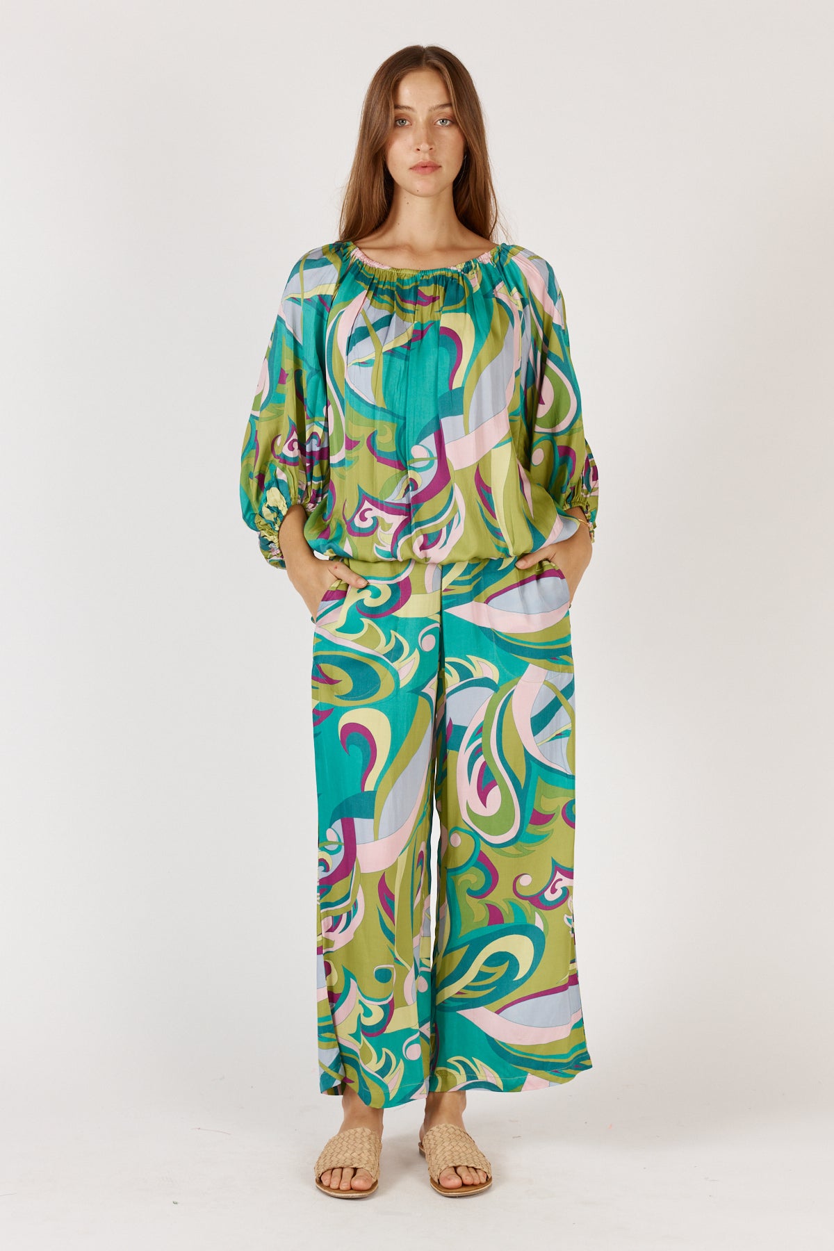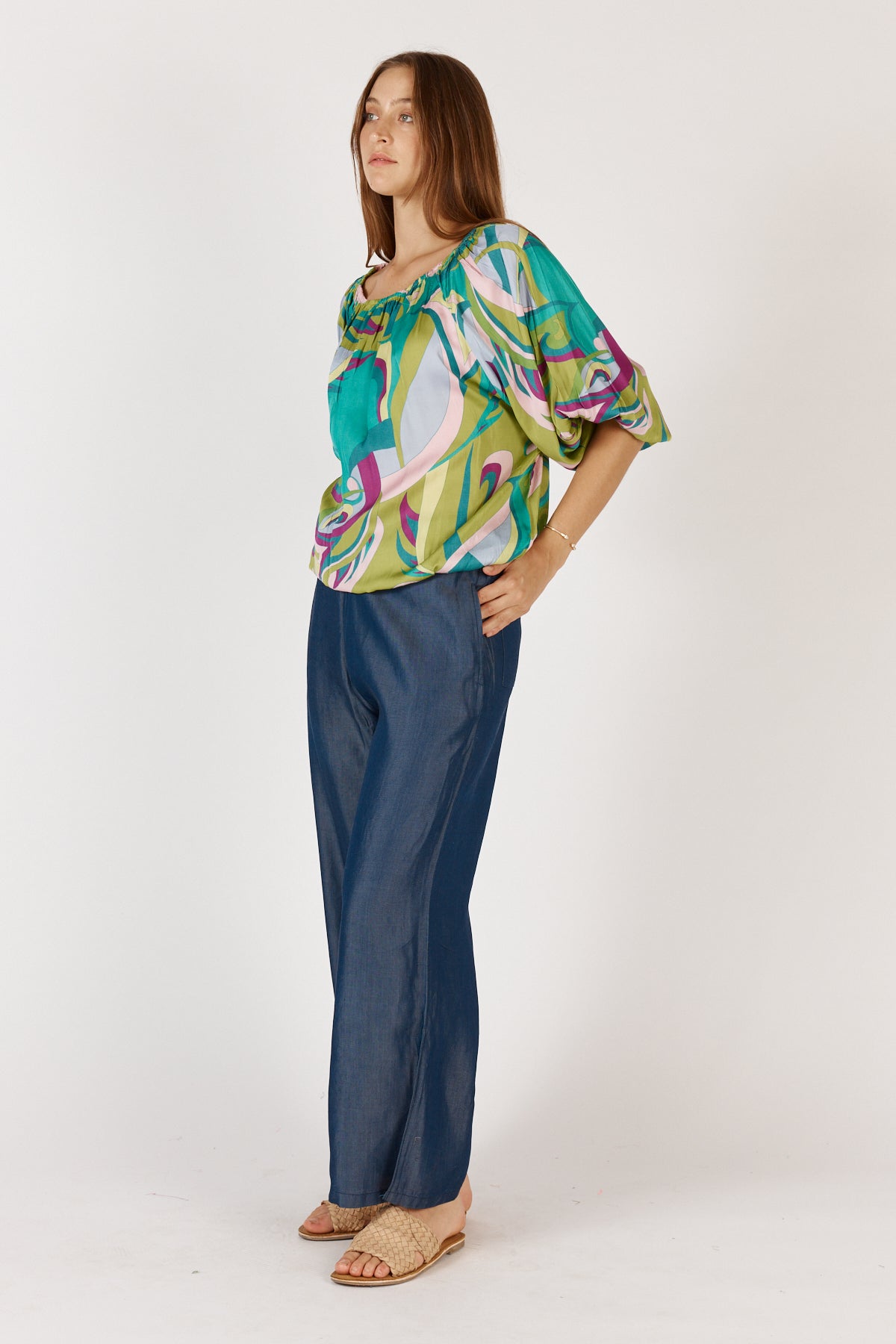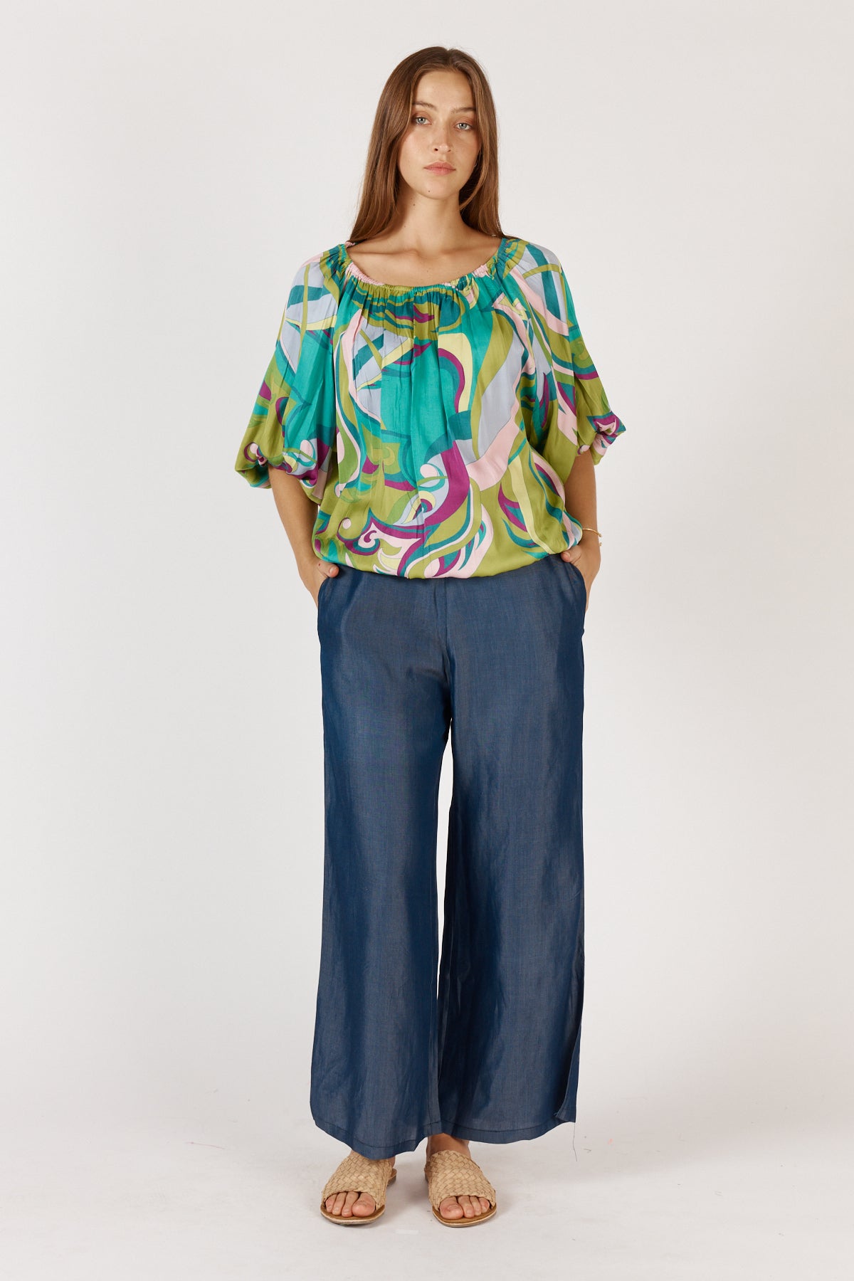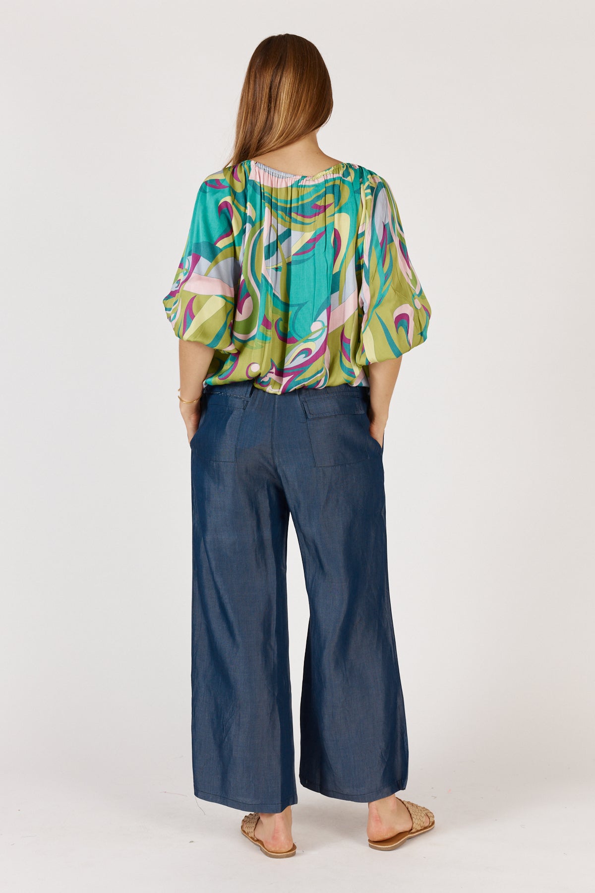 Crafted from breathable viscose, it skims without clinging and finishes with a curved hem that adds ease and movement. The wide neckline and 3/4 sleeves give it a relaxed, pulled-together feel – perfect for styling with everything from linen pants to jeans or layering under a blazer when you want a pop of print. We love it with the Ruby Yaya Jonson Denim Pant.