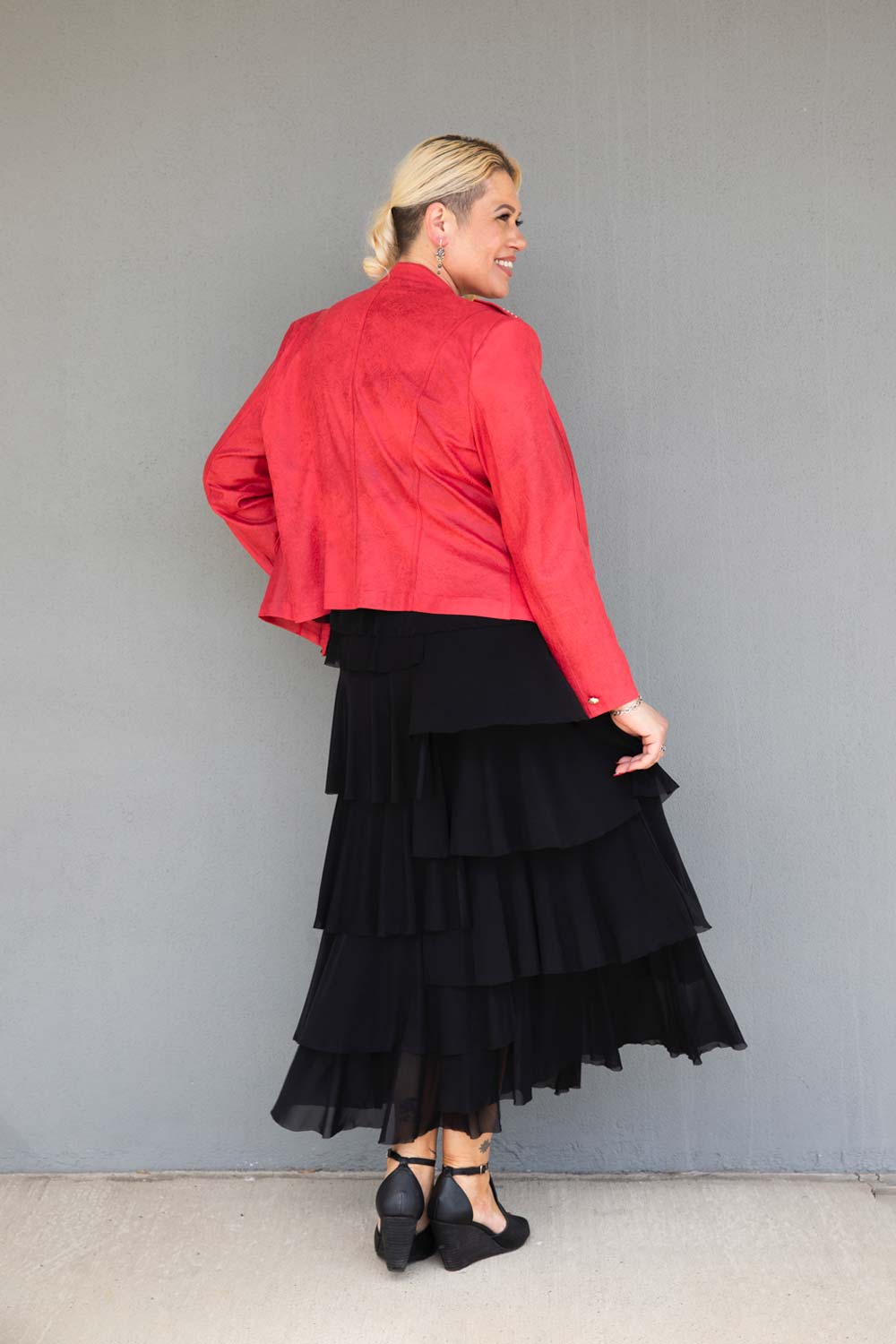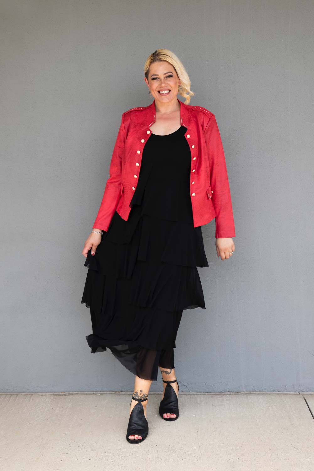 Coral Military Jacket - - Frank Lyman’s Coral Military Jacket is sophisticated and fun! Cut in a buttery soft suedette, this beautifully tailored edge to edge jacket features gold stud details at the neckline, epaulettes and pockets. We love the soft Coral Red colourway and the feature gold military buttons to finish.