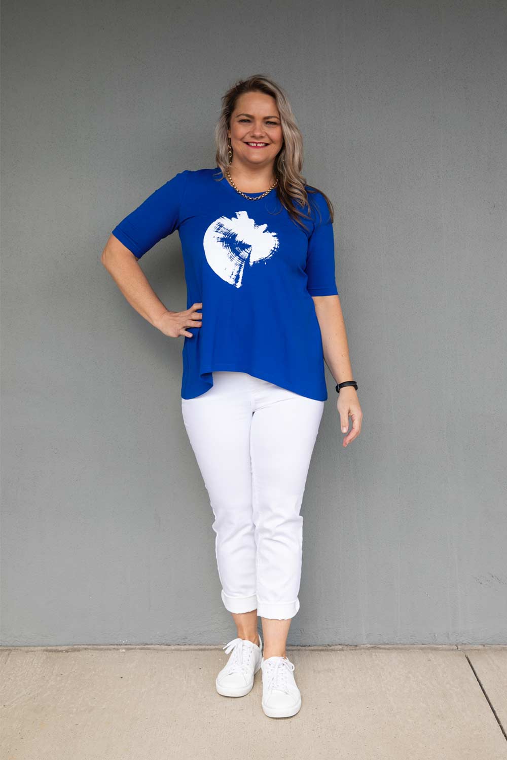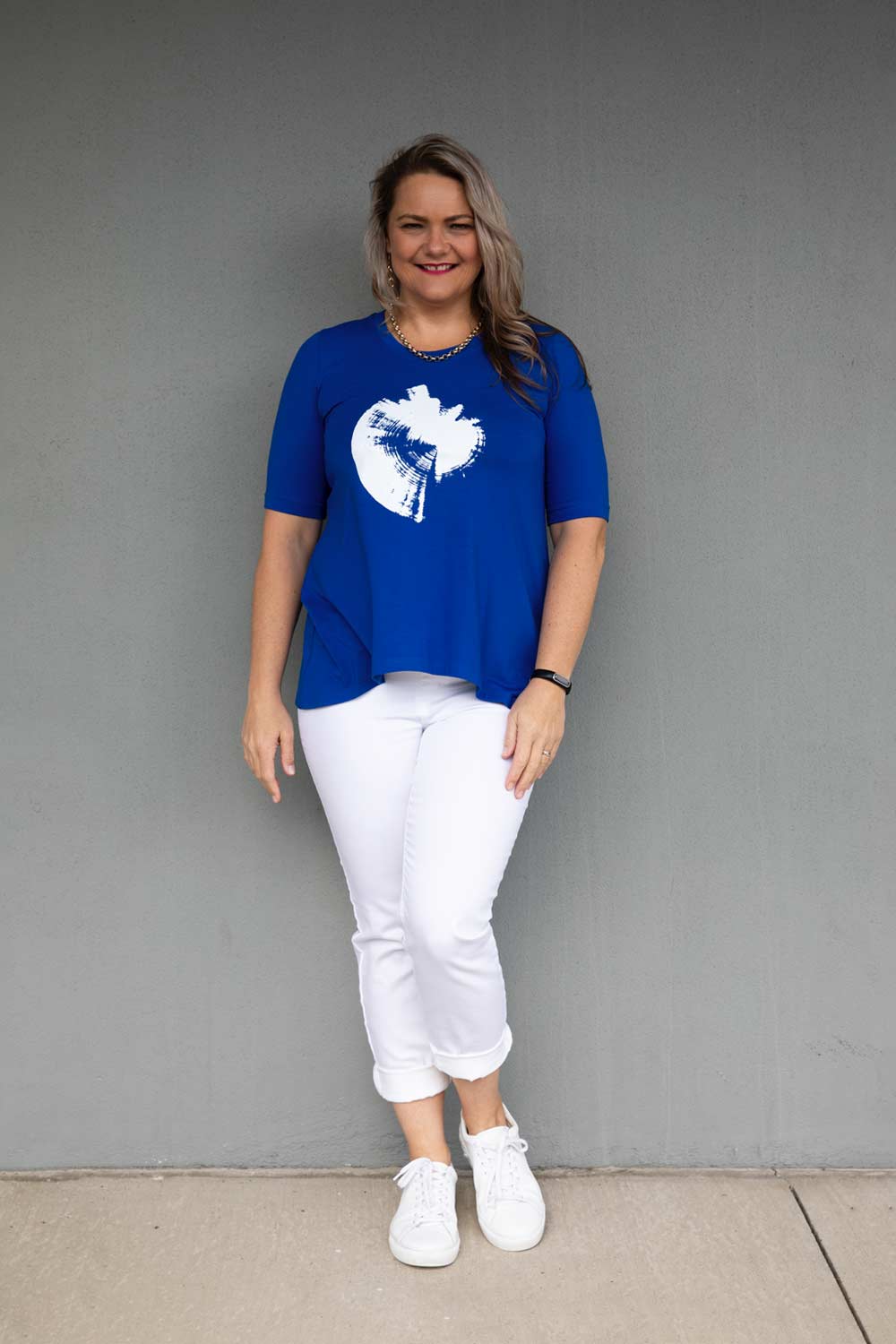 Proudly made in New Zealand, and crafted in a soft stretch viscose fabric, the Cashews Woodcut Round Flare Top is ideal for everyday wear. There's a flattering scoop neck, flit and flare shaping for ease of fit. We love the striking screenprint on the front that pairs so well with a white pant or denim.
