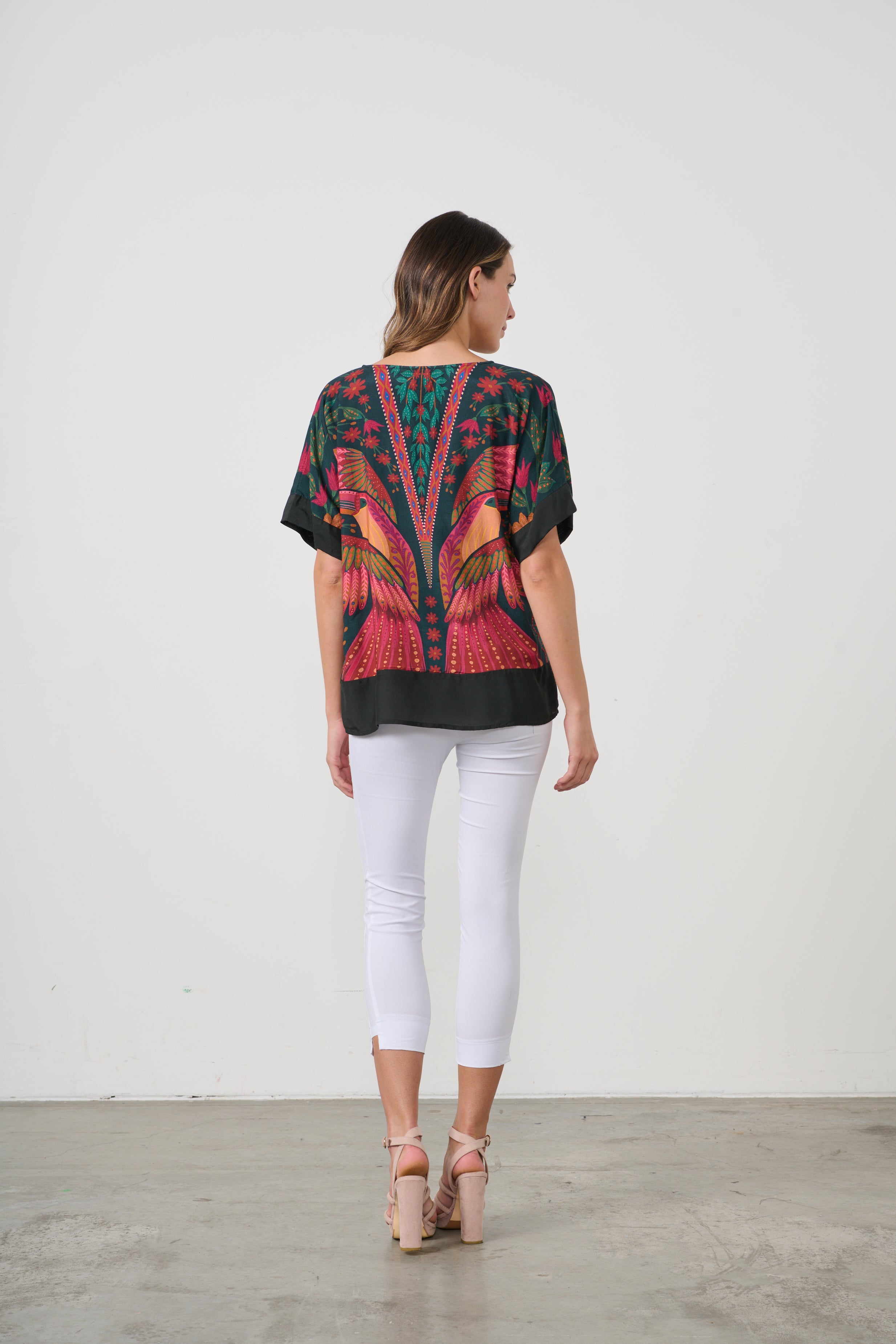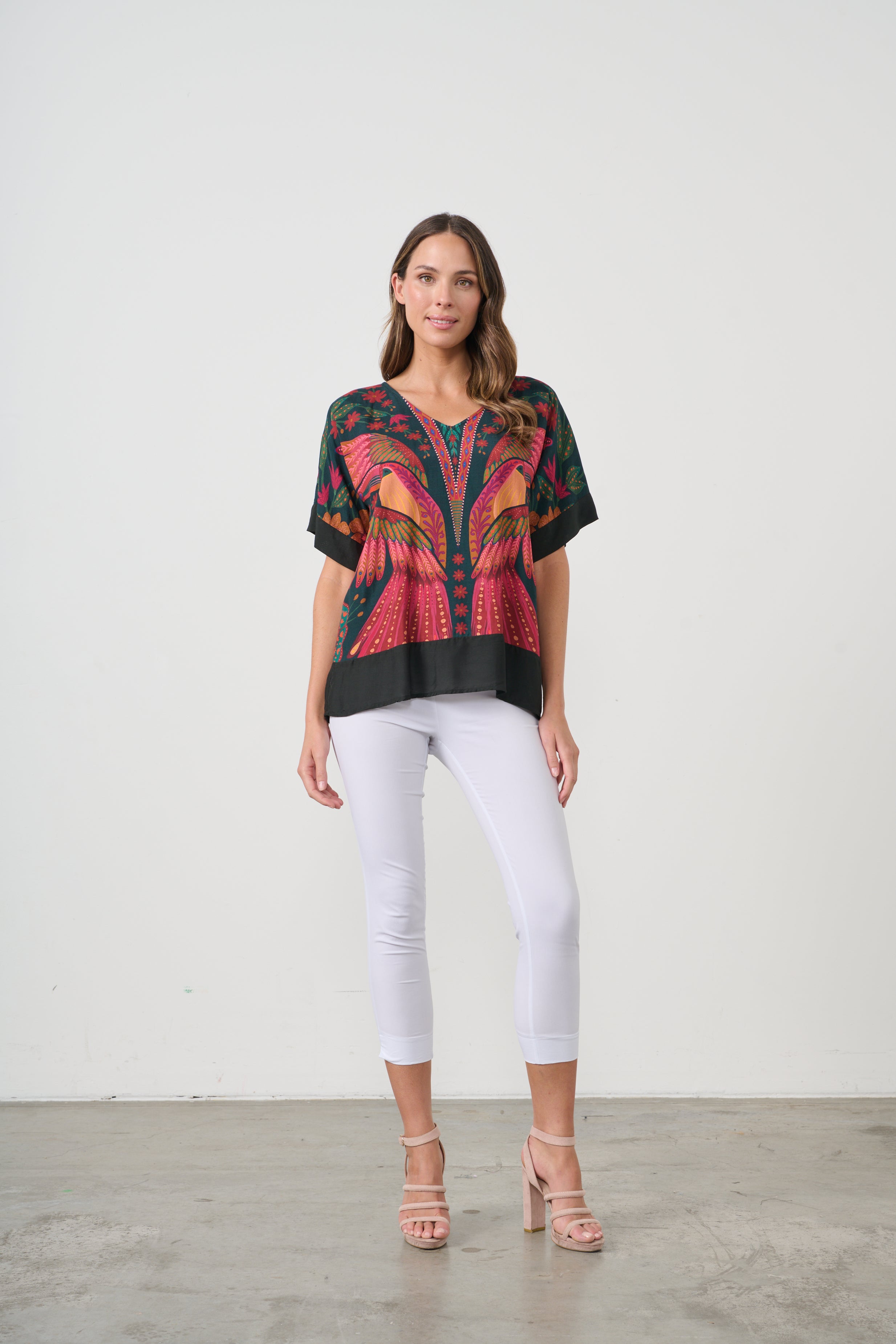womens wide leg pant with multi toucan print and black top worn by model side view