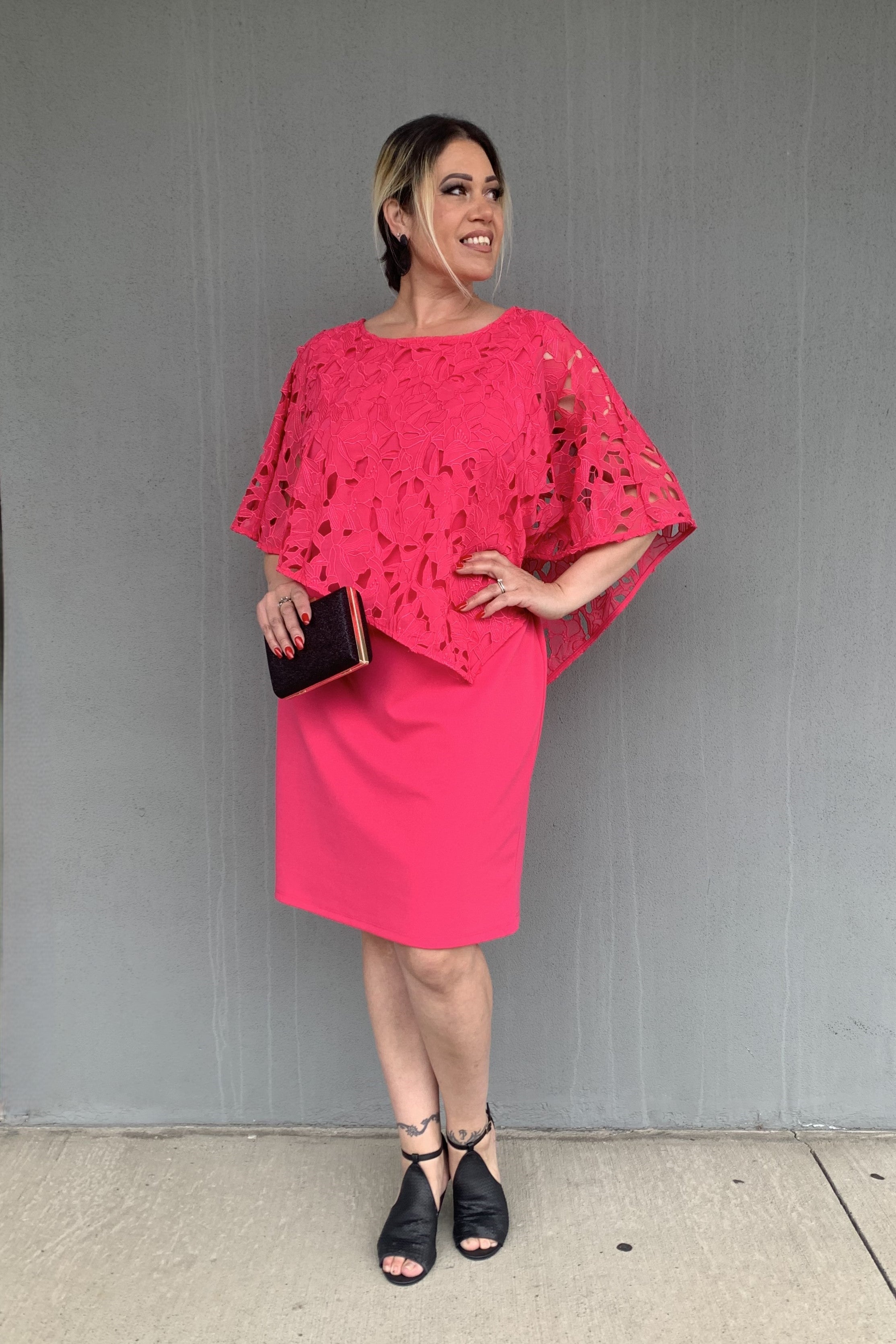 Stand out in style at your next event with Frank Lyman's Raspberry Lace Dress! The beautiful mid-tone pink fabrication is sure to complement and brighten your appearance. With a flattering fit featuring a fitted knee length skirt and a lace overlay to cover the arms and float across the tummy.