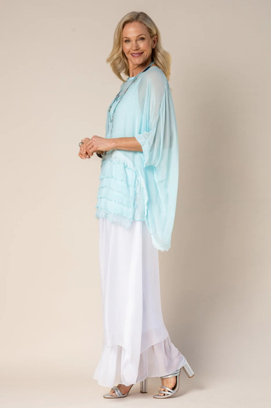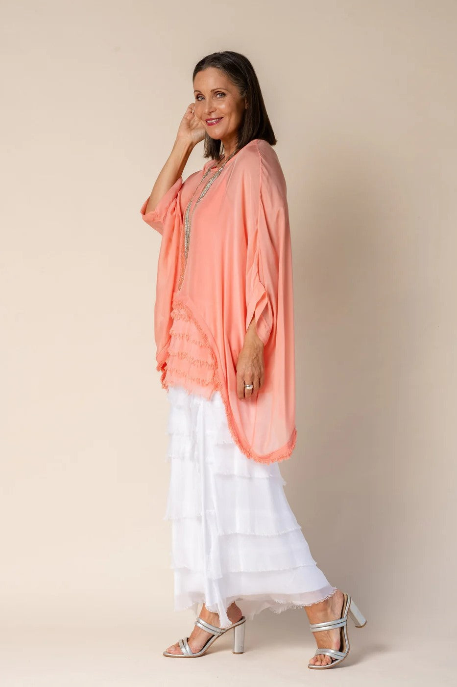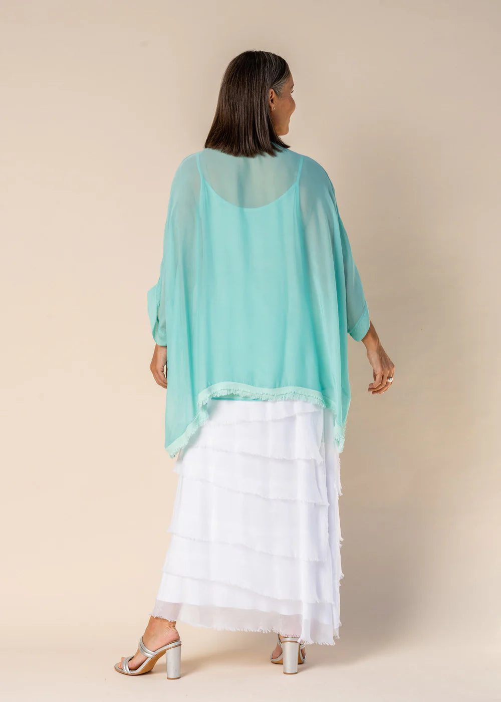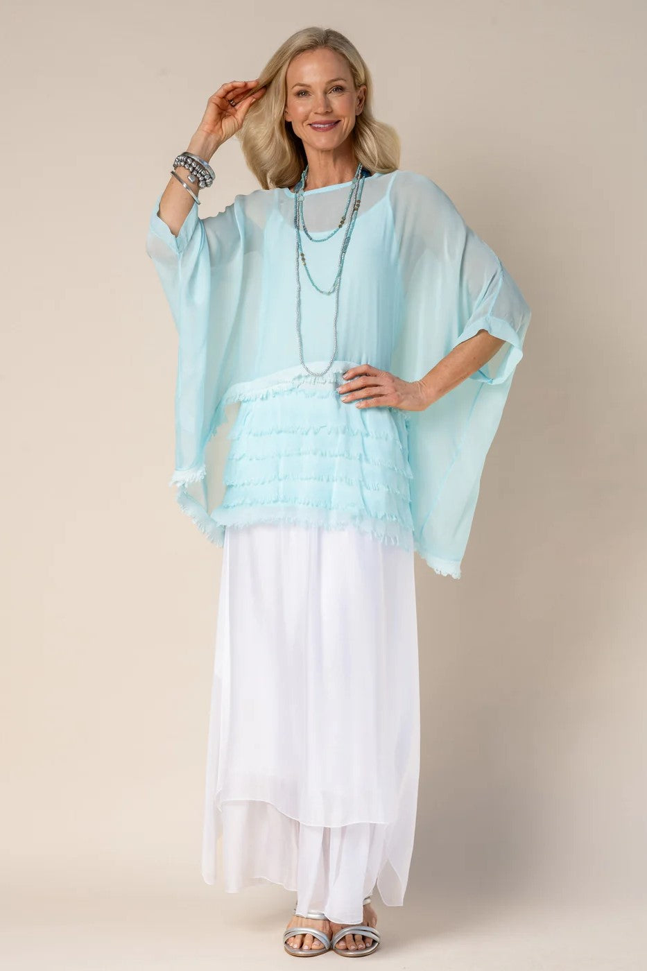 The Farah Silk Top by Imagine Fashion will be your new favourite summer top! A dramatic silk top with layers of silk at the bottom which fall beautifully over the body. This style is a two-in-one including a frilled cami and matching frilled overtop, this style is so versatile! More colours are available here!