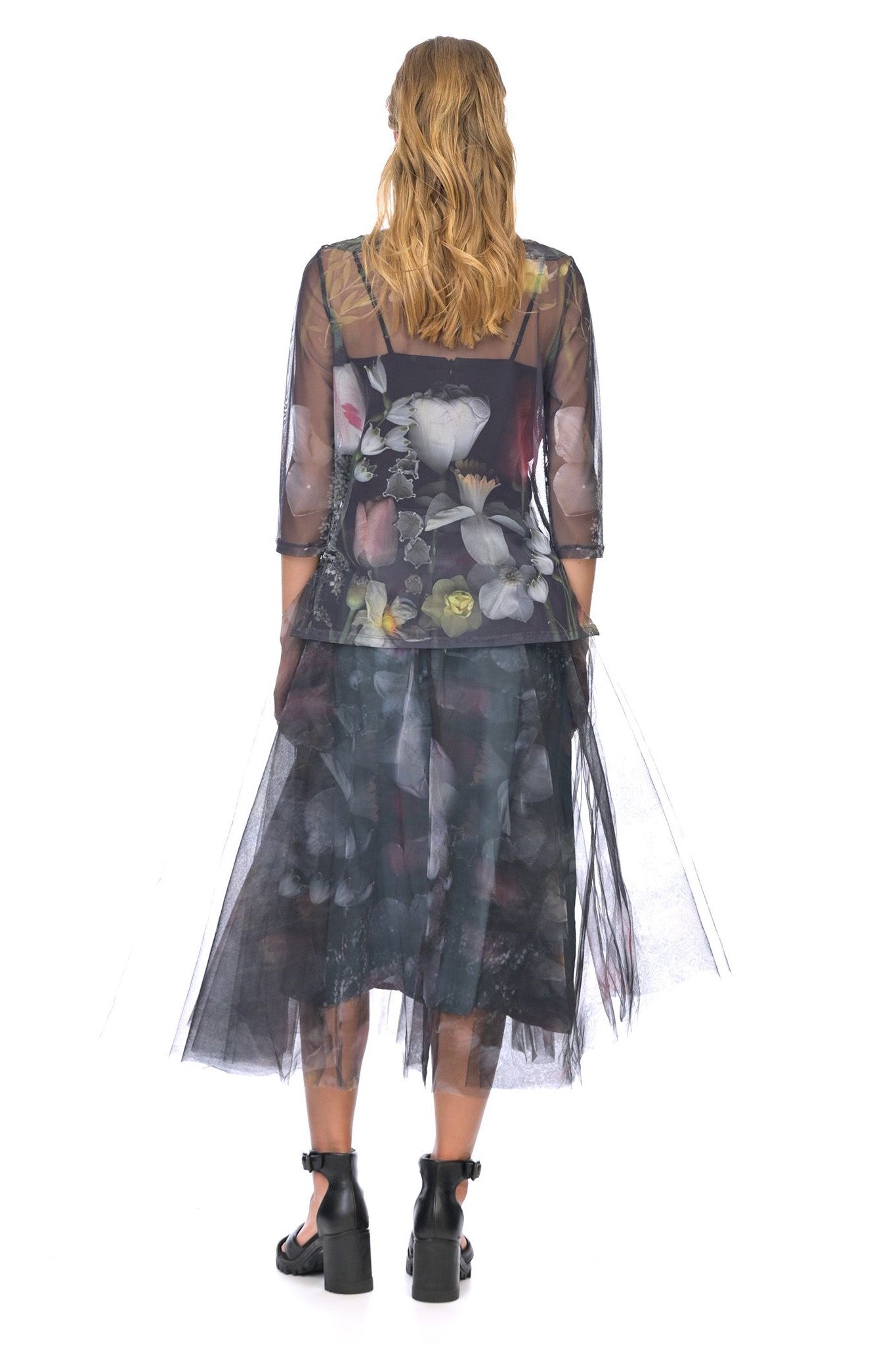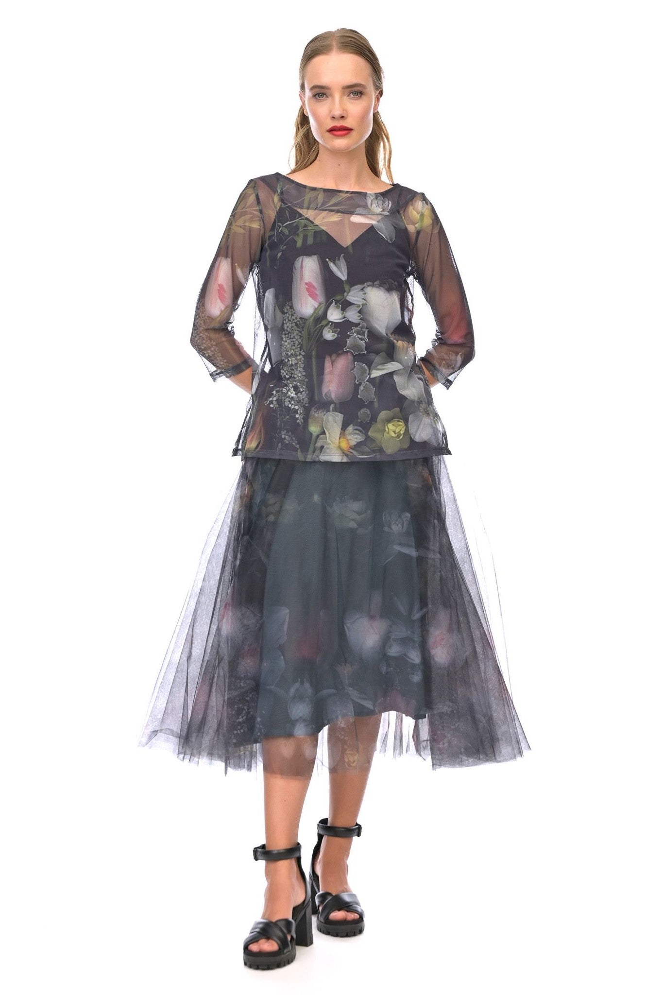 The Tulips Tulle Audrey Tee by Megan Salmon is a beautiful floral mesh shirt designed by Megan Salmon who specialises in creating eye-catching textile artworks.  It features a wide boat neck and can be worn with a cami or layered under a pinafore. The Tulips Tulle Audrey Tee is a must-have for anyone looking to elevate their wardrobe with a beautiful and unique piece.