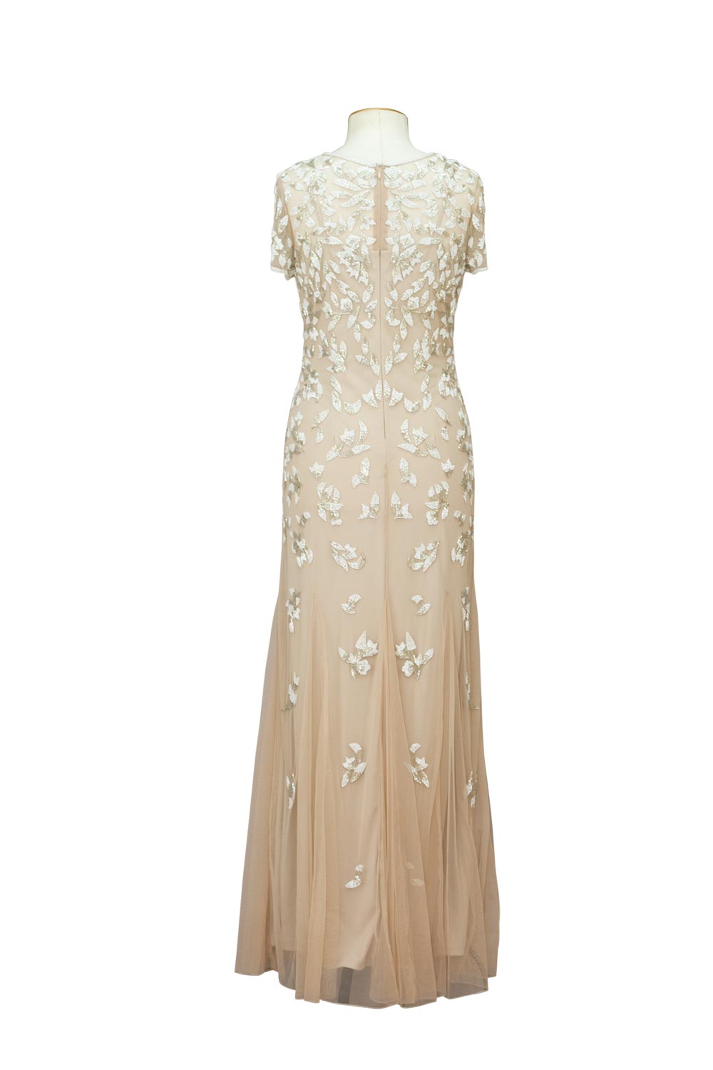 Sweet and striking in one dramatic piece, the V Neck Dress by Jesse Harper is certain to take your breath away. This floor length design features a vee neck and small cap sleeve with back zip. It is intricately beaded through the bodice, with delicate sequins sewn through the skirt. Cream coloured mesh is overlaid over a nougat knit under layer for added comfort and ease of fit. This stunning piece is ideal for a formal wedding, awards dinner, cocktail party - and would even work as a second wedding dress!