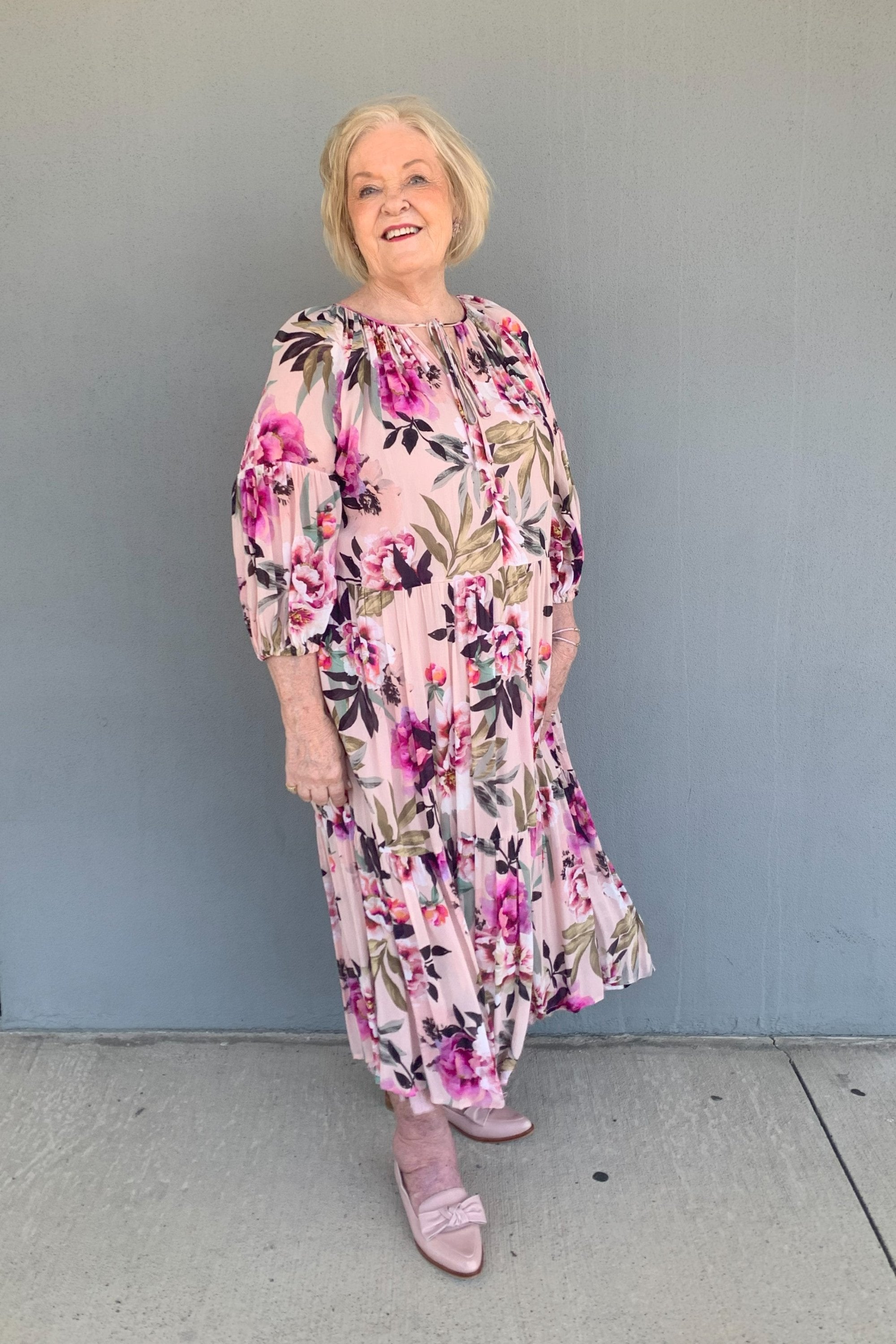 Fall in love with the Olivia Dress from Blanc. Created exclusively for Magazine and made in New Zealand. Crafted in a stunning blush floral print, this dress floats across the body with its fit and flare shaping and tiered maxi skirt.