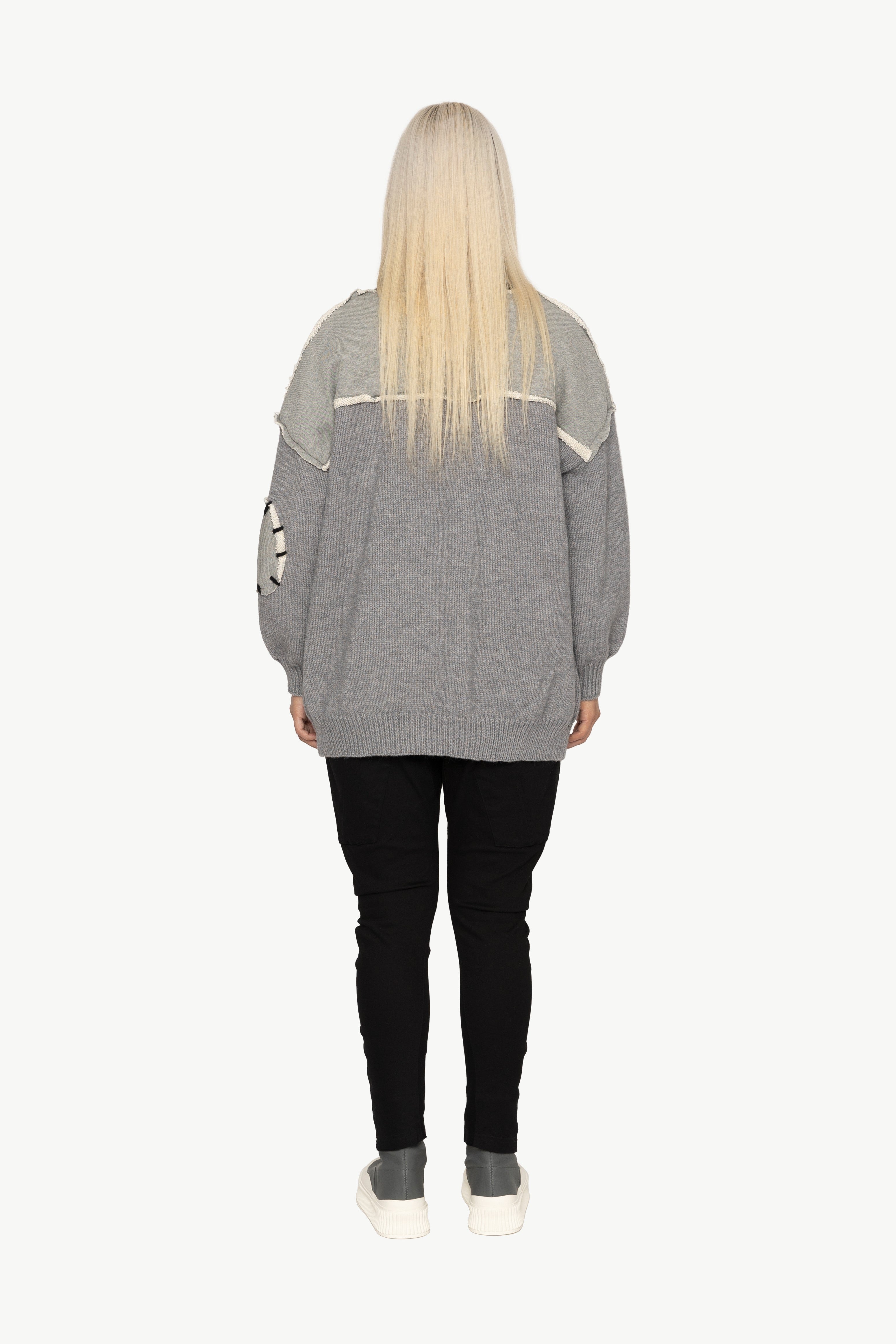 Introducing the super soft Stellan Cardigan from Bone and Arrow! This two toned oversized cardigan features contrast trim, exposed stitching, and raw edge patches. It's deep V neck is completed with 3 buttons and subtle puff sleeves, keeping you warm this season.