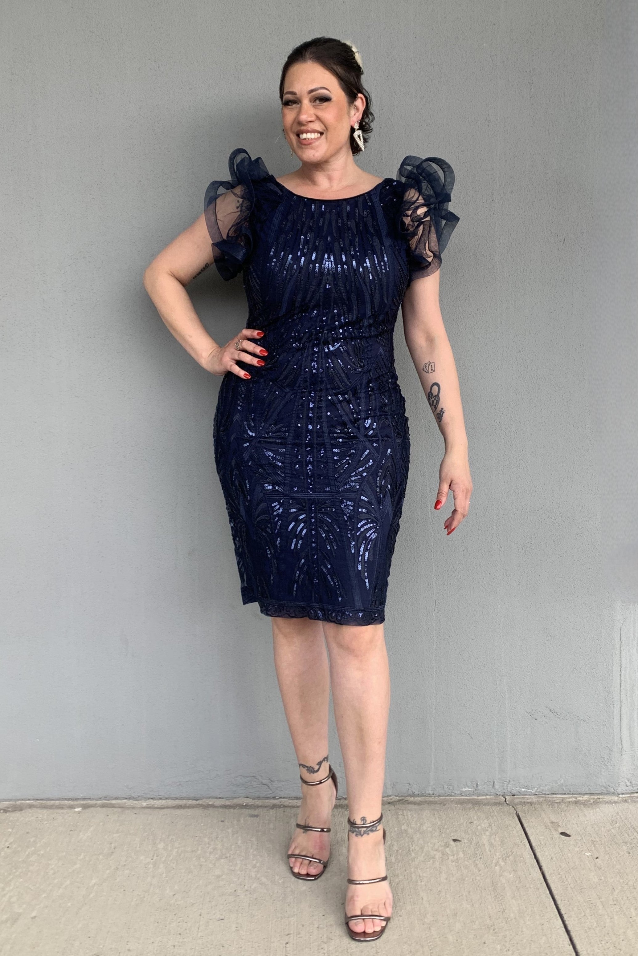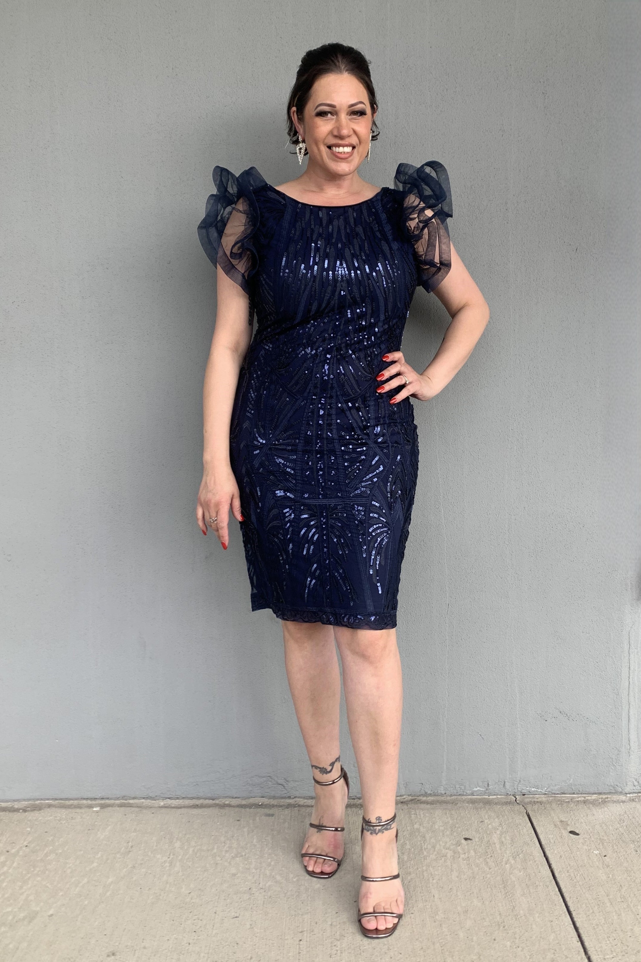 The Frank Lyman Knit Embellish Dress is sure to turn heads for your next special event! Cut in a figure-hugging shape and adorned with sequins, this piece is sophisticated and bold. Perfect to wear with heels and your finest jewellery for your next special occasion!
