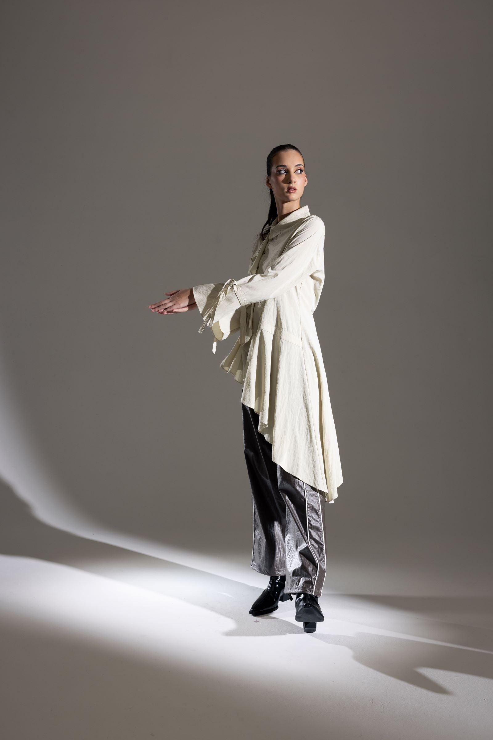 Turn heads in the Melrose Shirt by Bone and Arrow, designed with a striking front frill that flows effortlessly into a soft waterfall hem. Style it with tailored trousers for a polished statement or pair with denim to let the silhouette shine. The asymmetrical shirt design brings a modern, fashion forward edge, with sculptural lines that create movement and visual interest from every angle. Textured and unique, this style holds its shape beautifully while still feeling comfortable to wear, making it a standout piece for both work and occasion dressing.