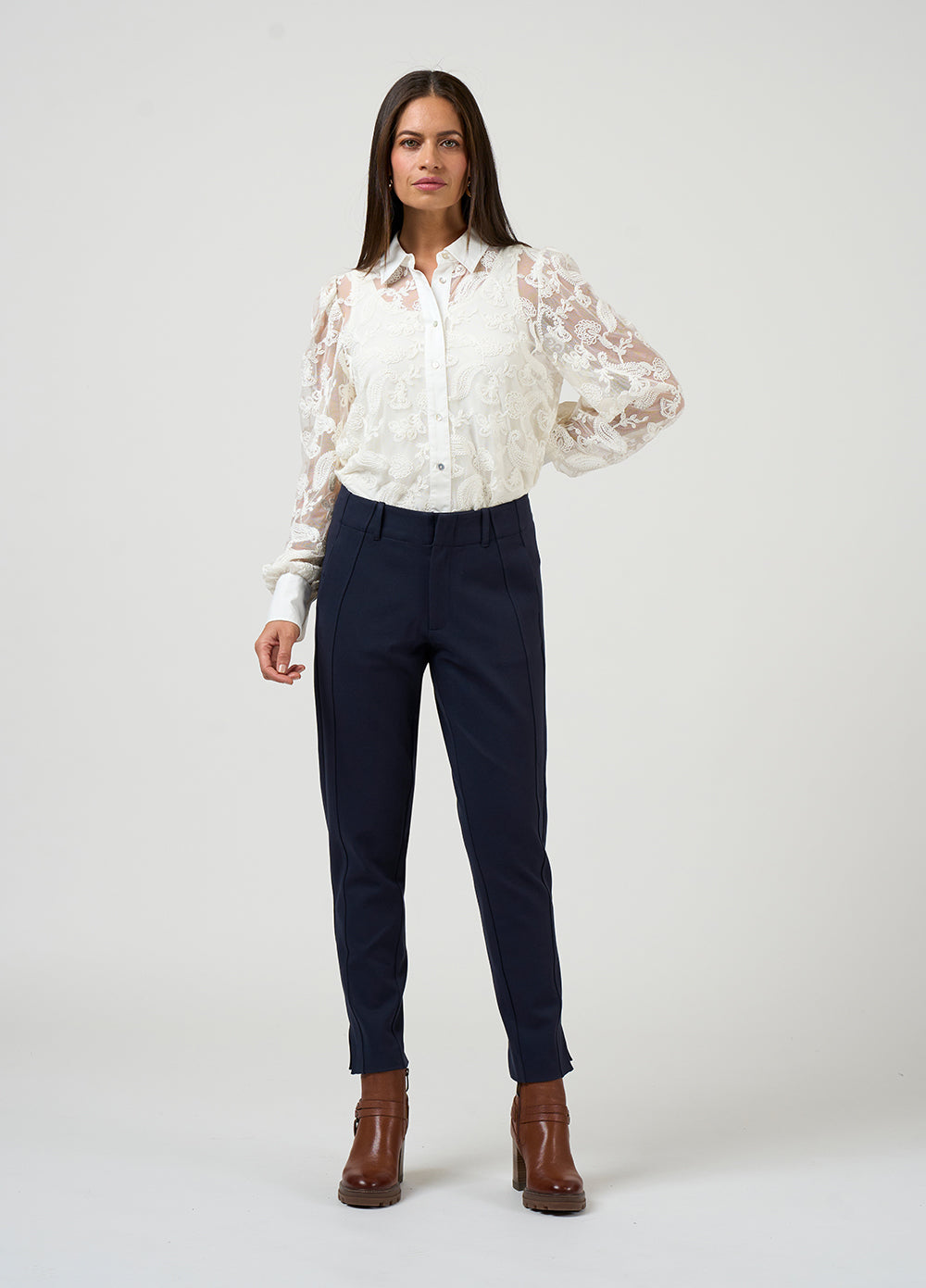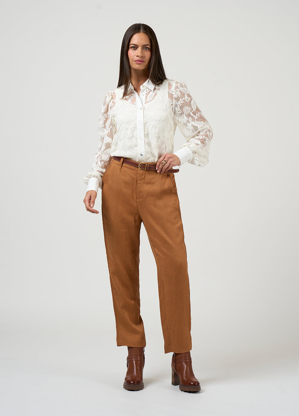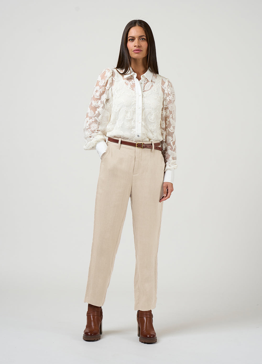 The Loobie’s Story Filigree Shirt is a beautifully detailed piece that brings texture and refinement into everyday dressing. This women’s embroidered shirt is crafted in delicate tulle, finished with intricate embroidery that creates depth while still feeling light and wearable. A crisp cotton sateen collar, button-through front, and deep cuffs add structure and polish, balancing the softness of the sheer overlay. The embroidery is thoughtfully placed to fall just short of the hem, forming a subtle border that adds interest without overwhelming the silhouette. Layered over its matching cami, it offers coverage with a soft, fluid feel against the body. Styled with tailoring or denim, this is a piece that moves easily between day and evening with a quiet sense of statement.