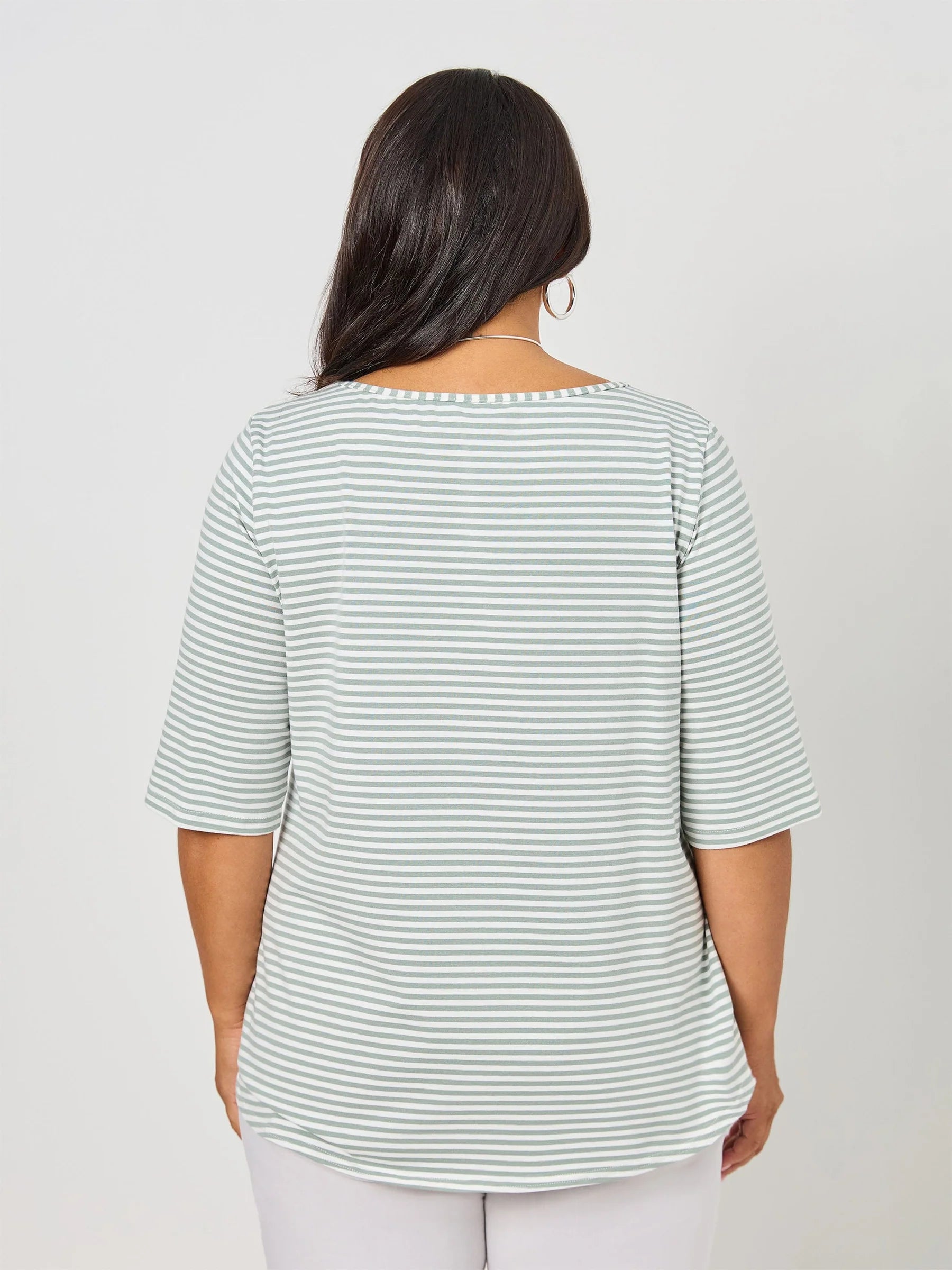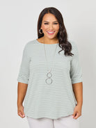 The Famous Striped Tee by Swish combines everyday comfort with an easy, polished feel. The soft sage khaki stripe adds a gentle pop of colour, while the A-line shape and stretch cotton blend give all-day ease and movement. Designed with mid-forearm sleeves and a scooped neckline, it’s a versatile piece you can style with white Bengaline pants or cotton sateen pants for a crisp, summery look.