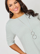 Features: Mid-forearm length sleeves, scooped neck and hemline, soft sage khaki stripe, quality stretch fabric