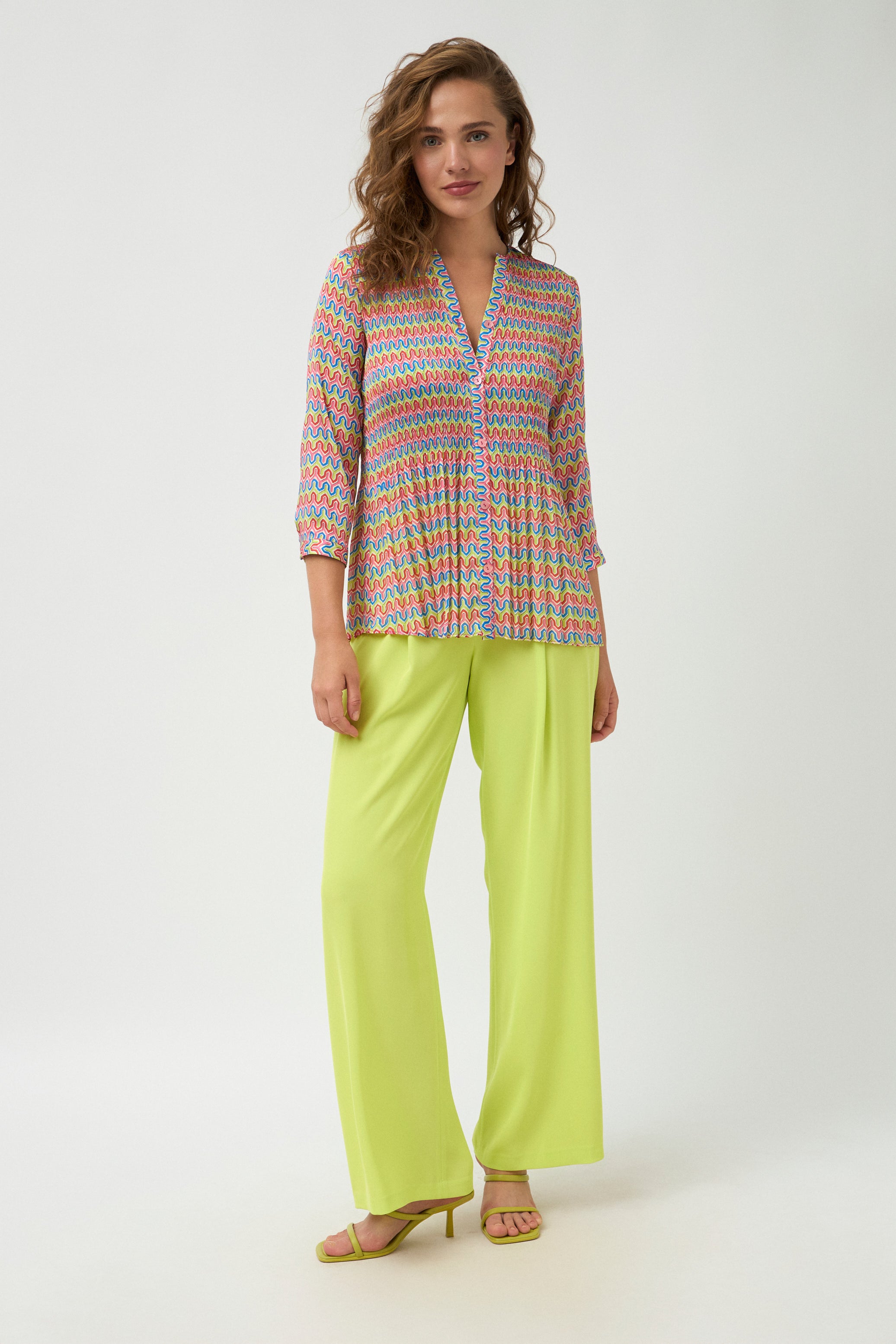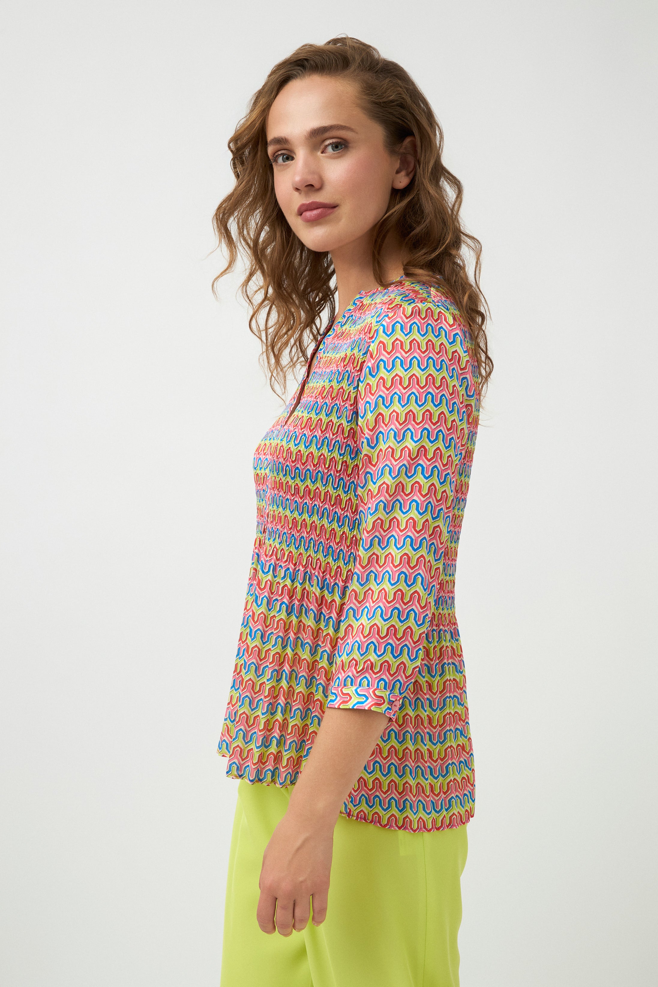 Bursting with personality, the Tinta & Bariloche Olivia V Neck Shirt is all about playful colour and contemporary charm. Featuring a vibrant geometric print, this eye-catching style brings instant energy to any outfit. Thoughtfully cut with gentle gathers through the waist and finished with smart button detailing, it’s a piece that feels both fun and polished. Pair it with tailored pants or jeans for an effortlessly upbeat look that captures the spirit of Spanish design.