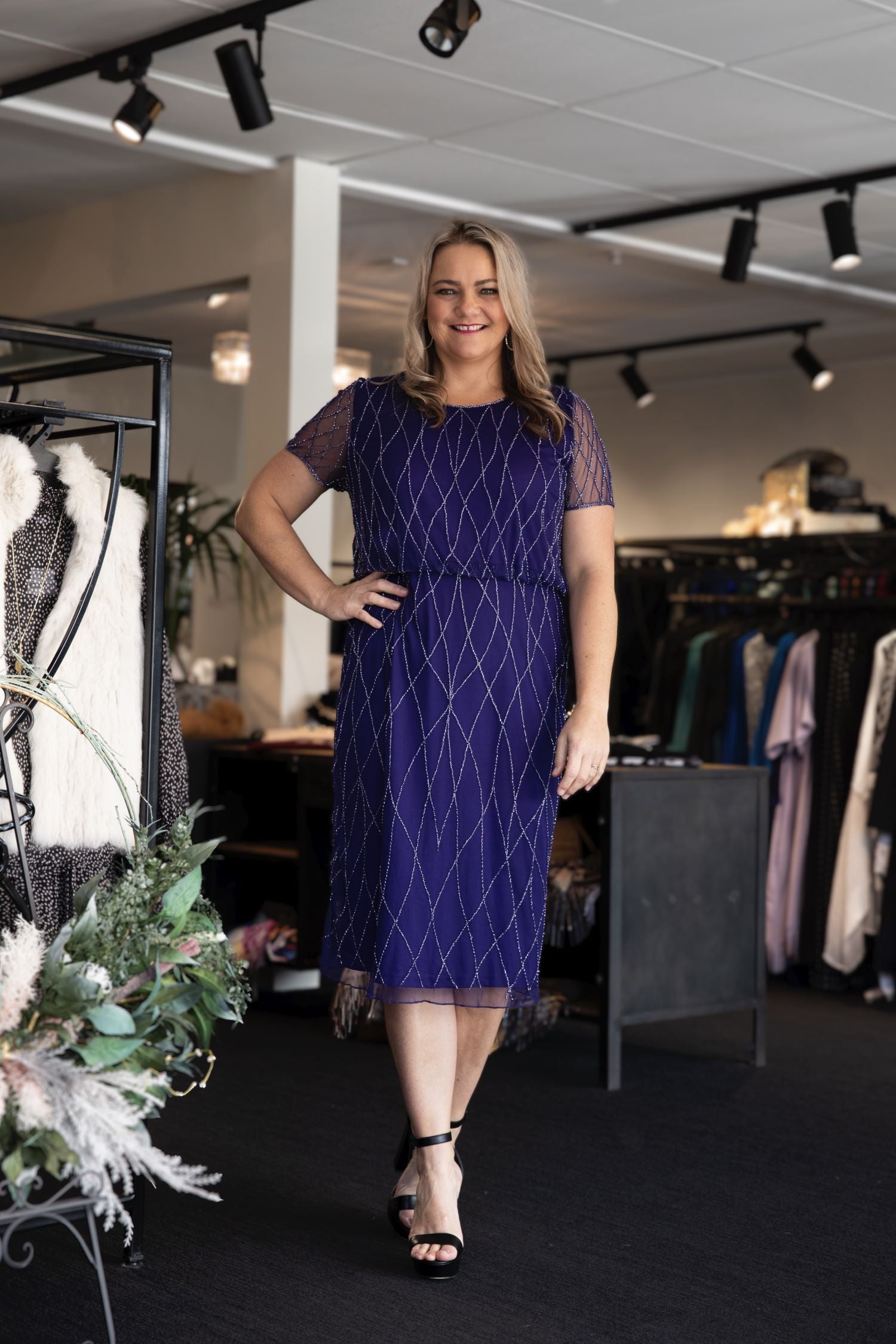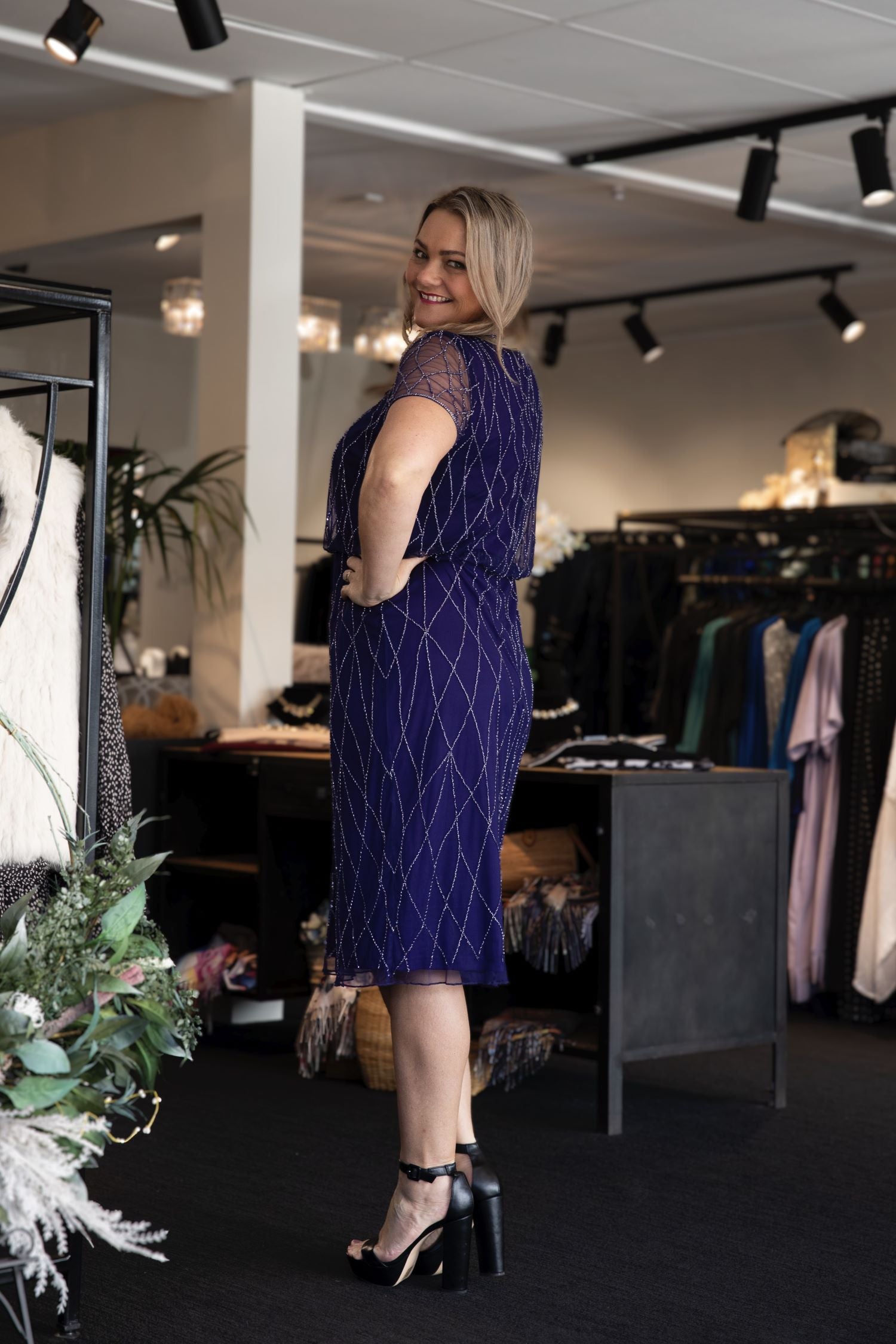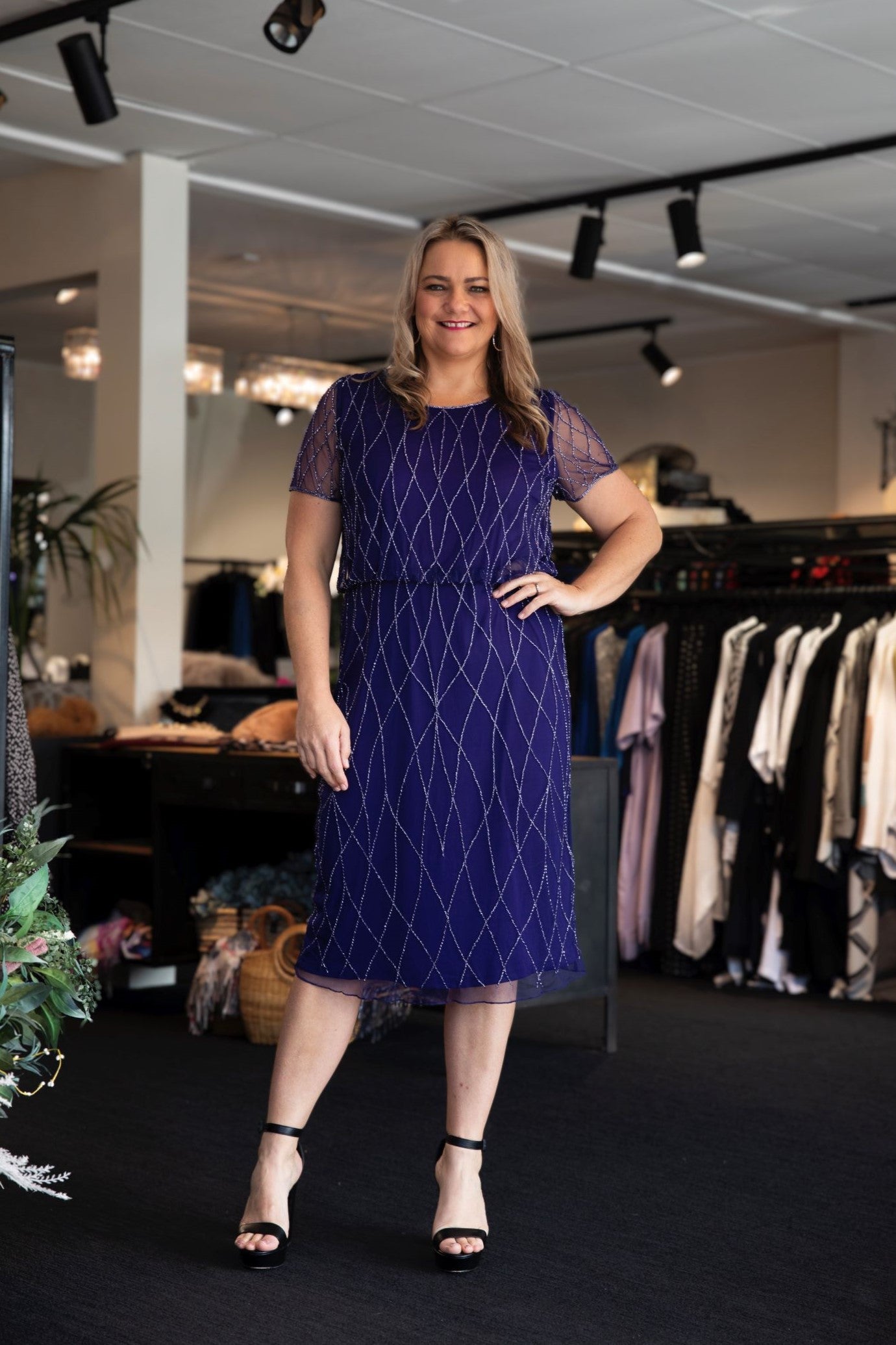 Stunning for your next special event, the Beaded Waist Dress by Jesse Harper is a sophisticated showstopper! Beautifully crafted with silver beads arranged in an Art Deco geometric design, this fully lined style features a gently blousoned waist, creating softness over the hips and tummy. This is one and done event dressing at its very best!