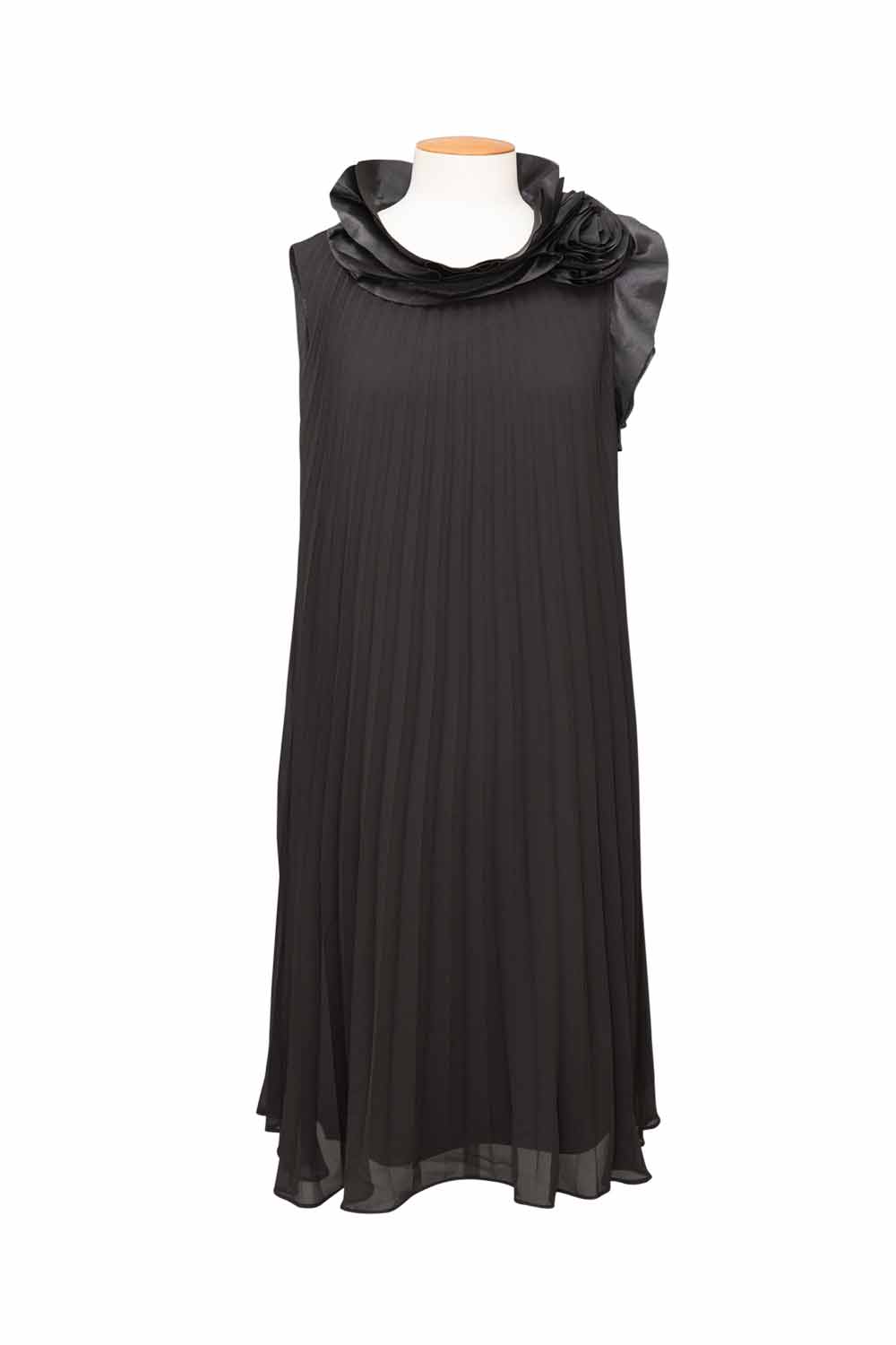 Simply stunning, Joseph Ribkoff's Petal Dress is the perfect way to make a grand entrance at your next big event! Strikingly cut in pleated chiffon, this fully lined swing style dress finishes just below the knee. However its the frill satin finished with petal detail at the neck that really sets this style apart. Wear on its own, or layer over a mesh tee to cover the arms.