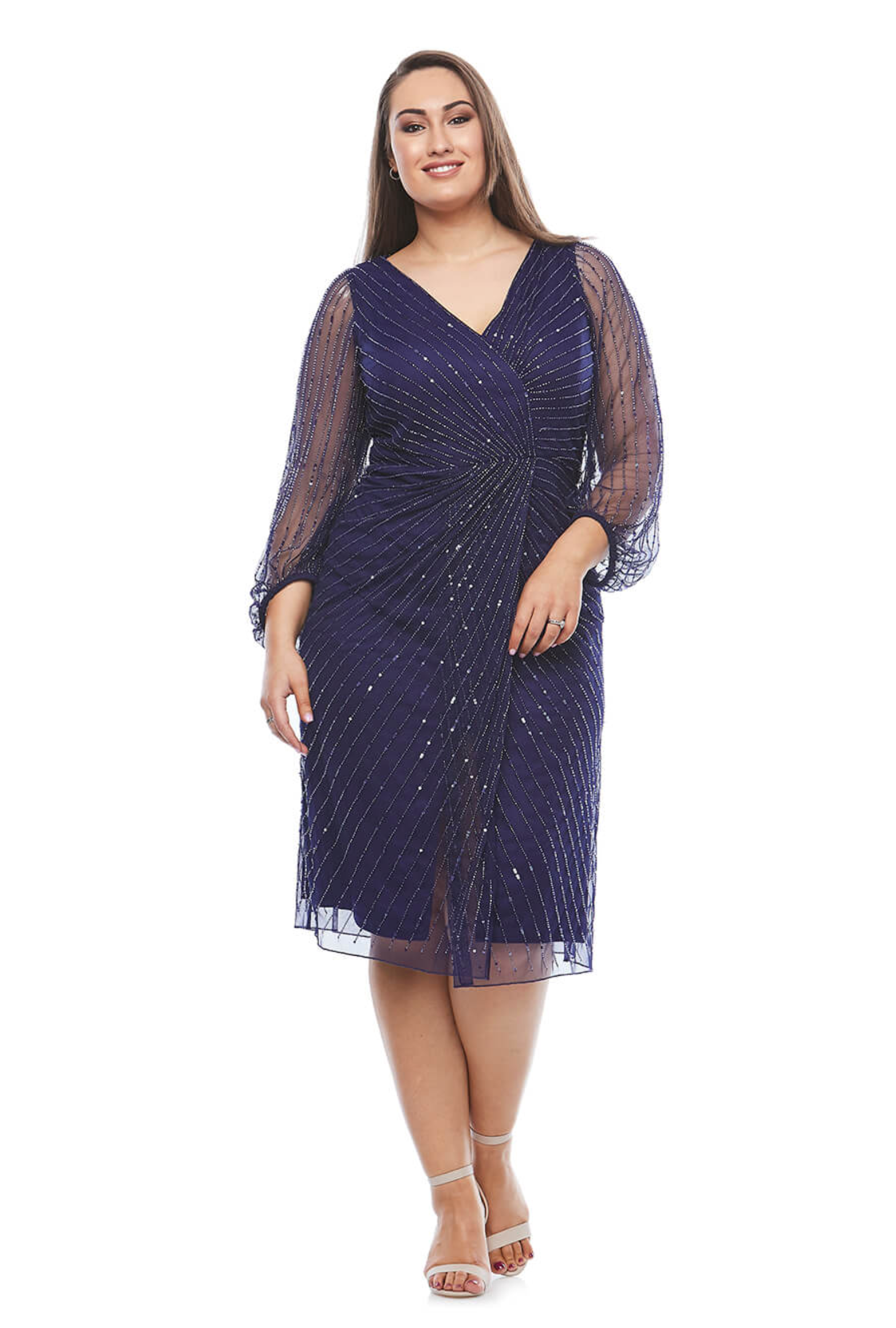You're sure to turn heads in this Beaded Cross Over Dress from Layla Jones. Offered in the regal Majesty colourway, this crossover dress is designed to showcase your silhouette to best effect. There are so many features on offer here - including the deep vee neck, the faux wrap design and the soft balloon sleeve, all combined with a stretch lining front and back for added comfort and ease of fit.