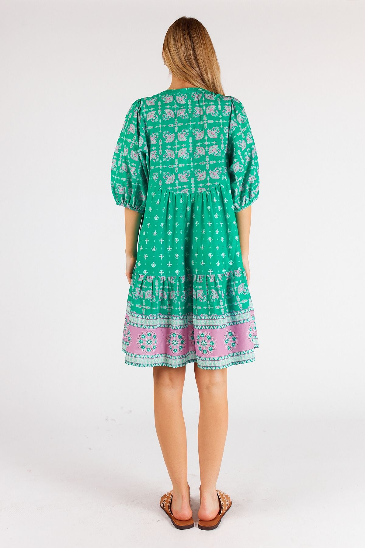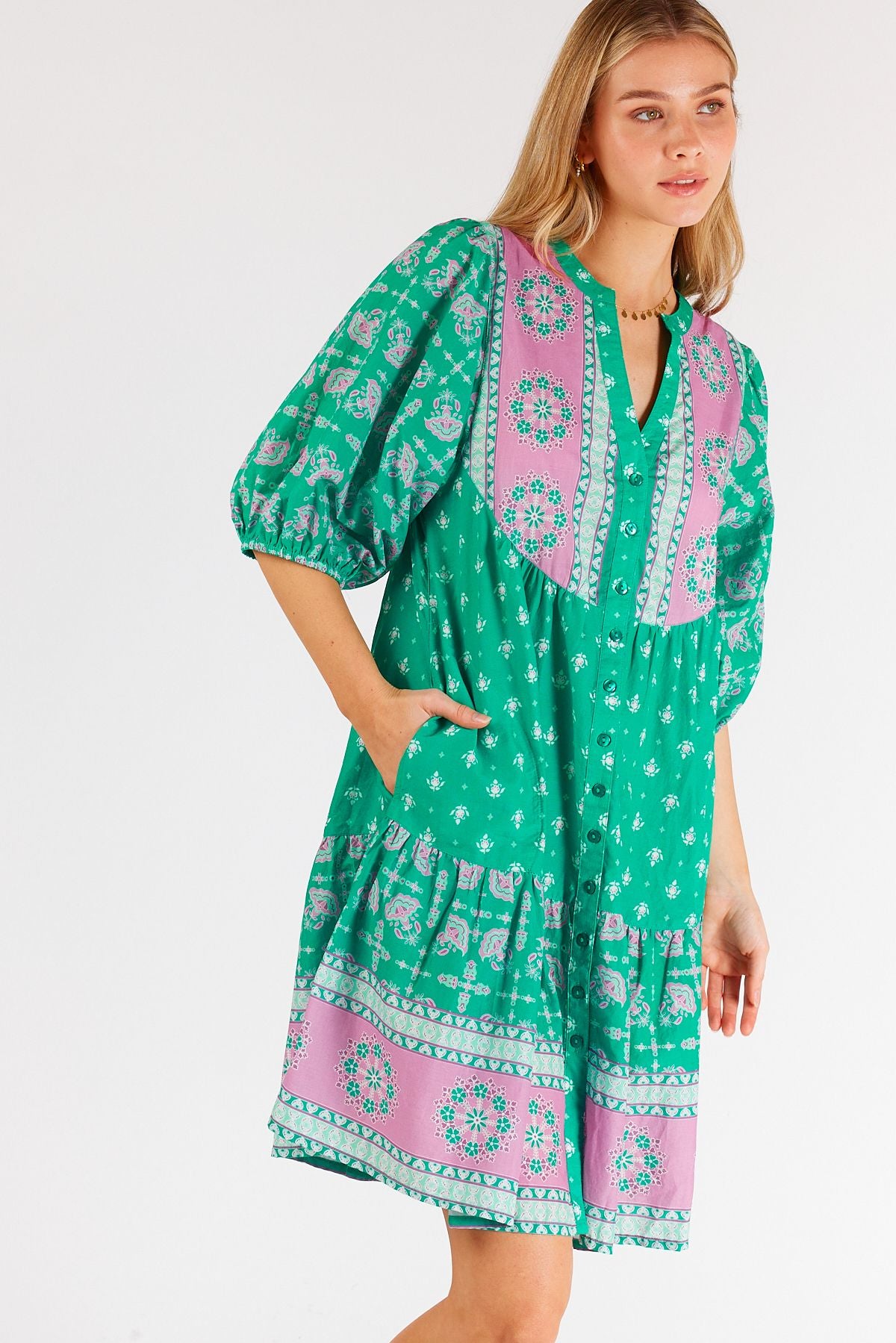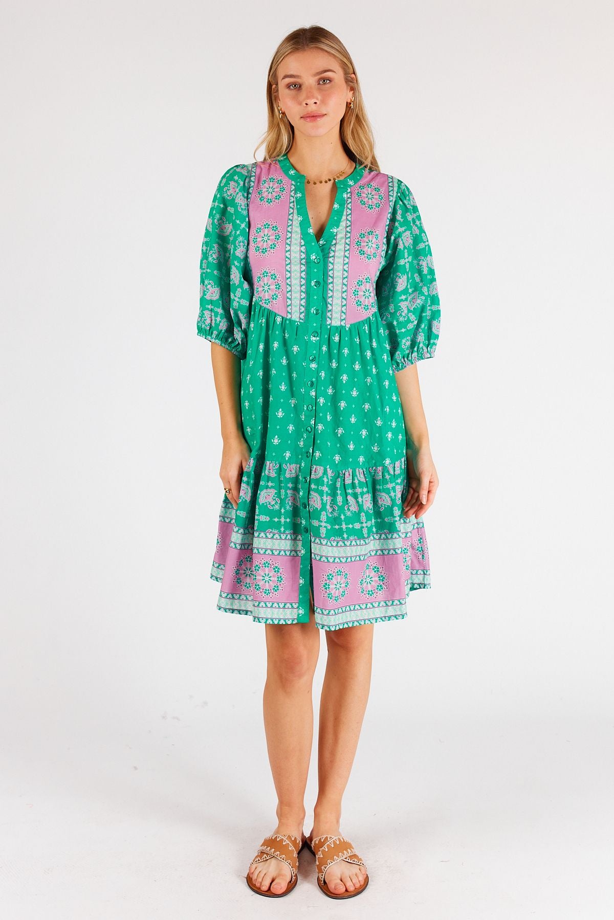 Get set for balmy summer day in the Lula Life Scarlet Dress! This style features a patchwork boho inspired print in a lovely ocean and pink colourway. With a relaxed button-through fit, and slightly blouson sleeve - this piece is a dream to wear!