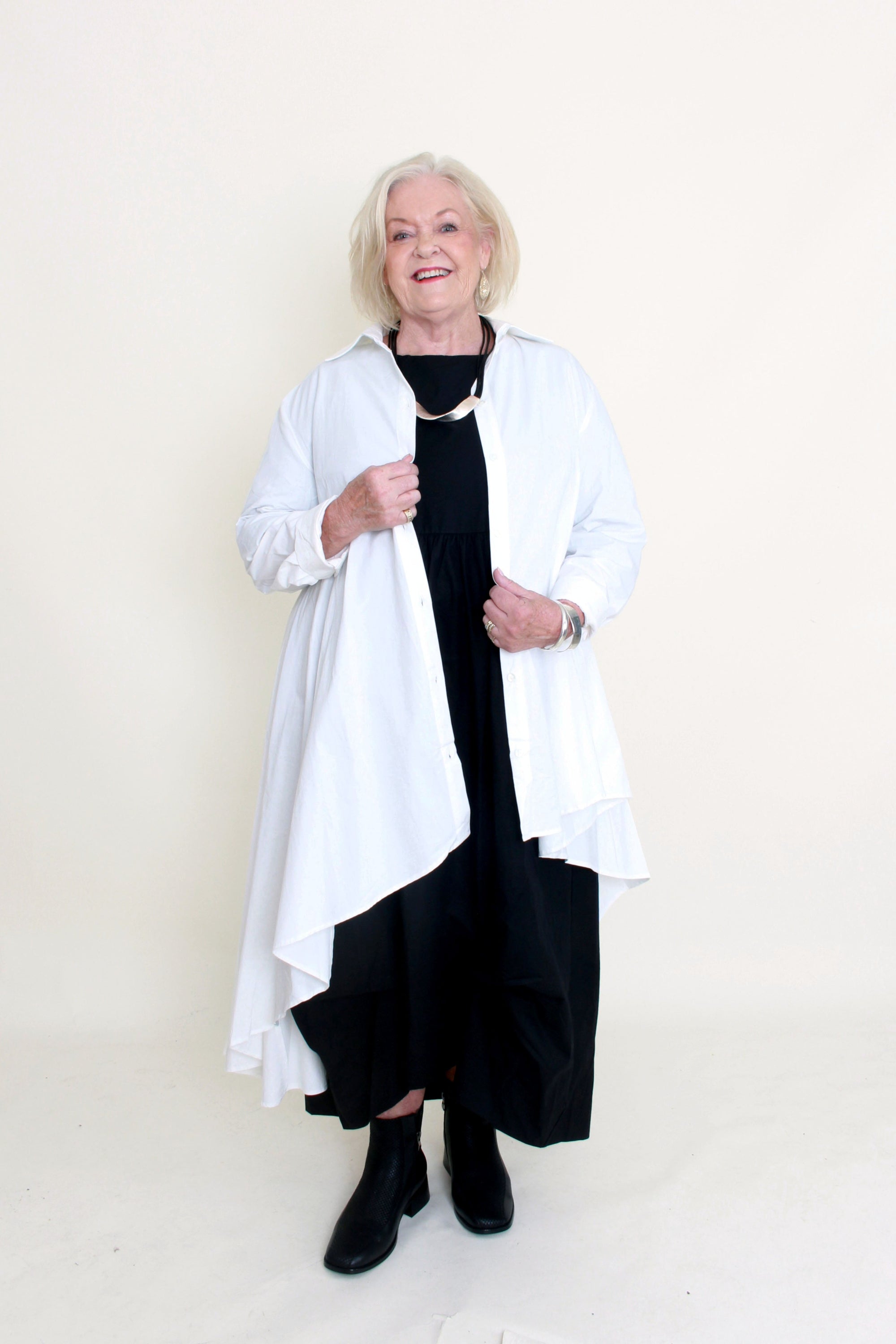 The London Shirt from Magazine is is a bold twist on the classic button-up. This exclusive style takes classic to iconic with a bold waterfall high-low hem that brings all the drama. Crisp, clean and designed to move with you! Wear it open as a statement layer over all-black, or buttoned up with your go-to pants or jeans. A true fashion-forward essential with endless styling possibilities.