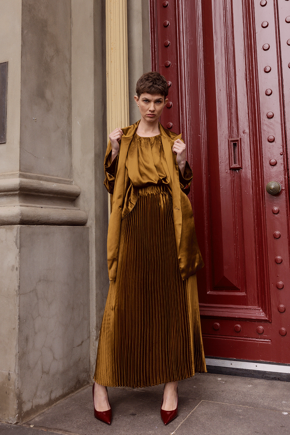 Elegant and effortless Maud Dainty’s Extension Pleat Skirt is cut in a striking acetate fabrication. This style features a fully elasticated waist for comfort and ease of fit, before finishing the just above the ankle. We love this teamed Maud Dainty’s Caul Cap Top.