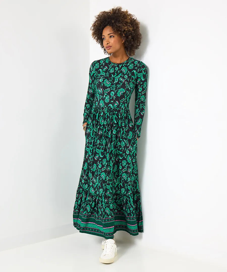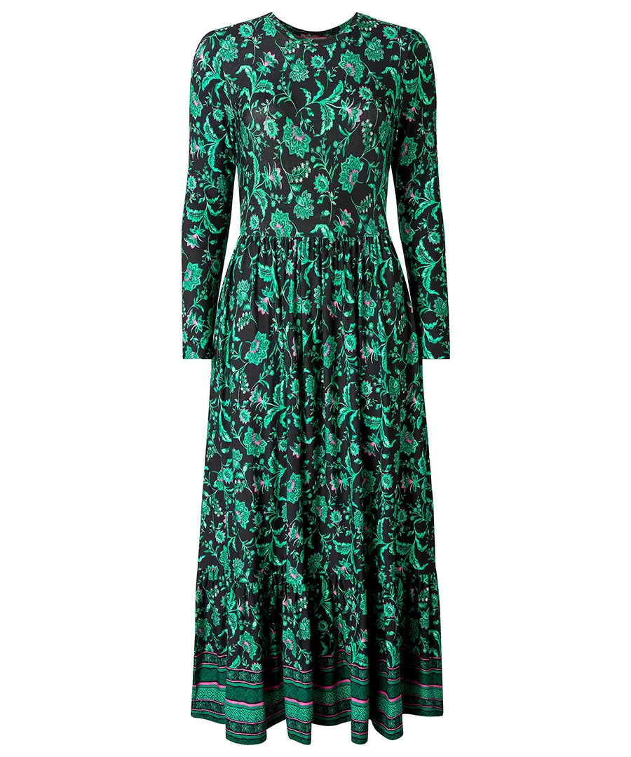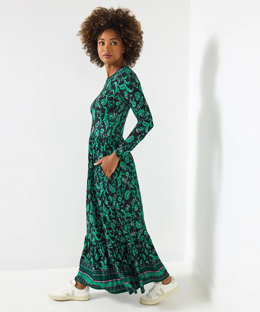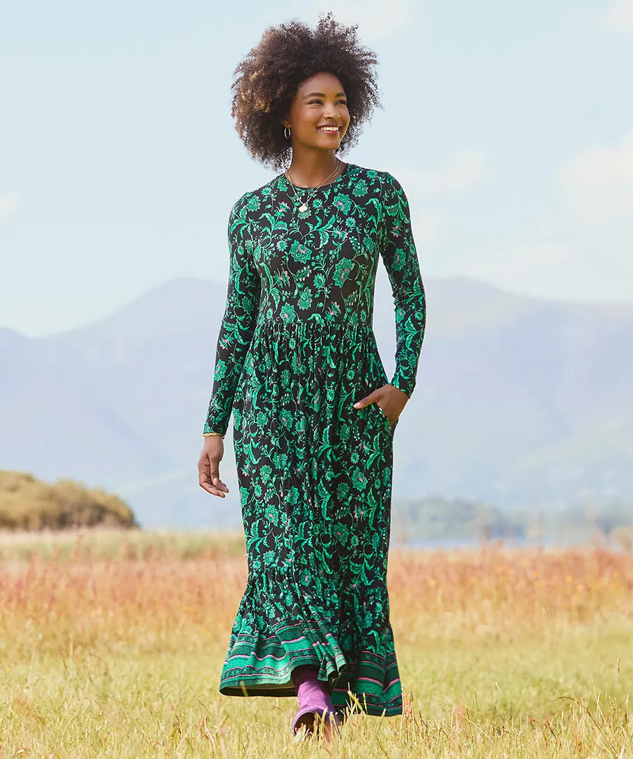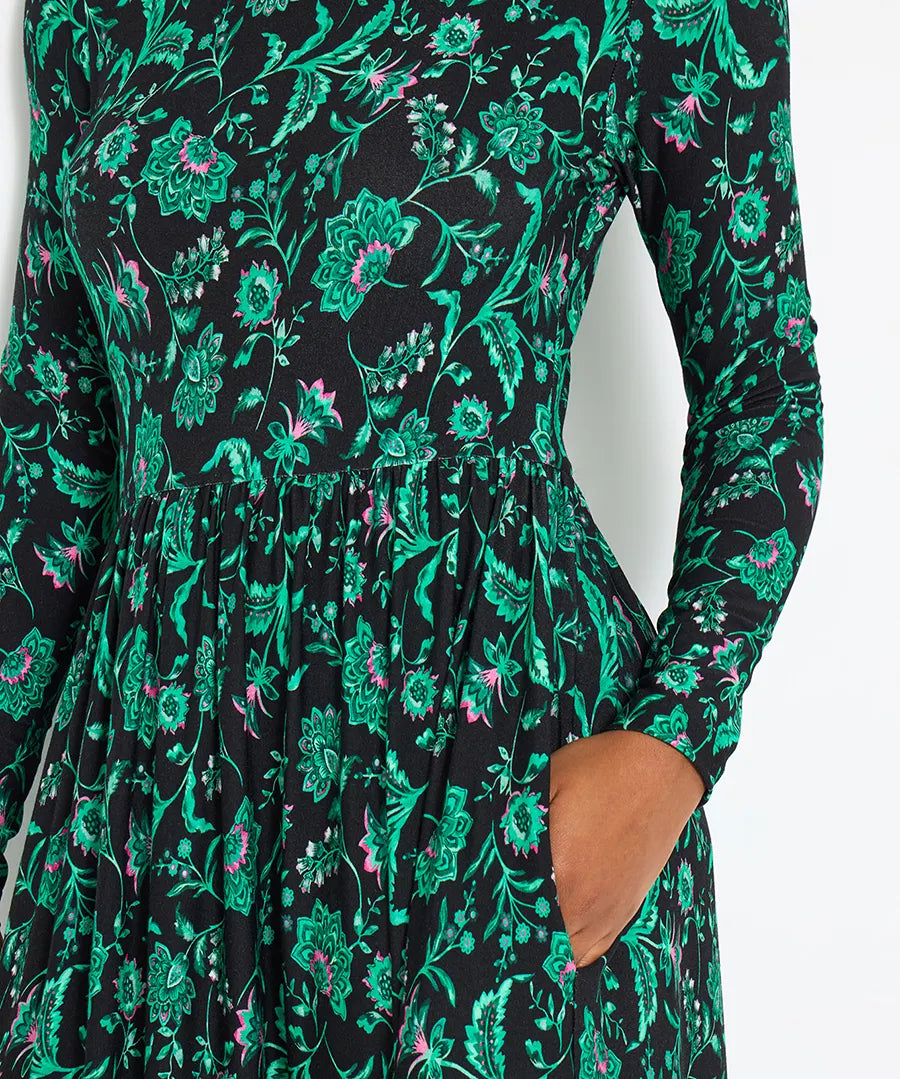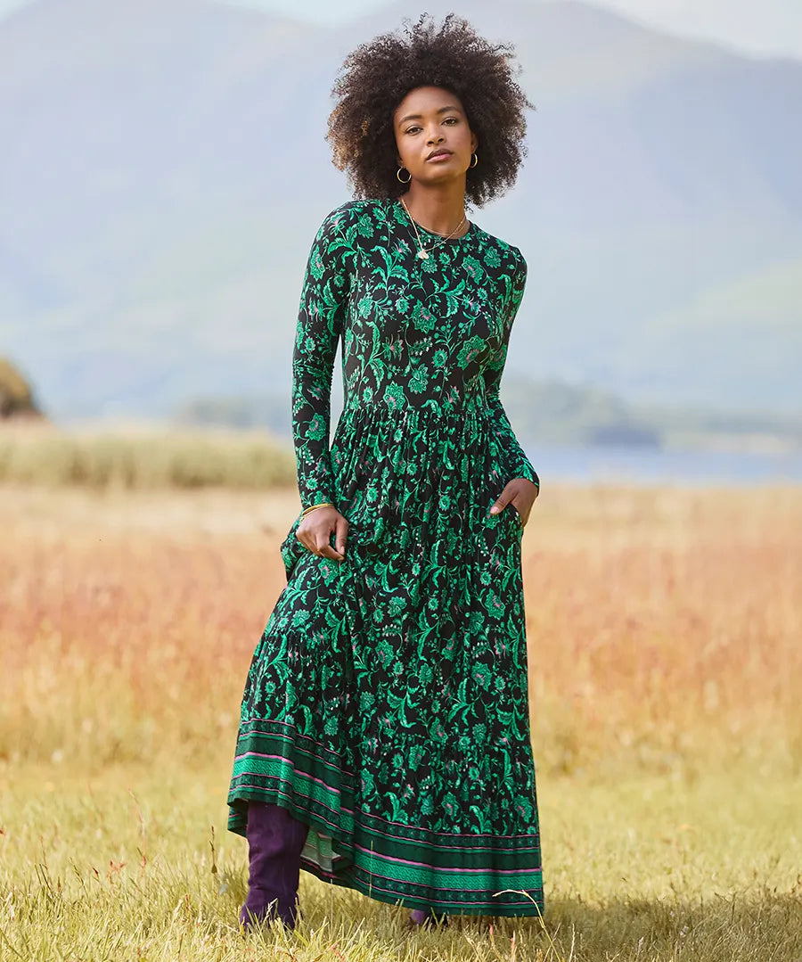 The Joe Browns Bella dress is a standout long sleeve boho dress designed to bring colour and movement into your wardrobe. Set against a black base, rich green tones and a striking border print create a look that feels both expressive and easy to wear.