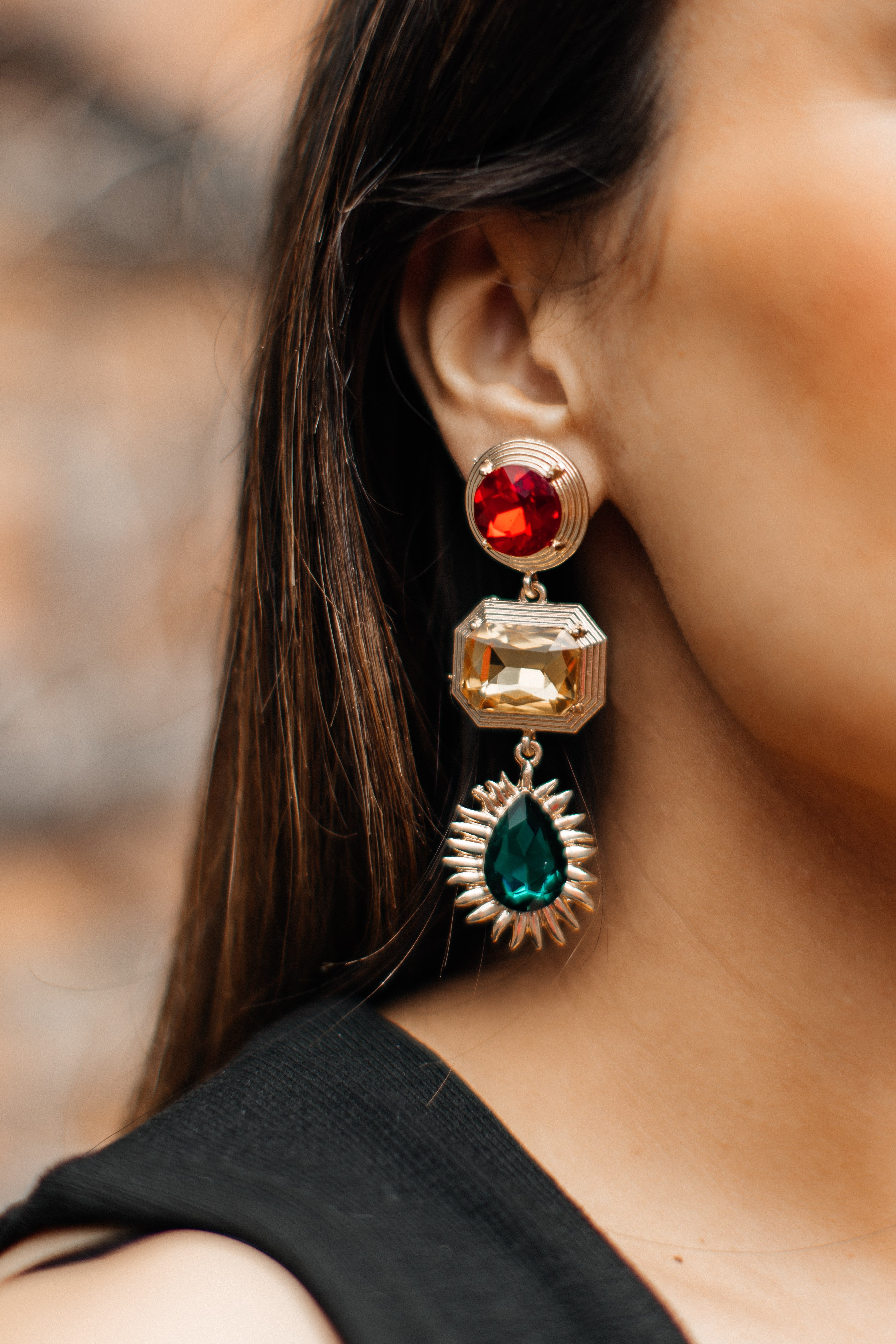 The Tilly Drop Earrings from Me The Label feature 3 colourful gems, making this a stand out pair for any occasion!