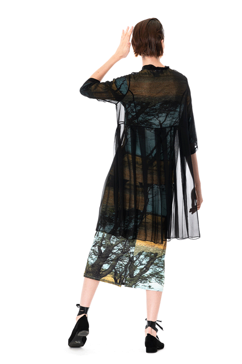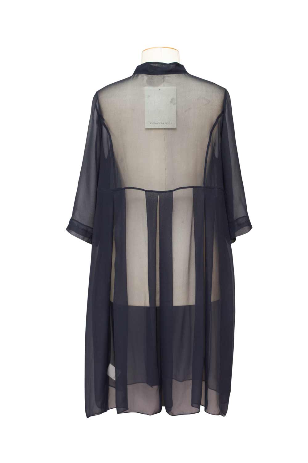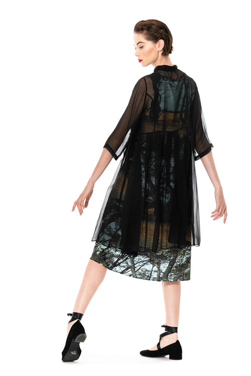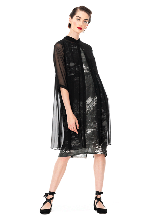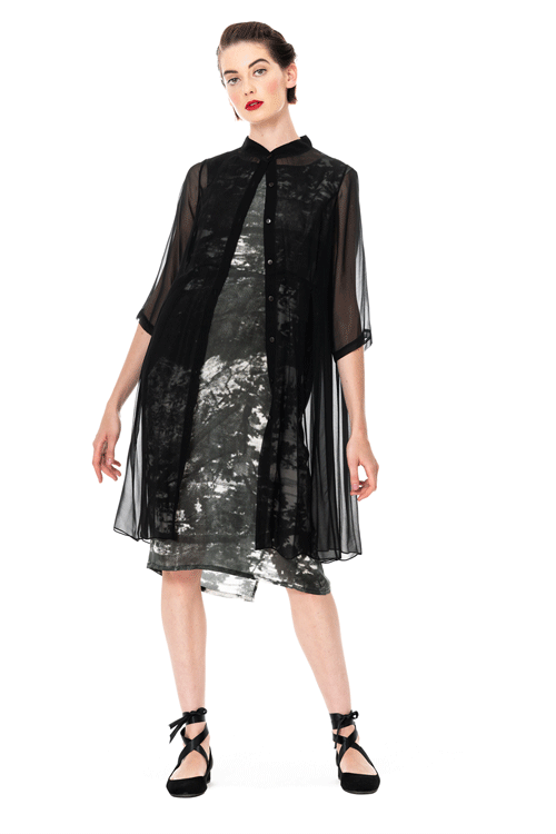 Crafted from a light and lovely silk georgette, this Georgette Monastic Coat by Megan Salmon, offers the most gorgeous fit. Contoured through the bust, inverted pleats through the waist to ease over the hip and tummy. Offered in Indigo and Black, this mandarin collar can be worn fastened as a longline shirt or open as a glamorous sleeve cover.