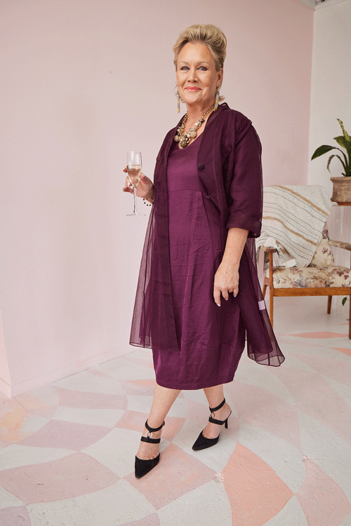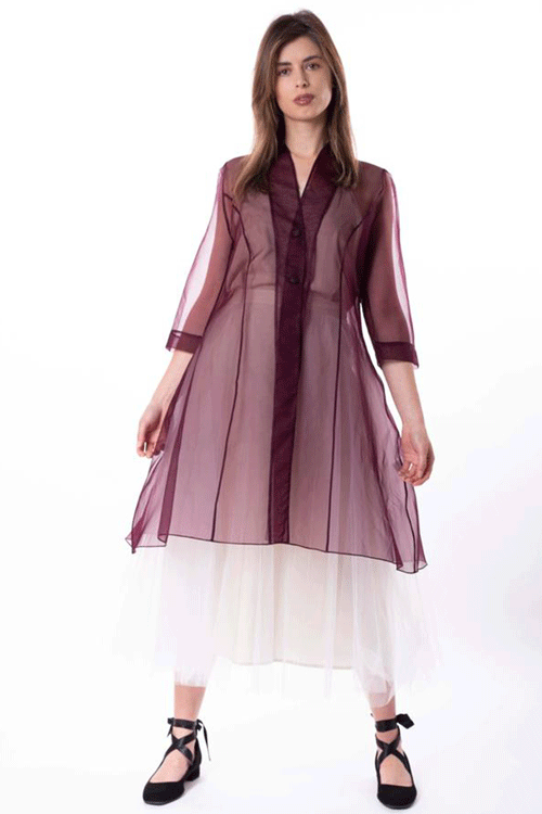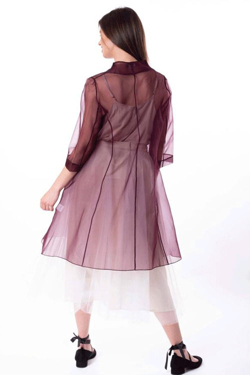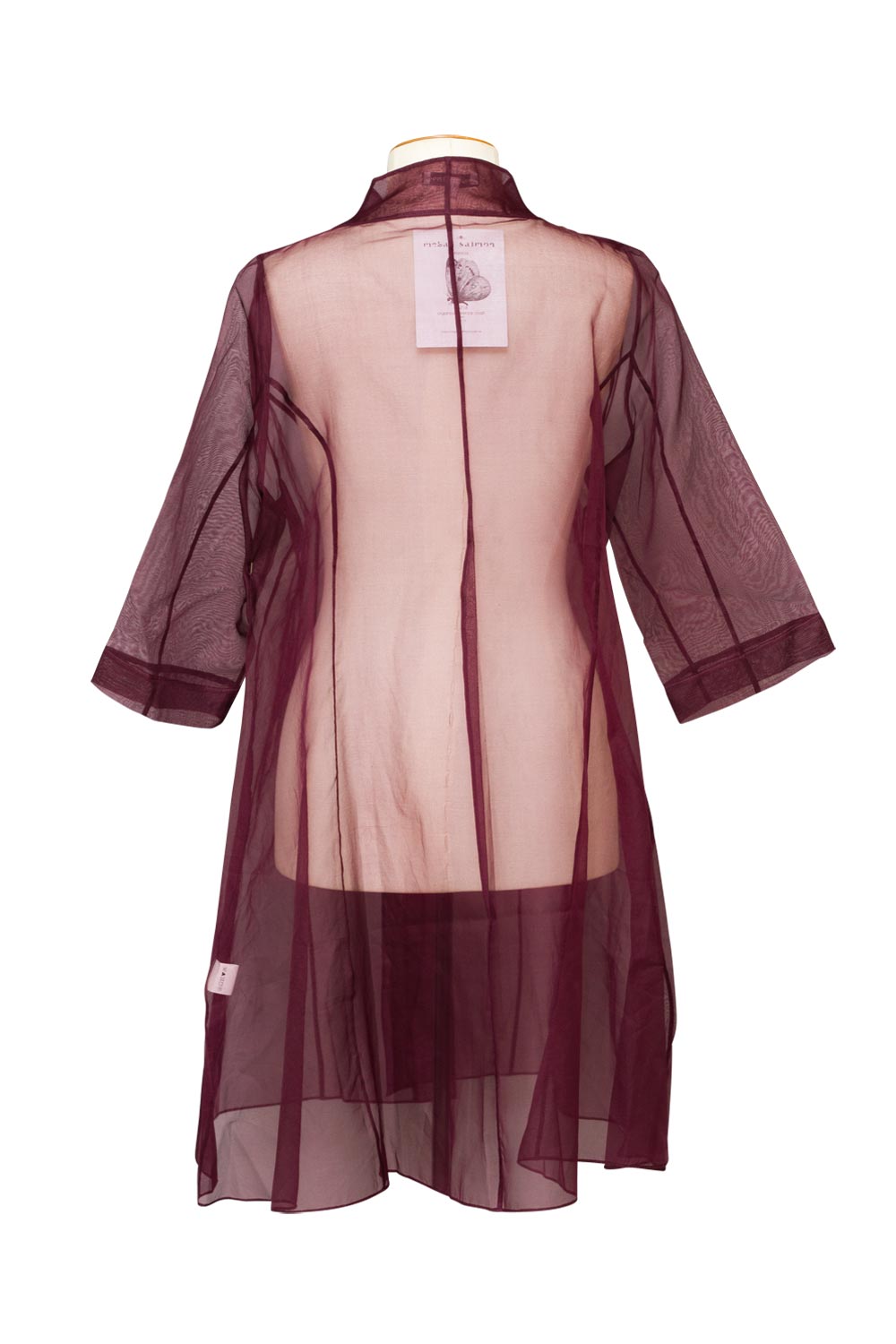 An elegant, classic style from Megan Salmon, the Organza Florence Coat is a beautiful choice for dressing up an outfit to go somewhere special. The coat has princess lines so is super flattering. It features a low vee neck and a high collar at the back neck. Try wearing it over a slip so it looks like a dress! It has self-covered buttons and is exquisitely finished with french seaming.